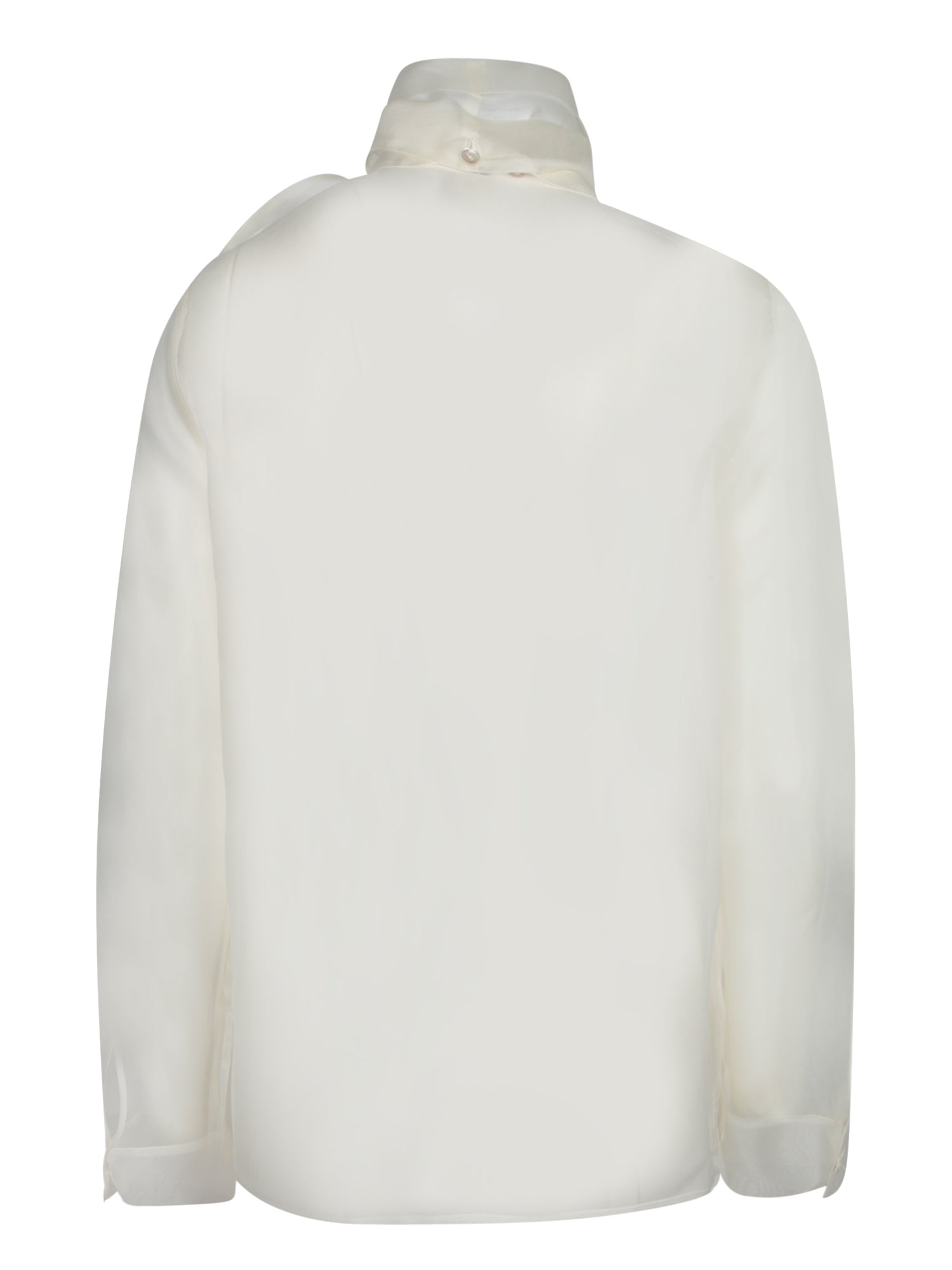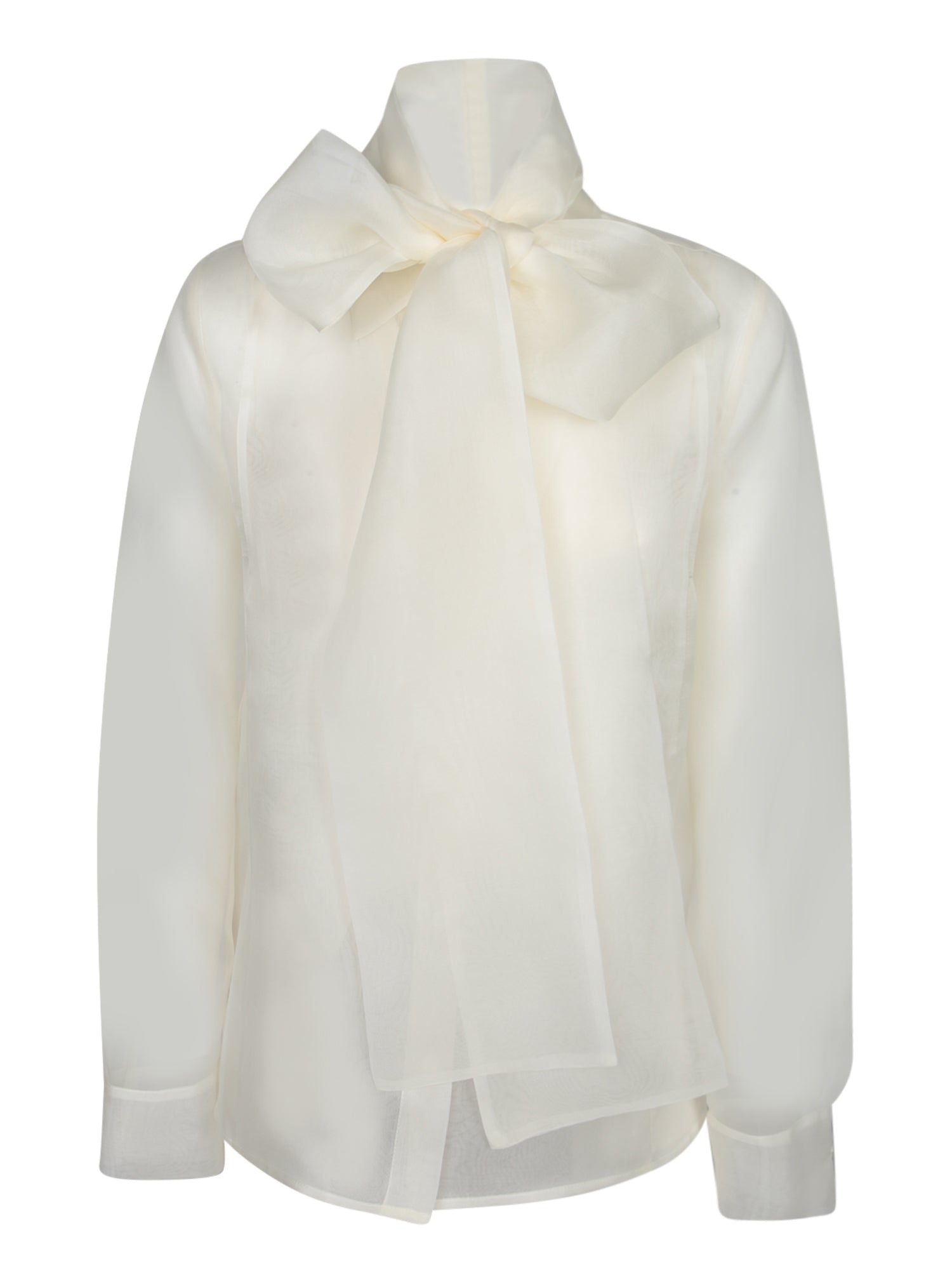 Long sleeves, voluminous bow at the back, translucent fabric.