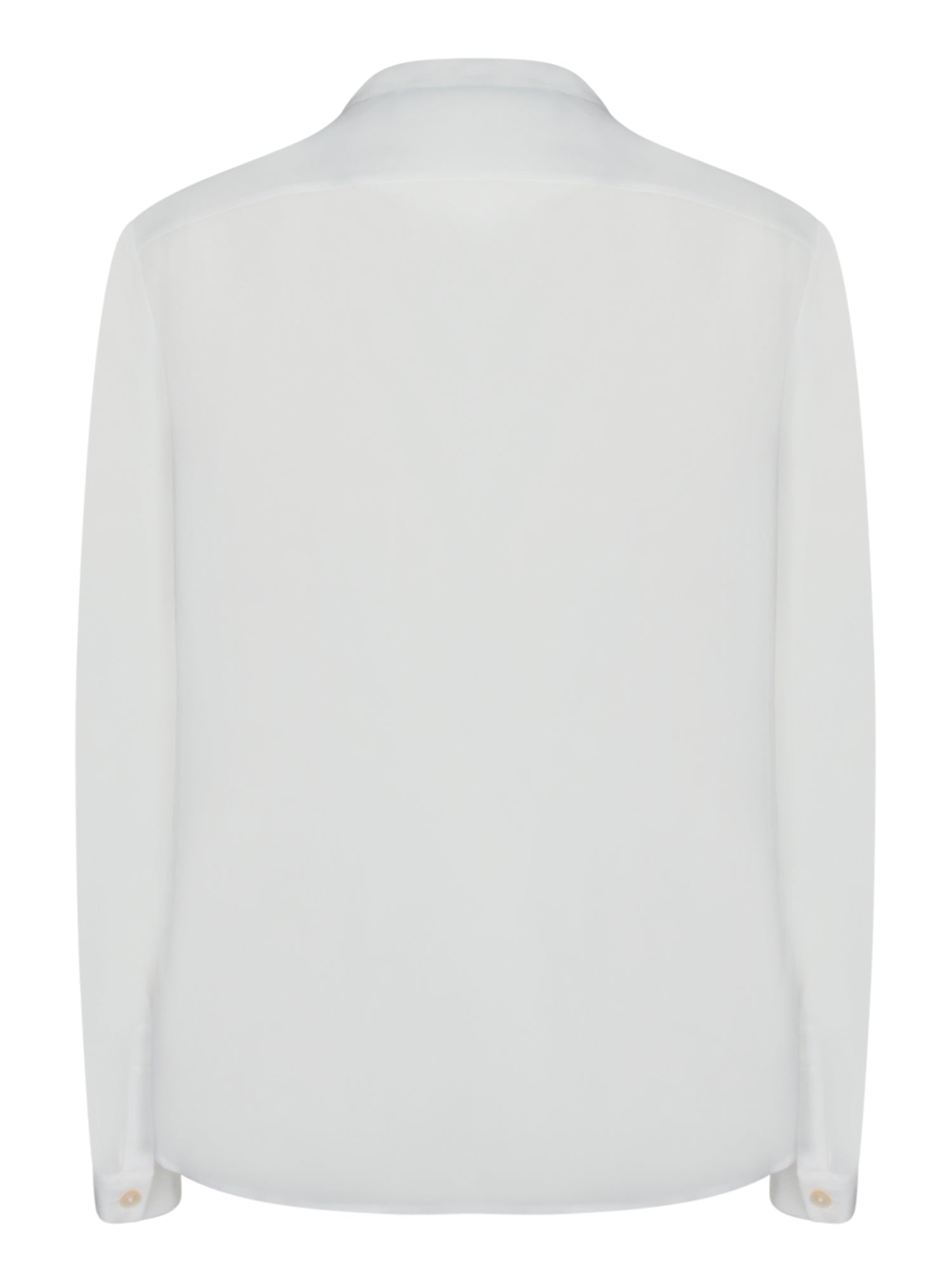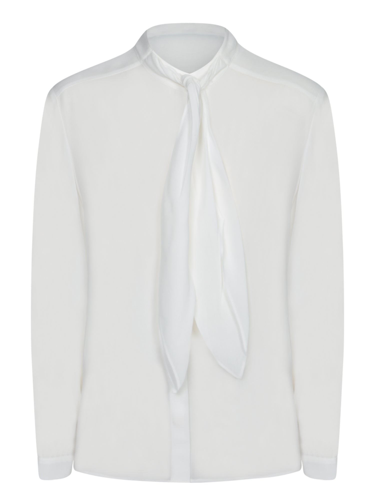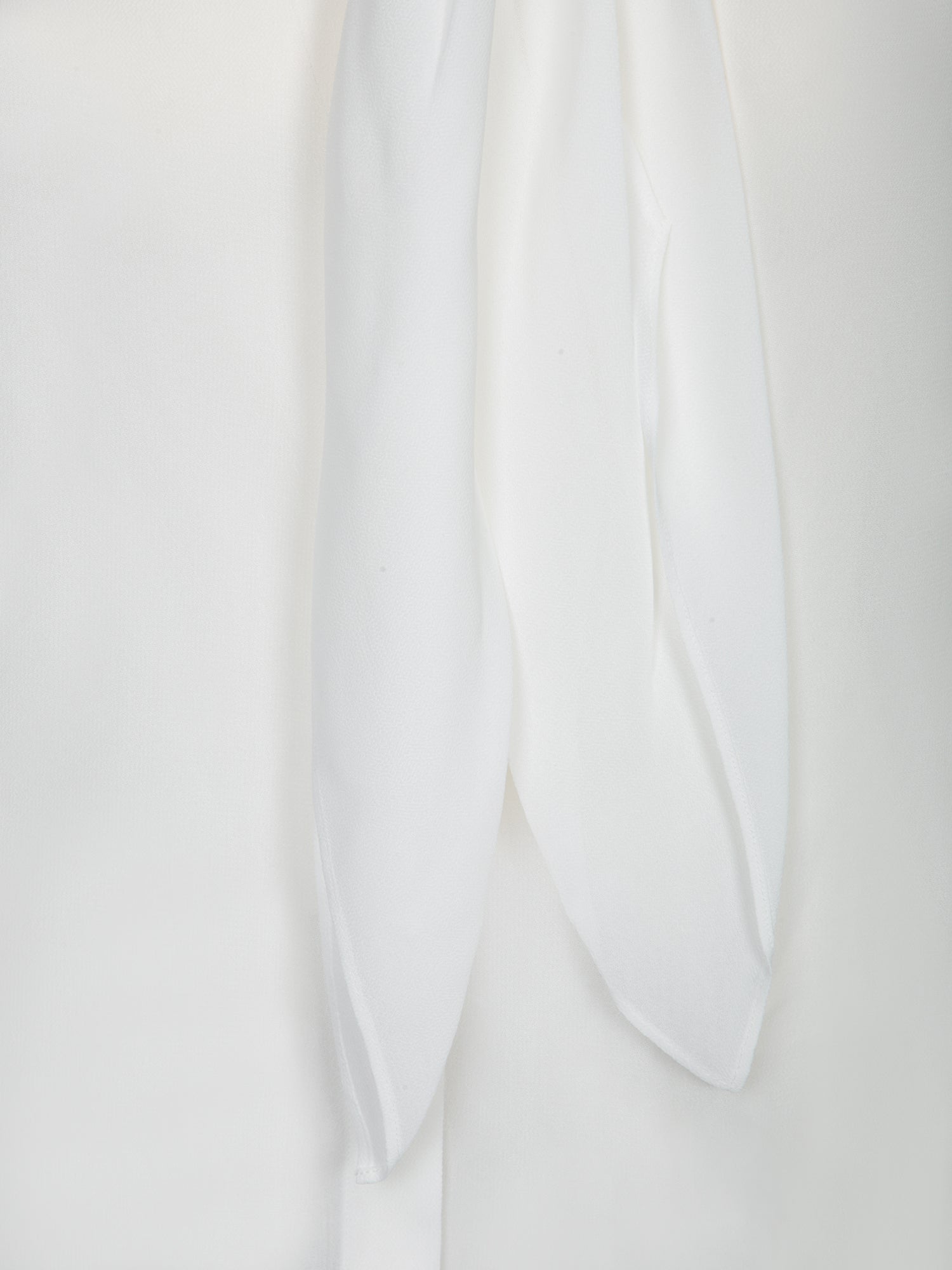 Long sleeve blouse with neck bow detail. Buttoned cuffs. Back button closure.