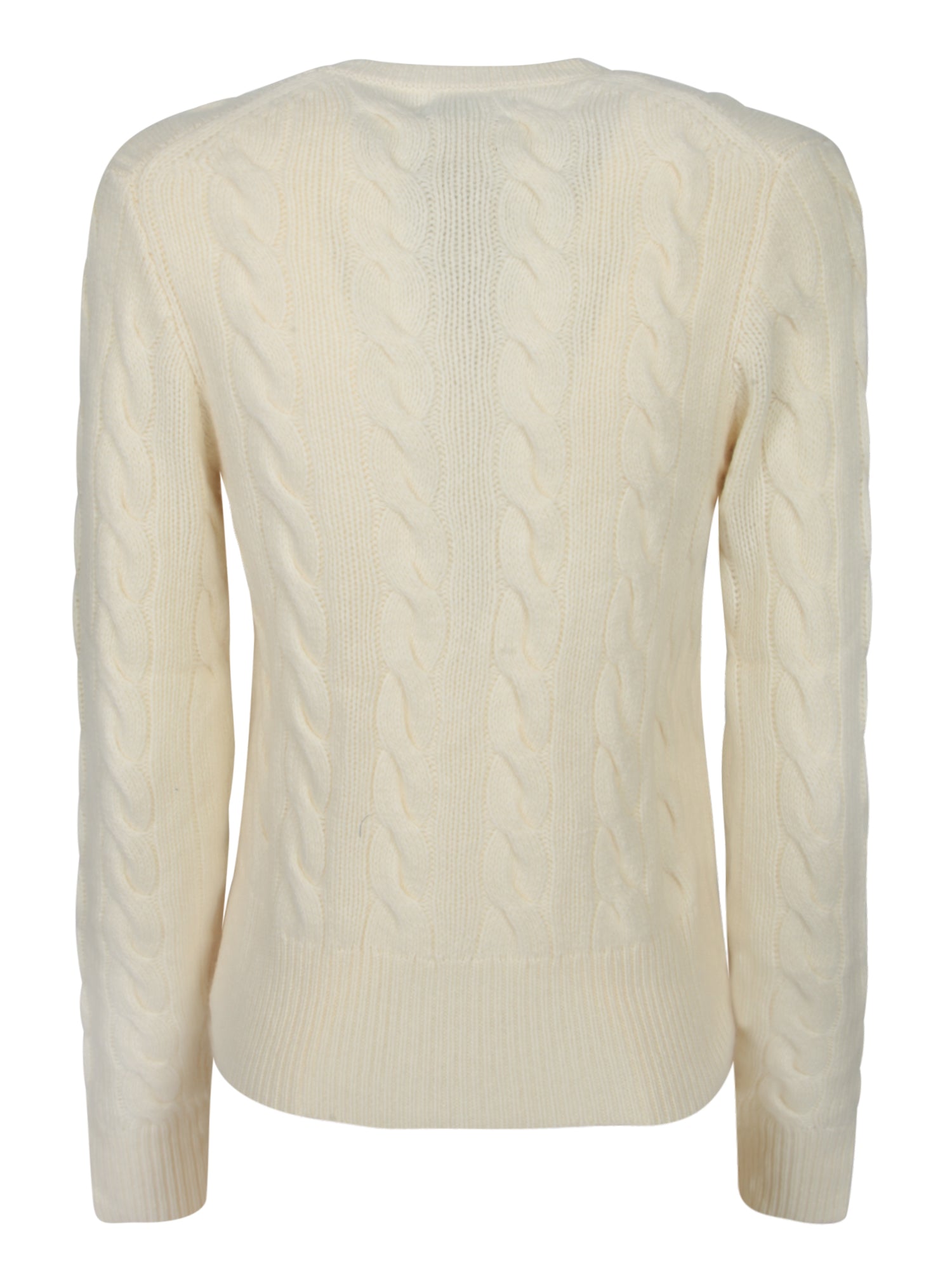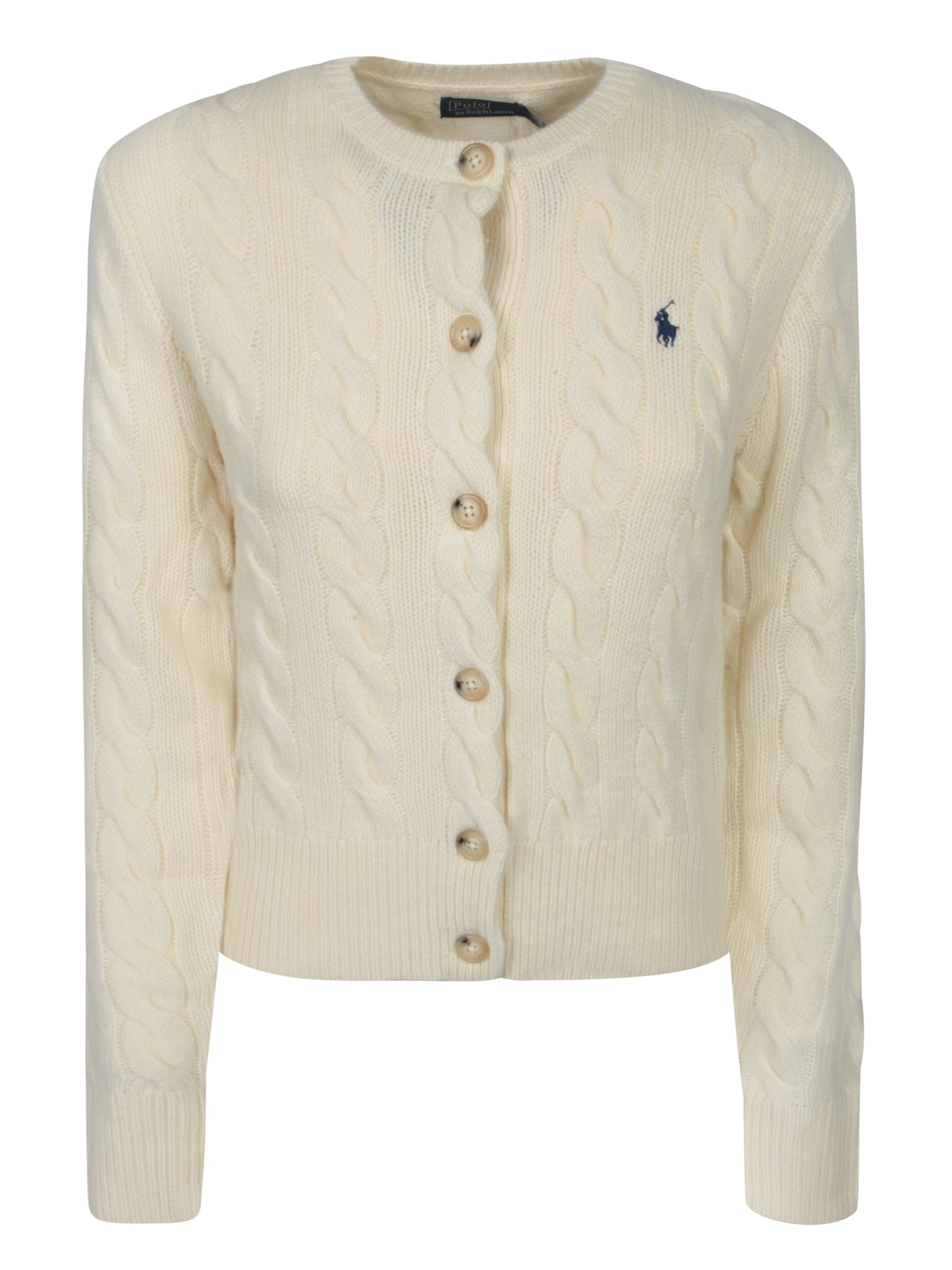 Wool and cashmere knit cardigan. Features button closure and an embroidered logo on the chest.