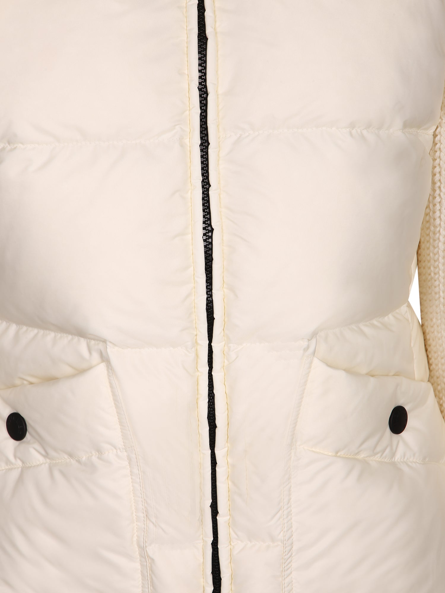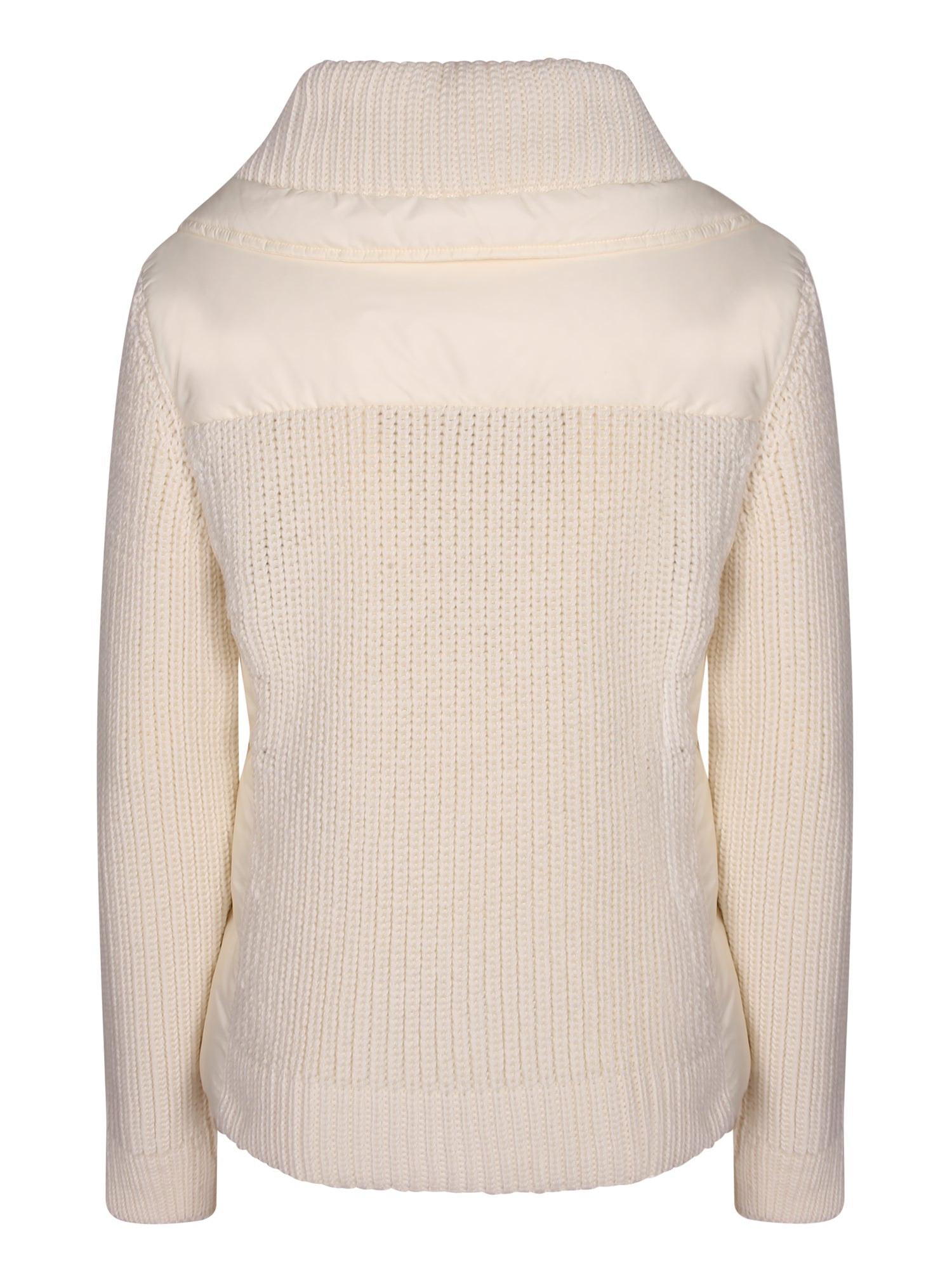 Padded cardigan with full-length zipper. Knitted sleeves and buttoned pocket details.