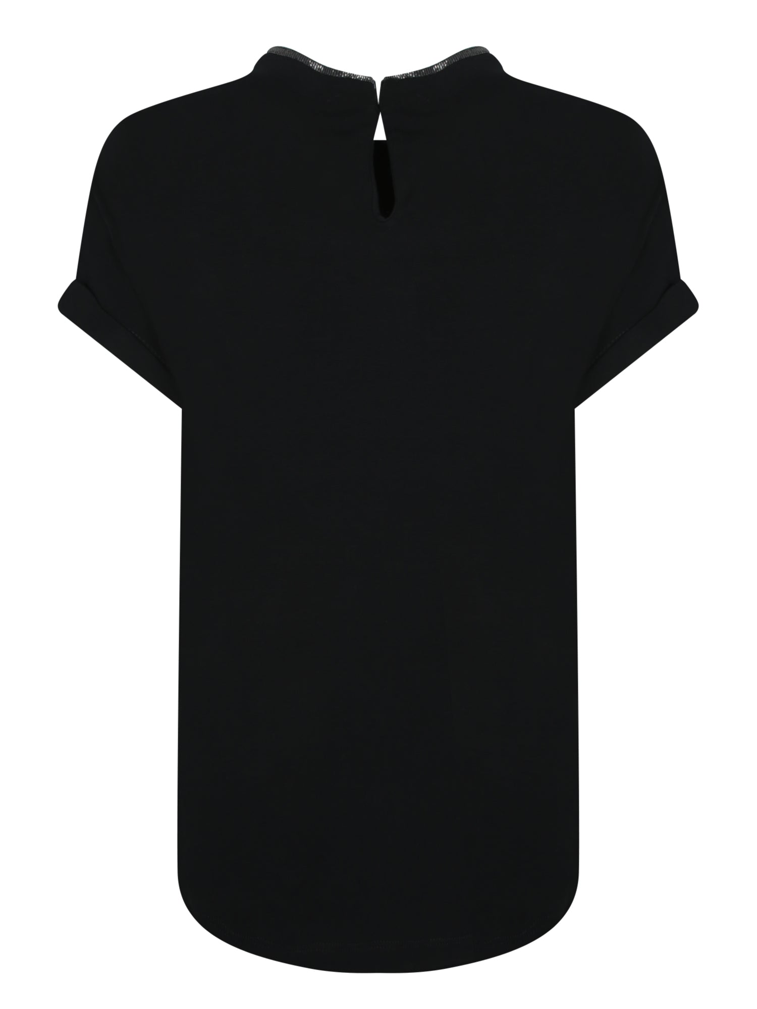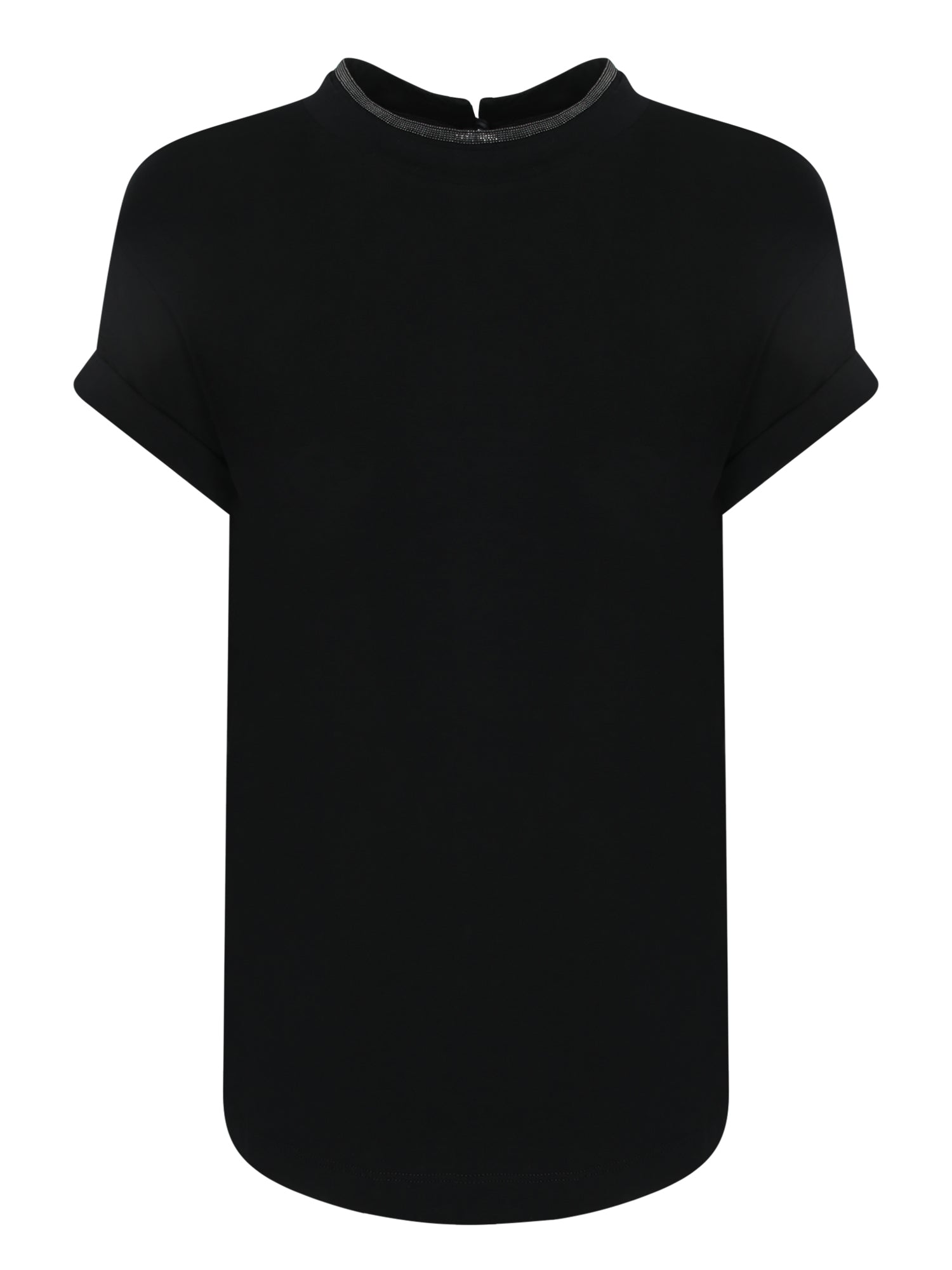 Exclusive black cotton T-shirt, embellished with an elegant contrasting neckline trim, perfect for a minimalist yet sophisticated look.