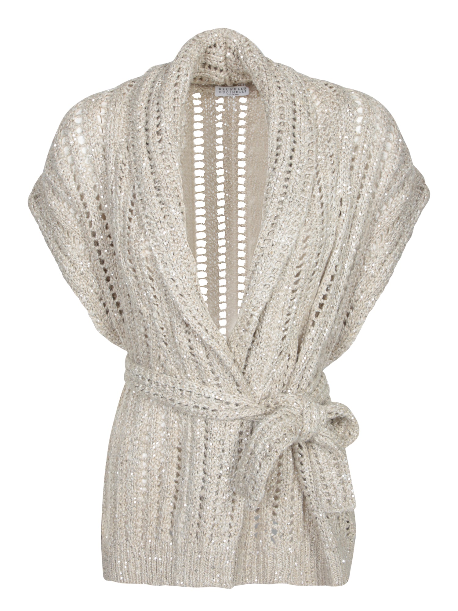 This elegant Brunello Cucinelli cardigan in captivating beige crochet offers a touch of class with its open design and fabric belt that emphasizes the silhouette. Perfect for a sophisticated evening look.