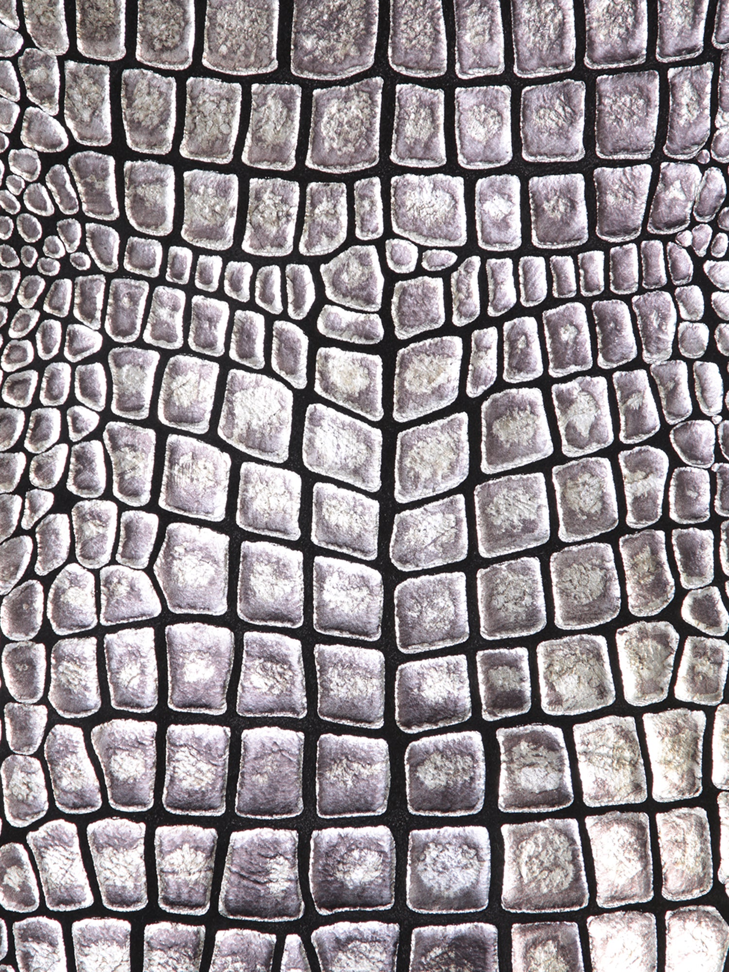 Mid rise. Side zip fastening. Two side welt pockets. Metallic effect. Embossed crocodile effect. Thingh length. Color: black/ silver