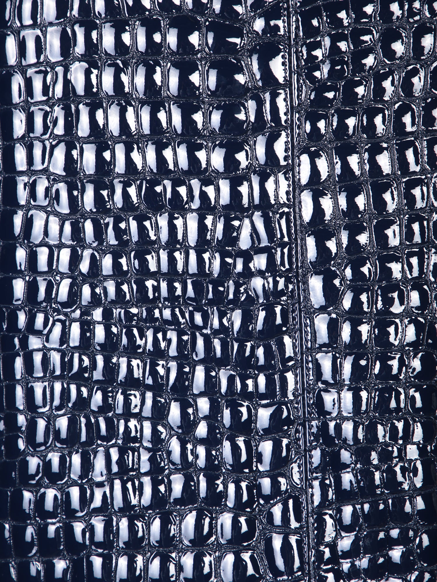Rear zip fastening. Shiny finish. Midi style. Straight hem.