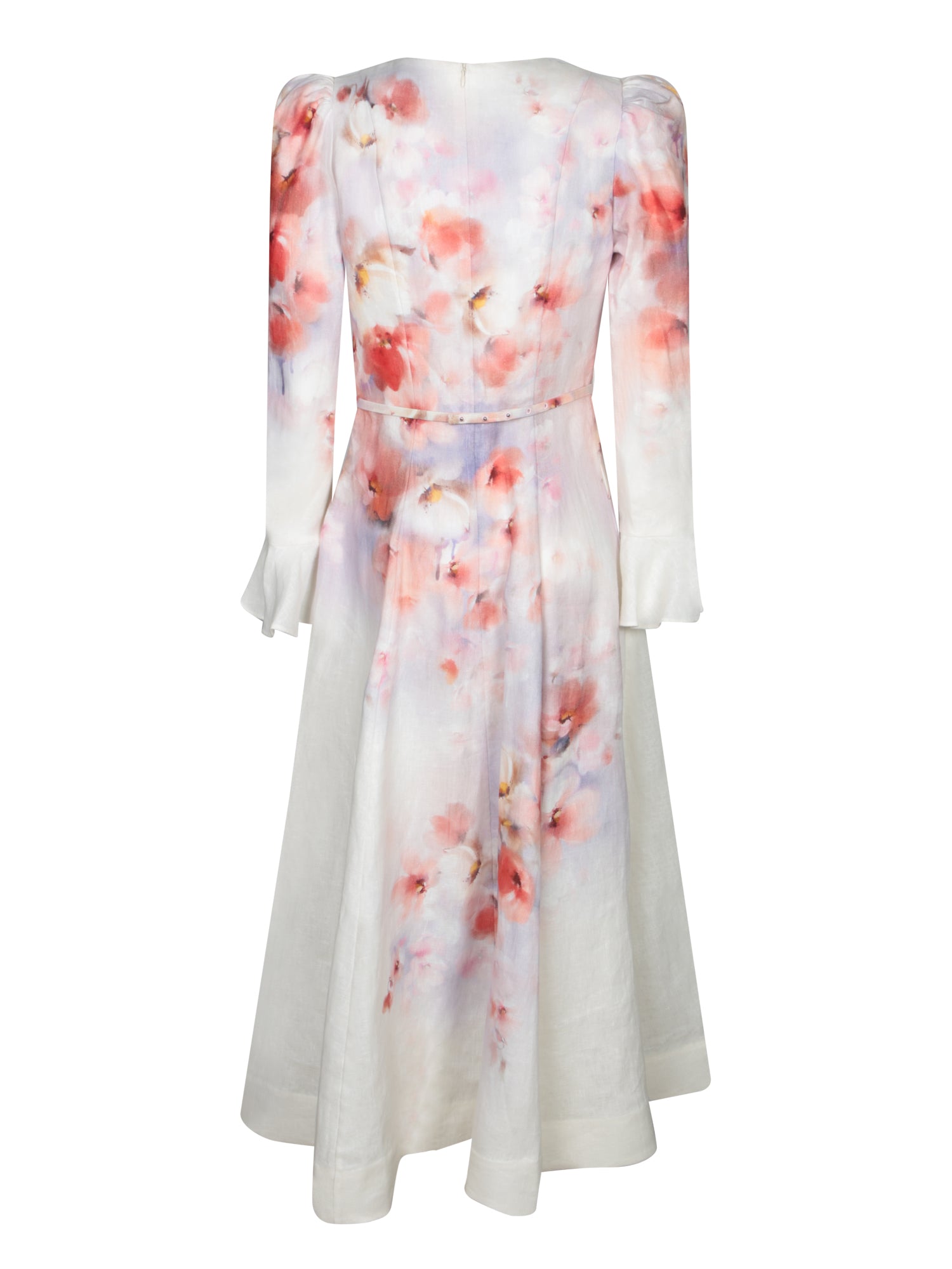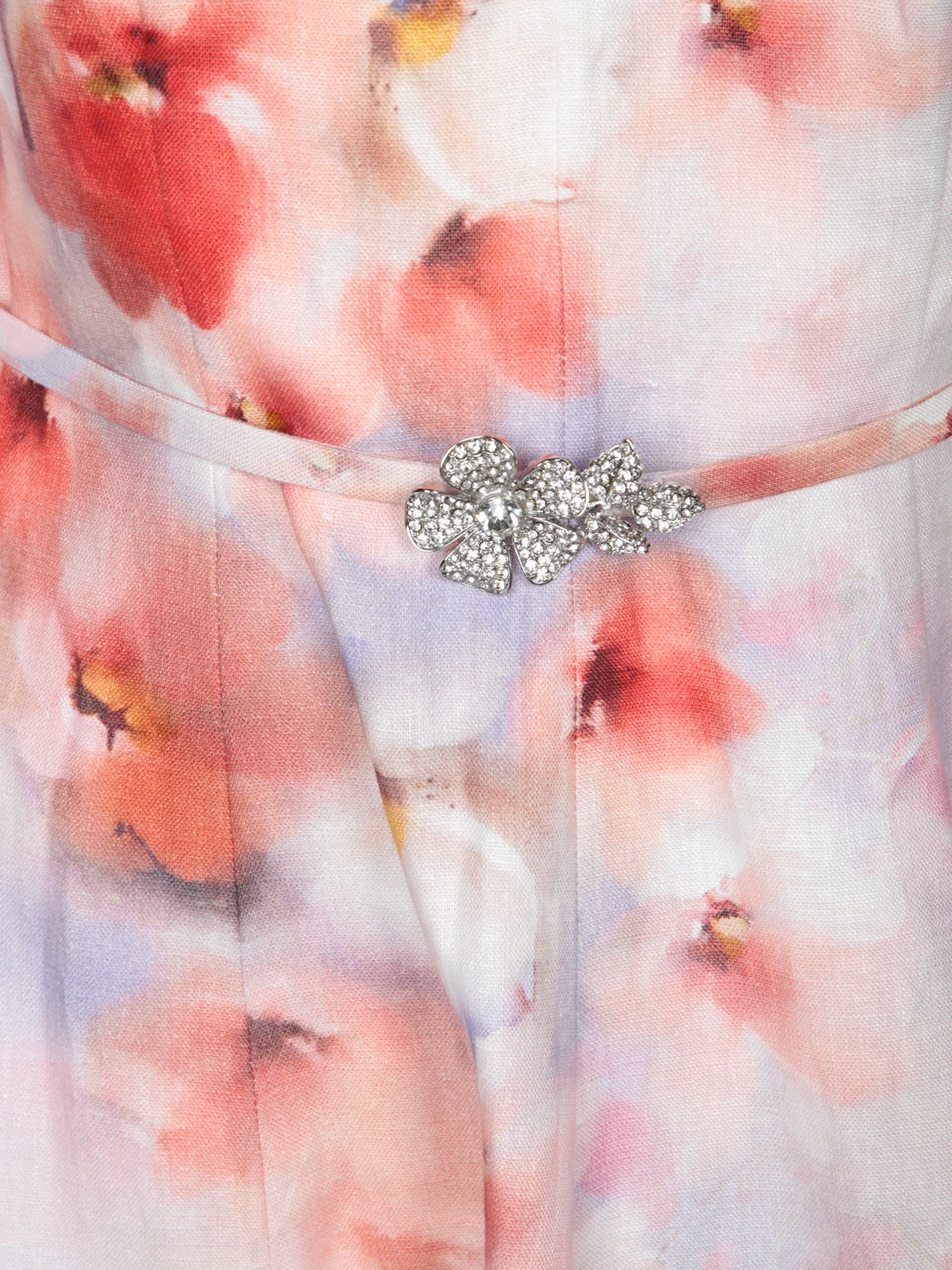 This Zimmermann dress captivates with its delicate and lively floral print, perfect for spring and summer occasions. Featuring a sophisticated V-neck and a belt with a decorative buckle, it offers an elegant and feminine silhouette.