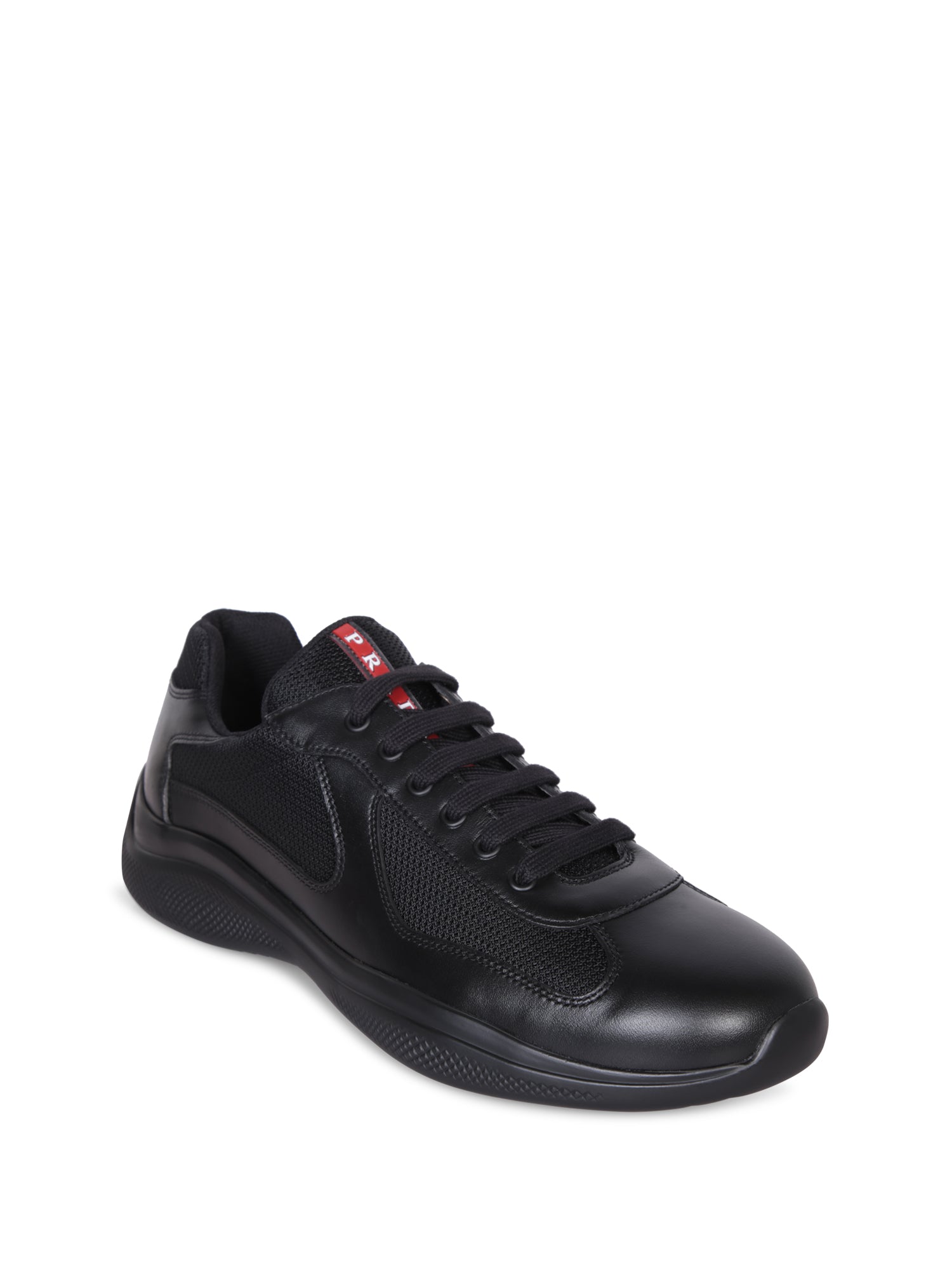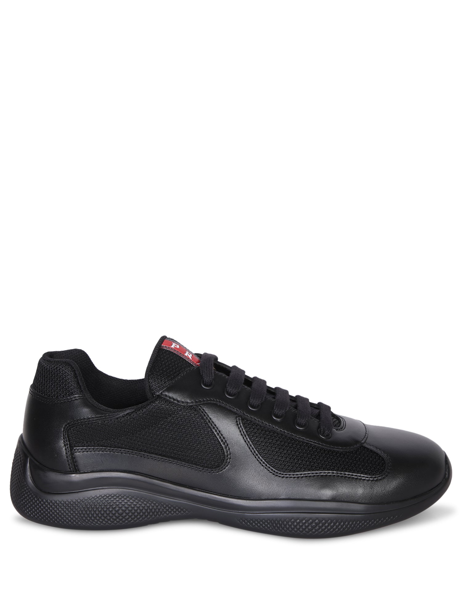 Low-top black leather sneakers. Red logo detail on the heel. Non-slip rubber sole.