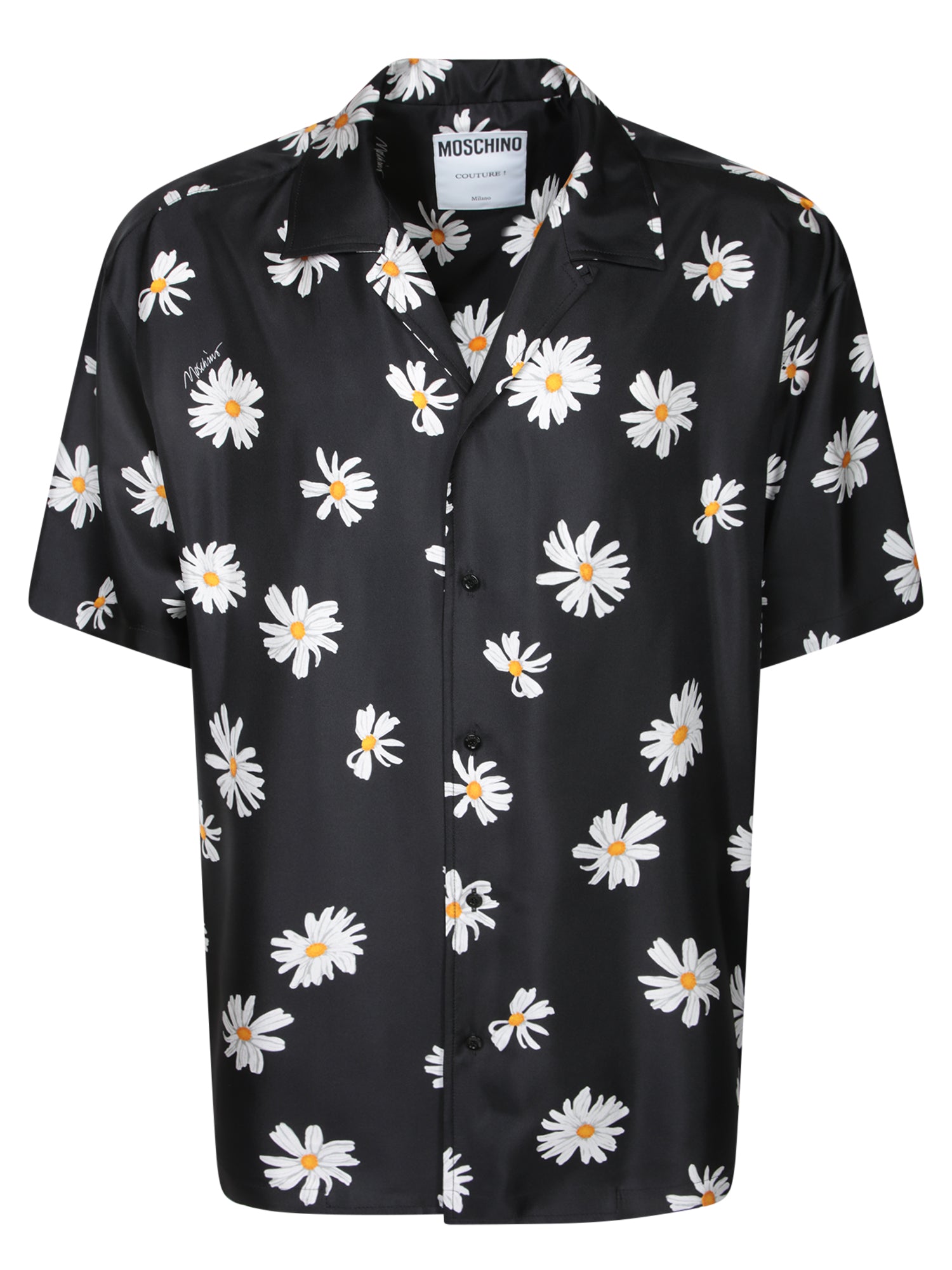 This elegant black Moschino shirt enhanced with a vibrant daisy print adds a sophisticated yet cheerful touch to a modern wardrobe. Perfect for stylish yet casual occasions.