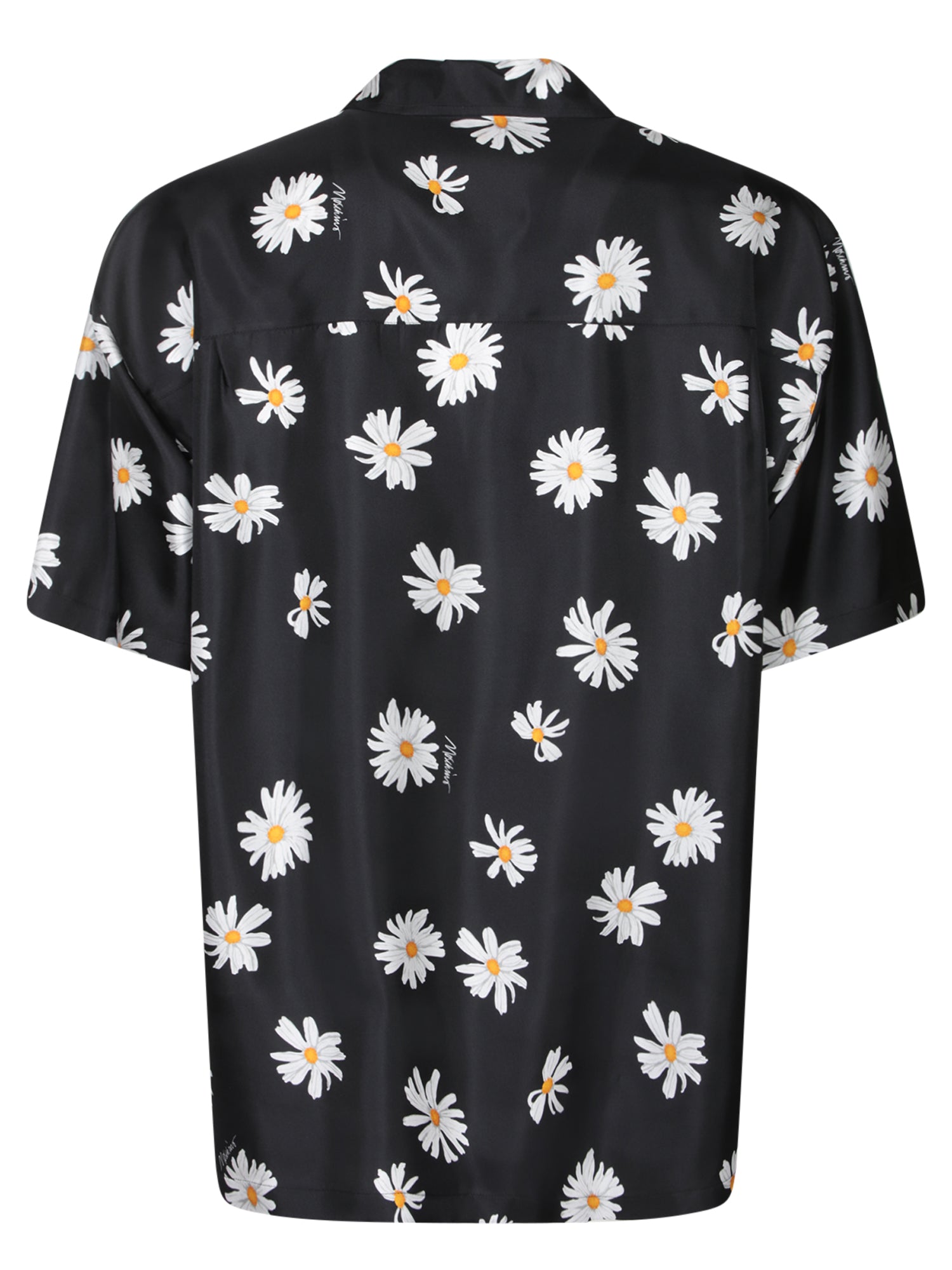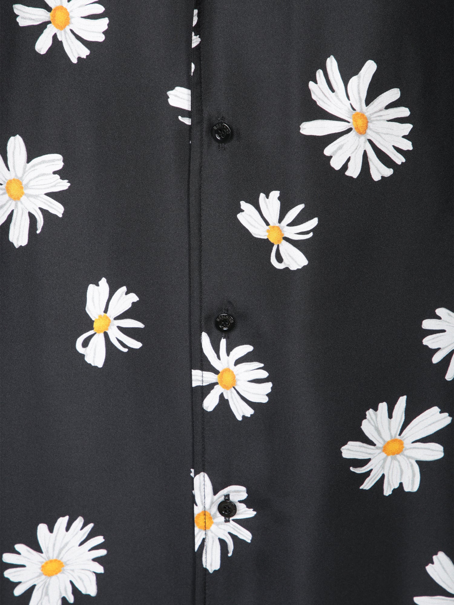 Short sleeve shirt. Daisy print on black fabric. Button closure.