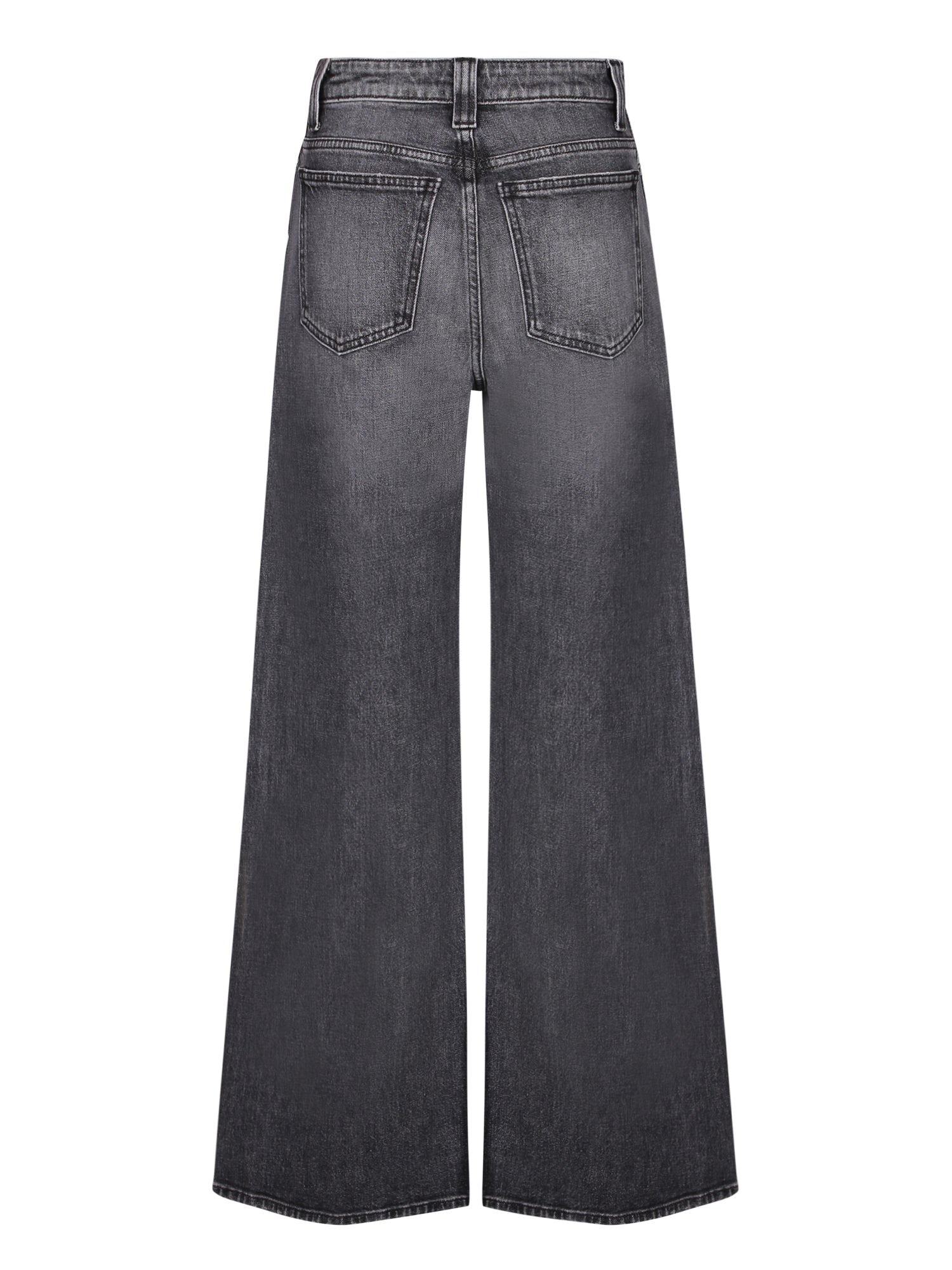 Grey denim flared jeans. High-rise with belt loops. Front zip and button closure.