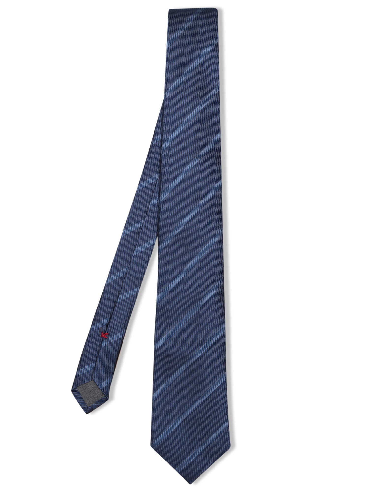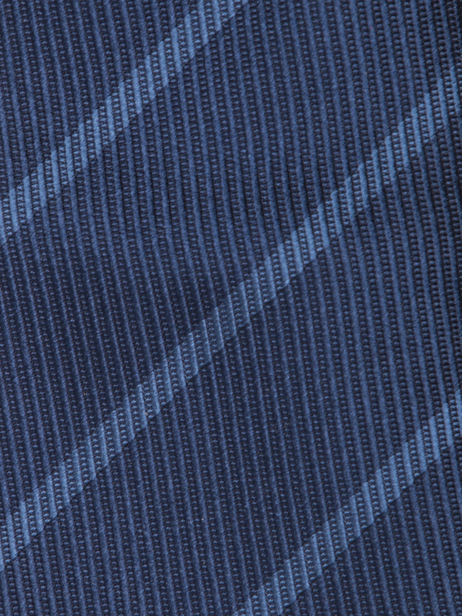 Silk tie with dark blue and navy regimental pattern. High-quality finishes. Subtle brand logo.