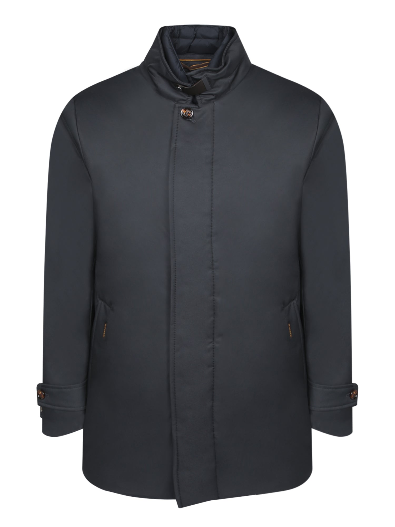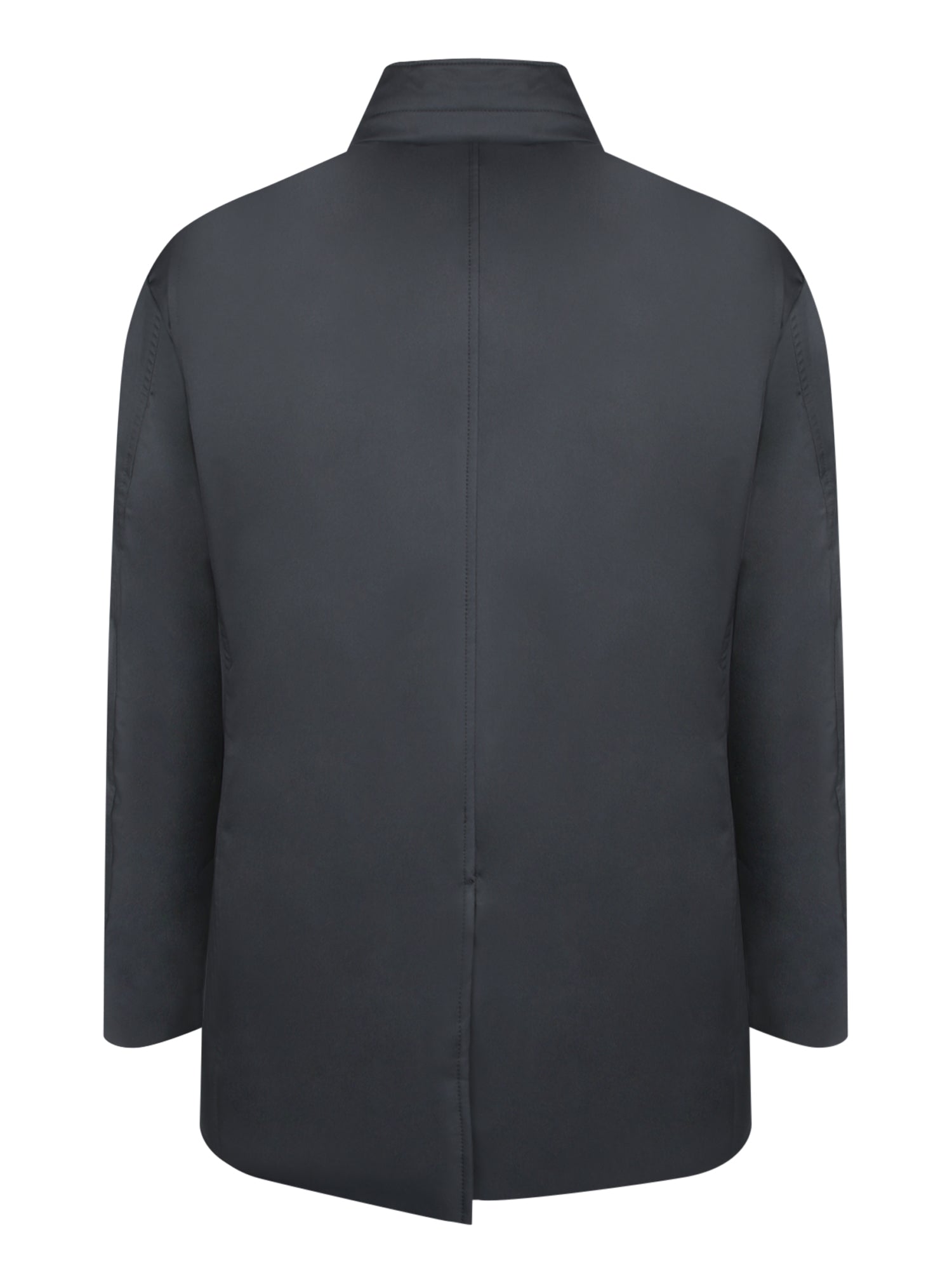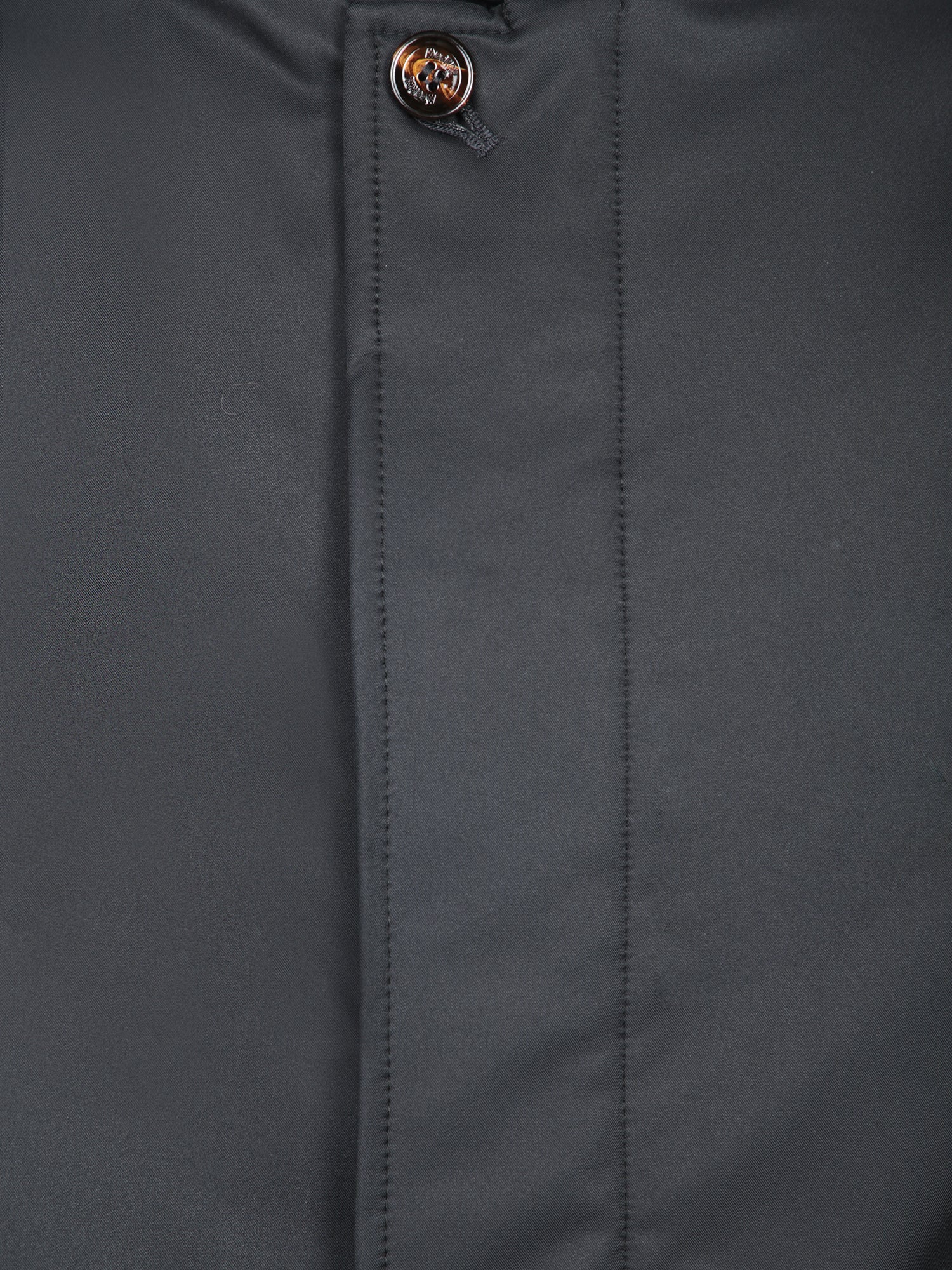 Hidden snap button closure, side zip pockets, adjustable cuffs.