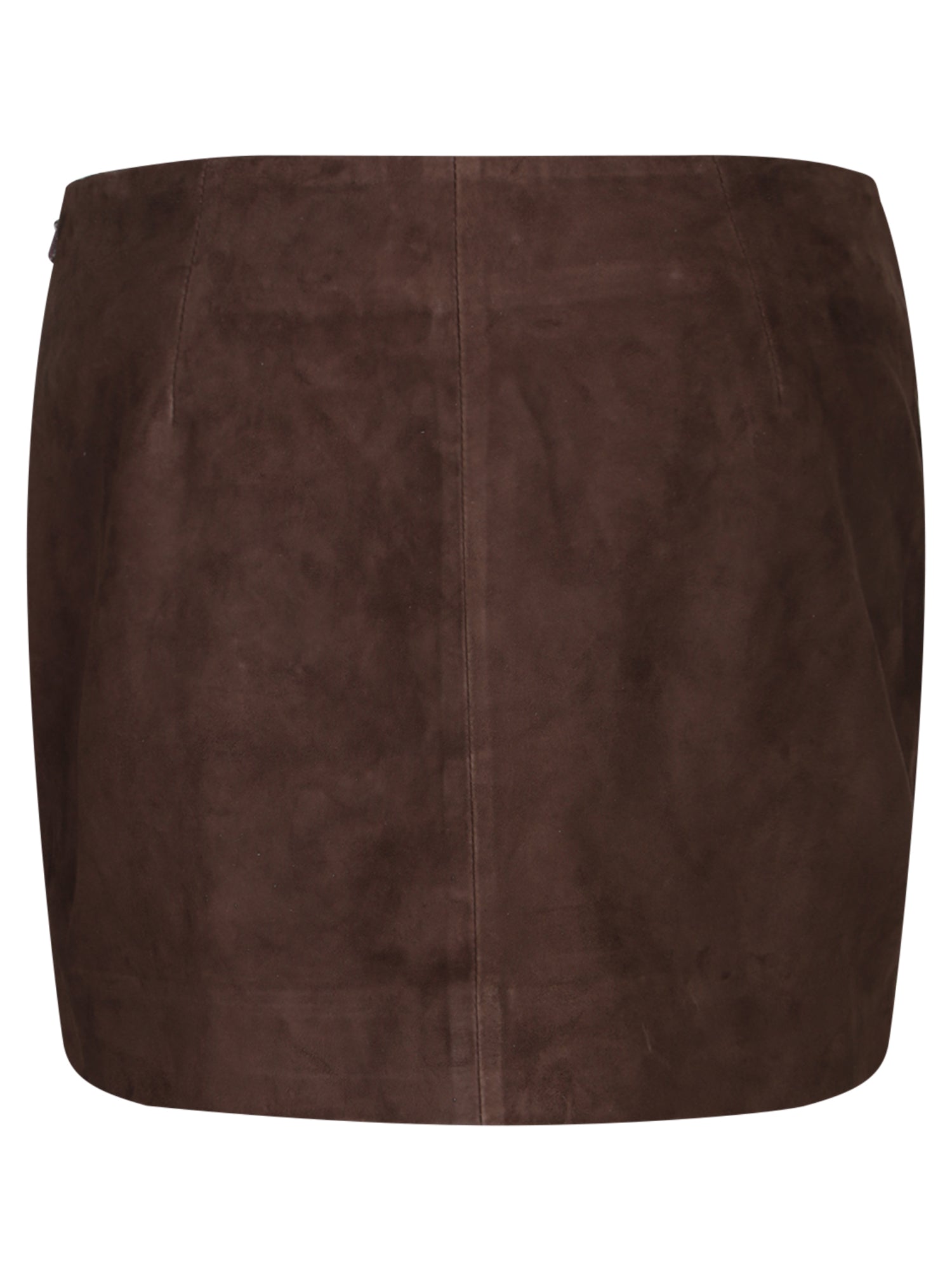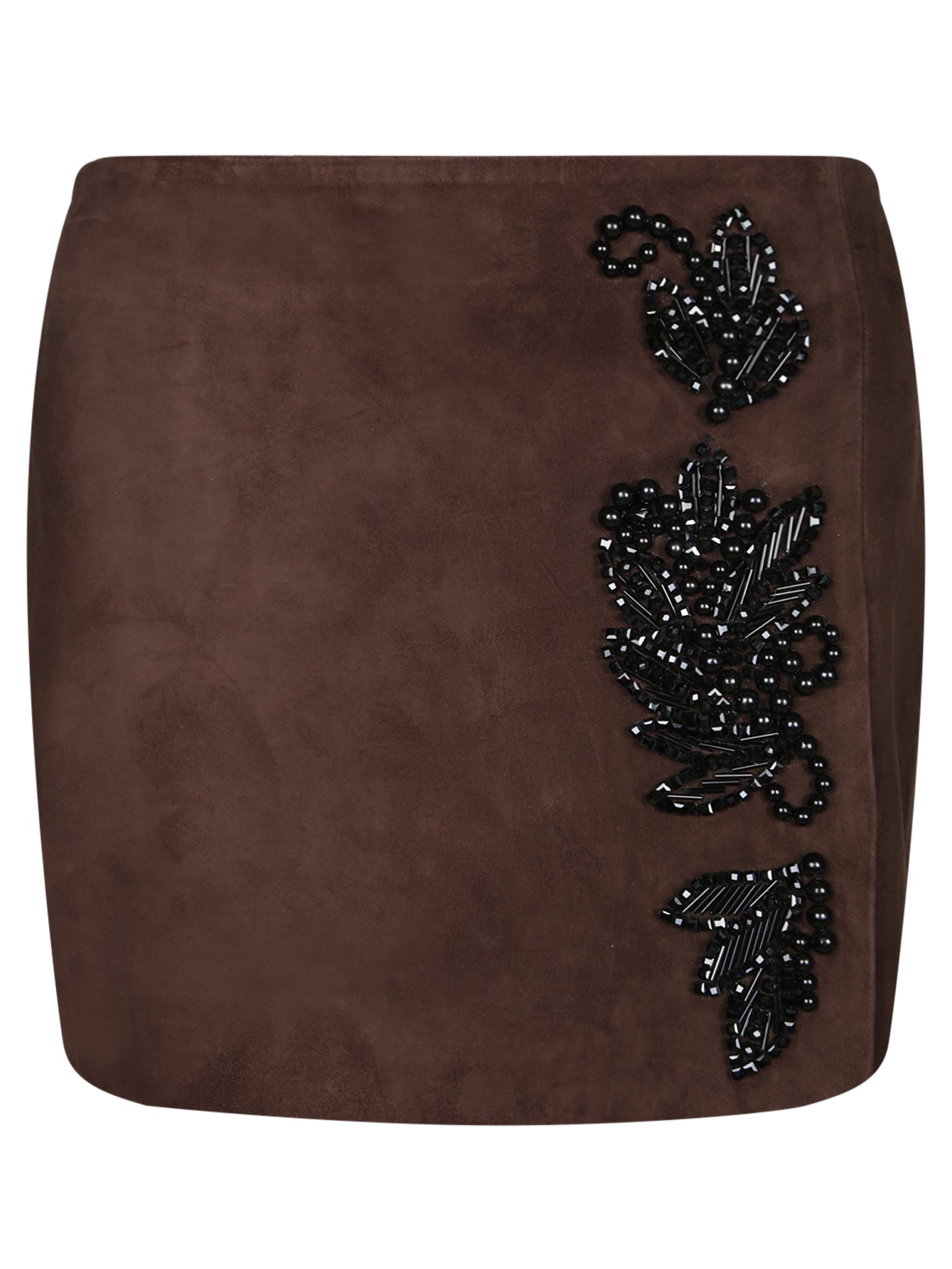 Suede mini skirt. Black beaded floral embroidery detail. Invisible side closure.
