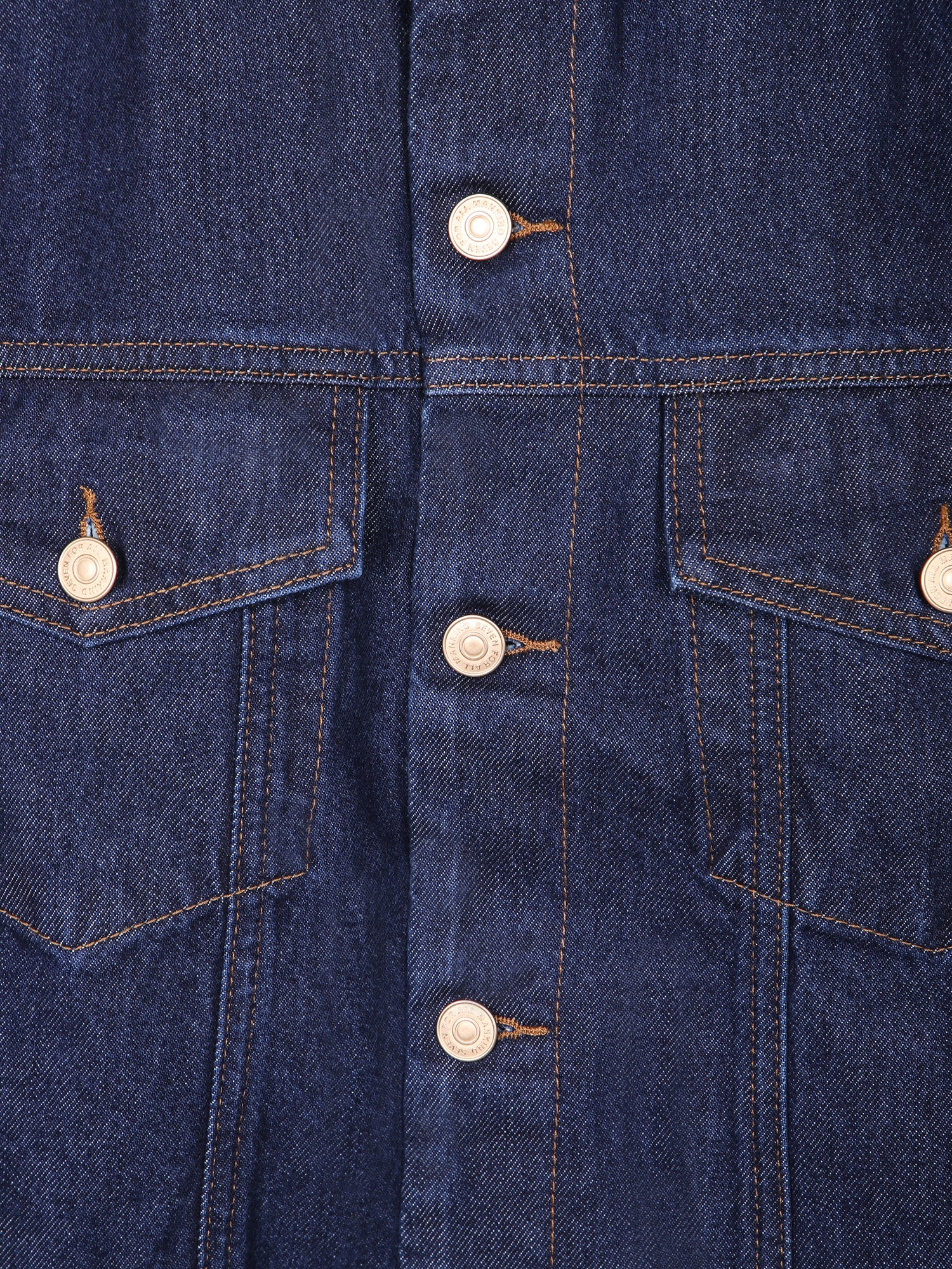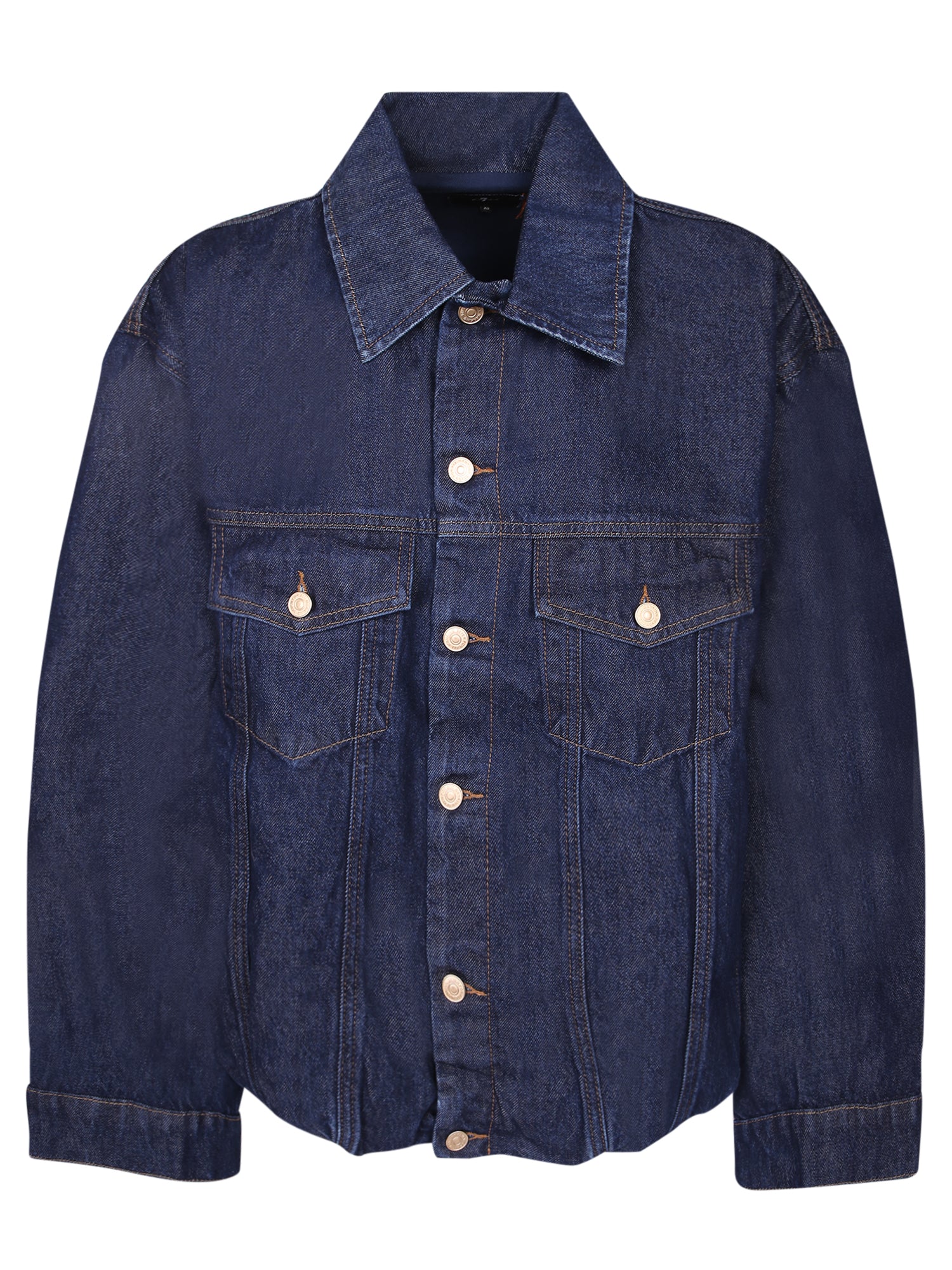Denim bomber jacket. Classic collar, button front closure, flap chest pockets.