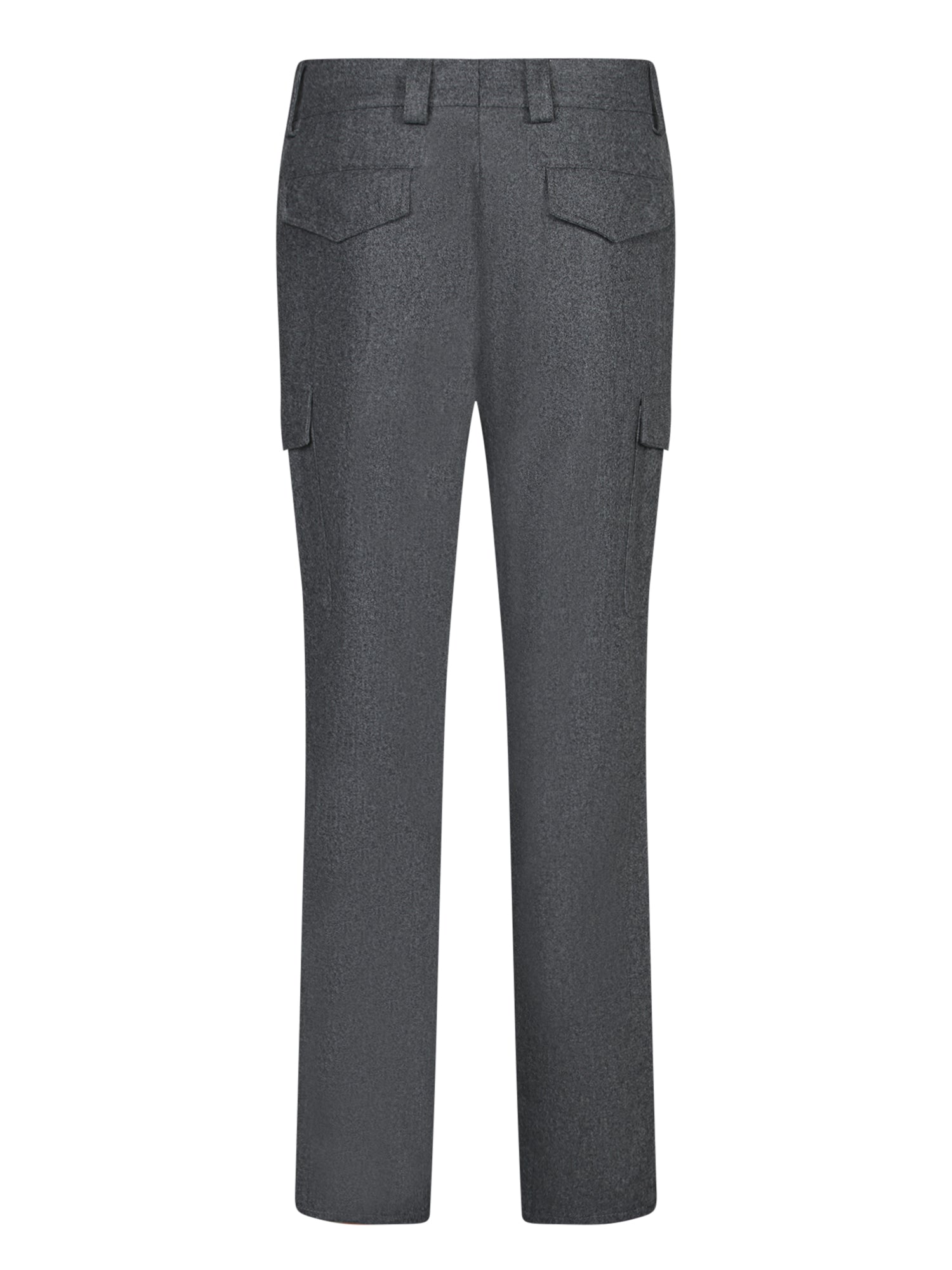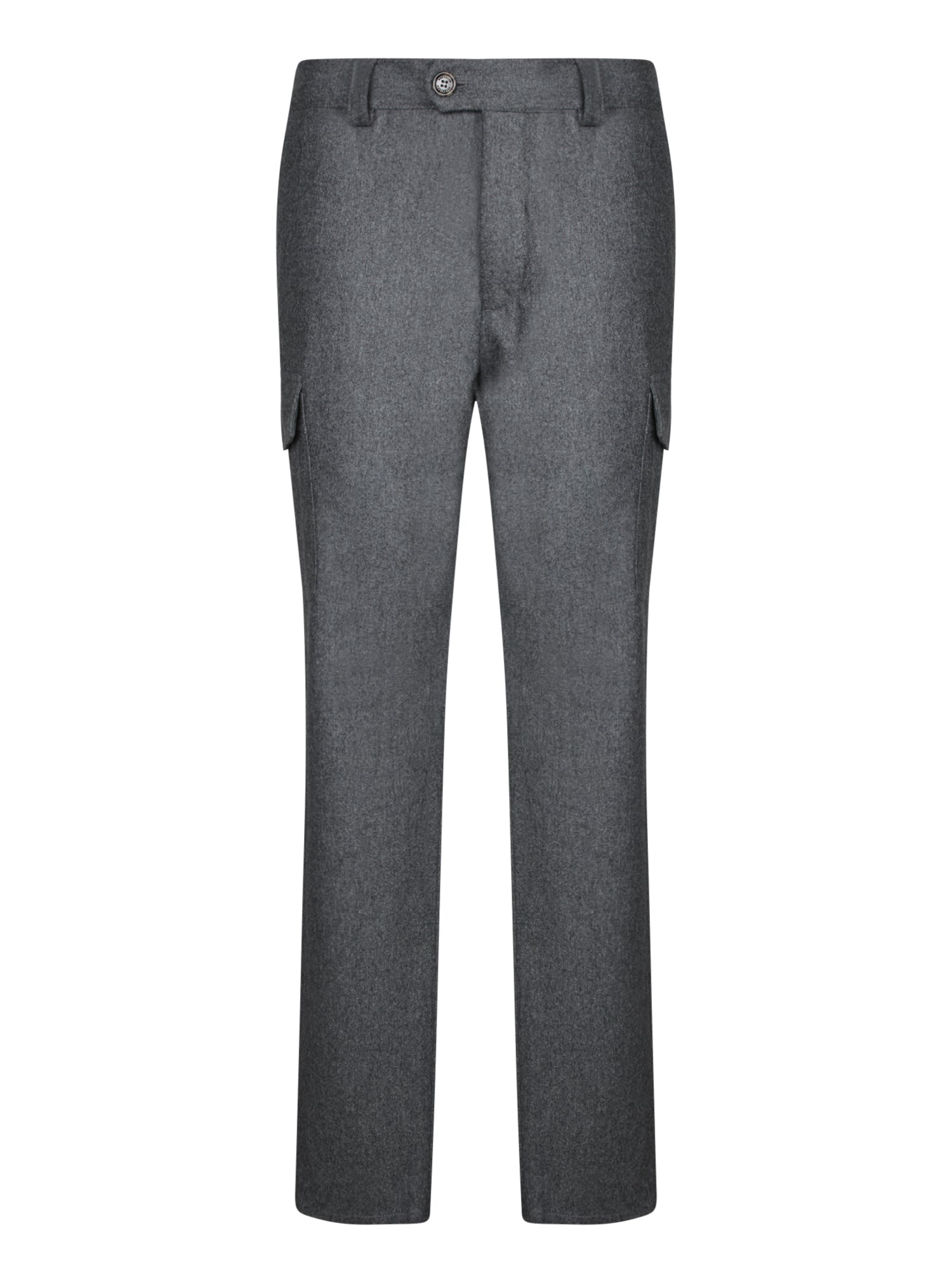 Flannel pants with side cargo pockets. Front closure with button and zipper. Elegant design with pleats.