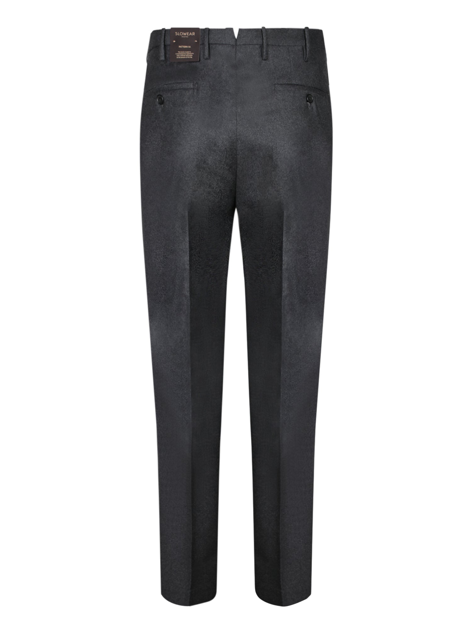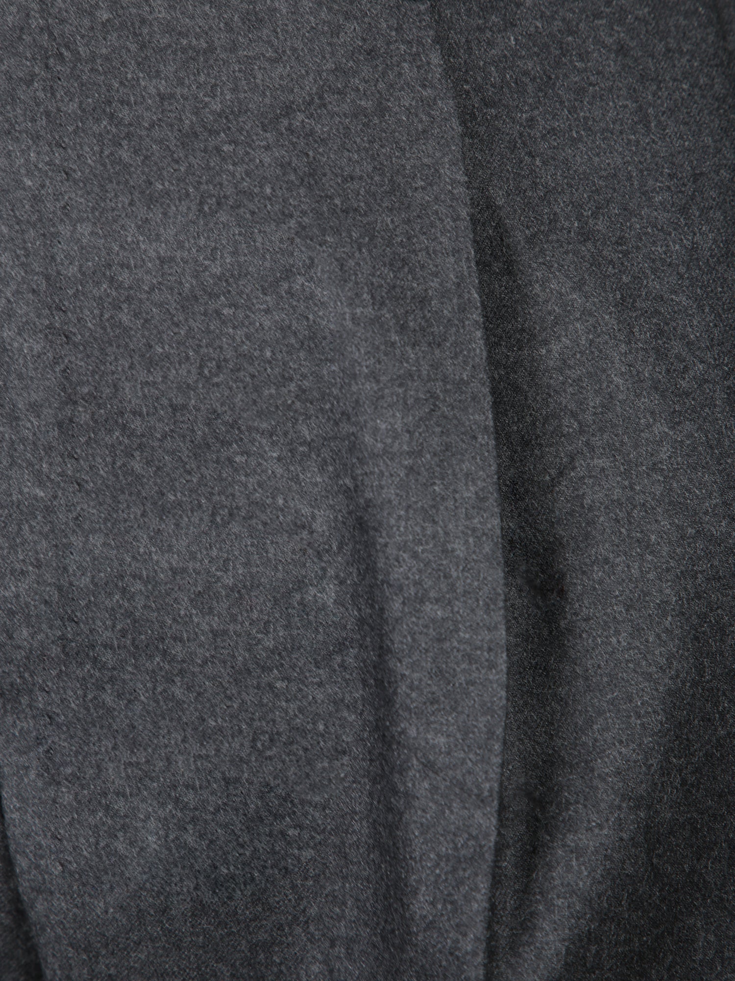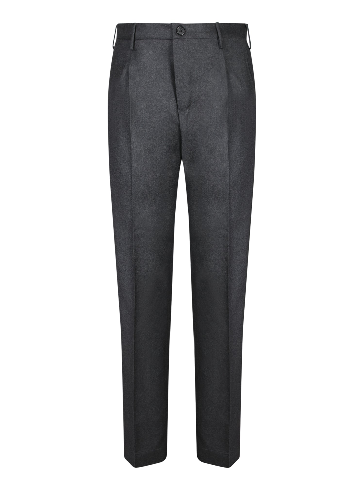 Dark grey flannel trousers. Tapered fit. Front button and zipper closure.