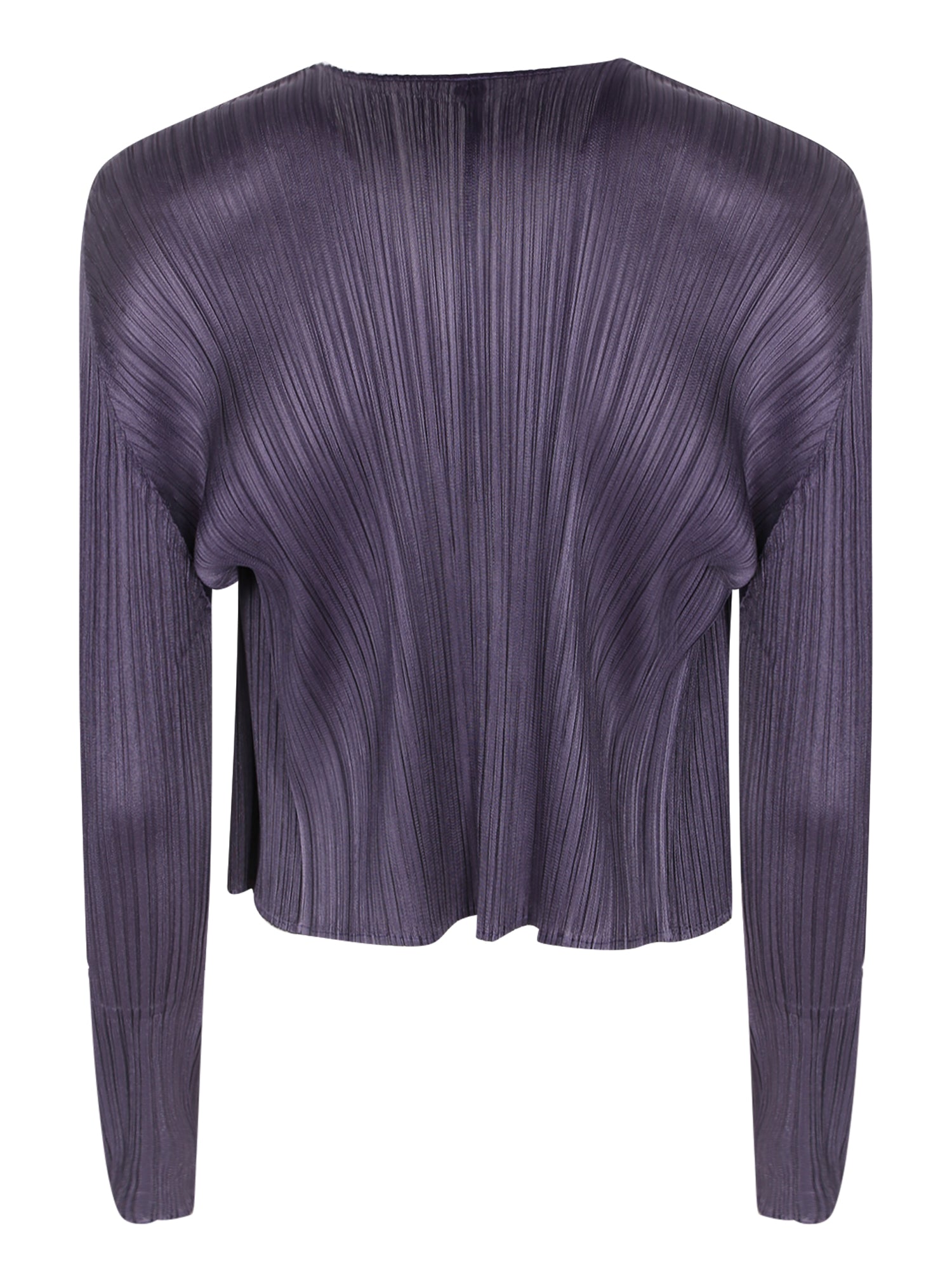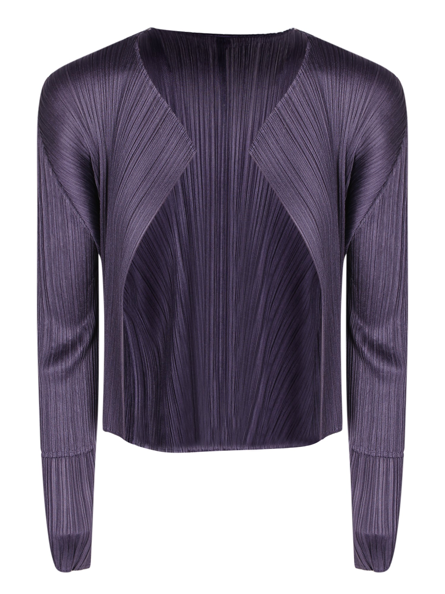 Cardigan with pleated structure, long sleeves, no front closure.