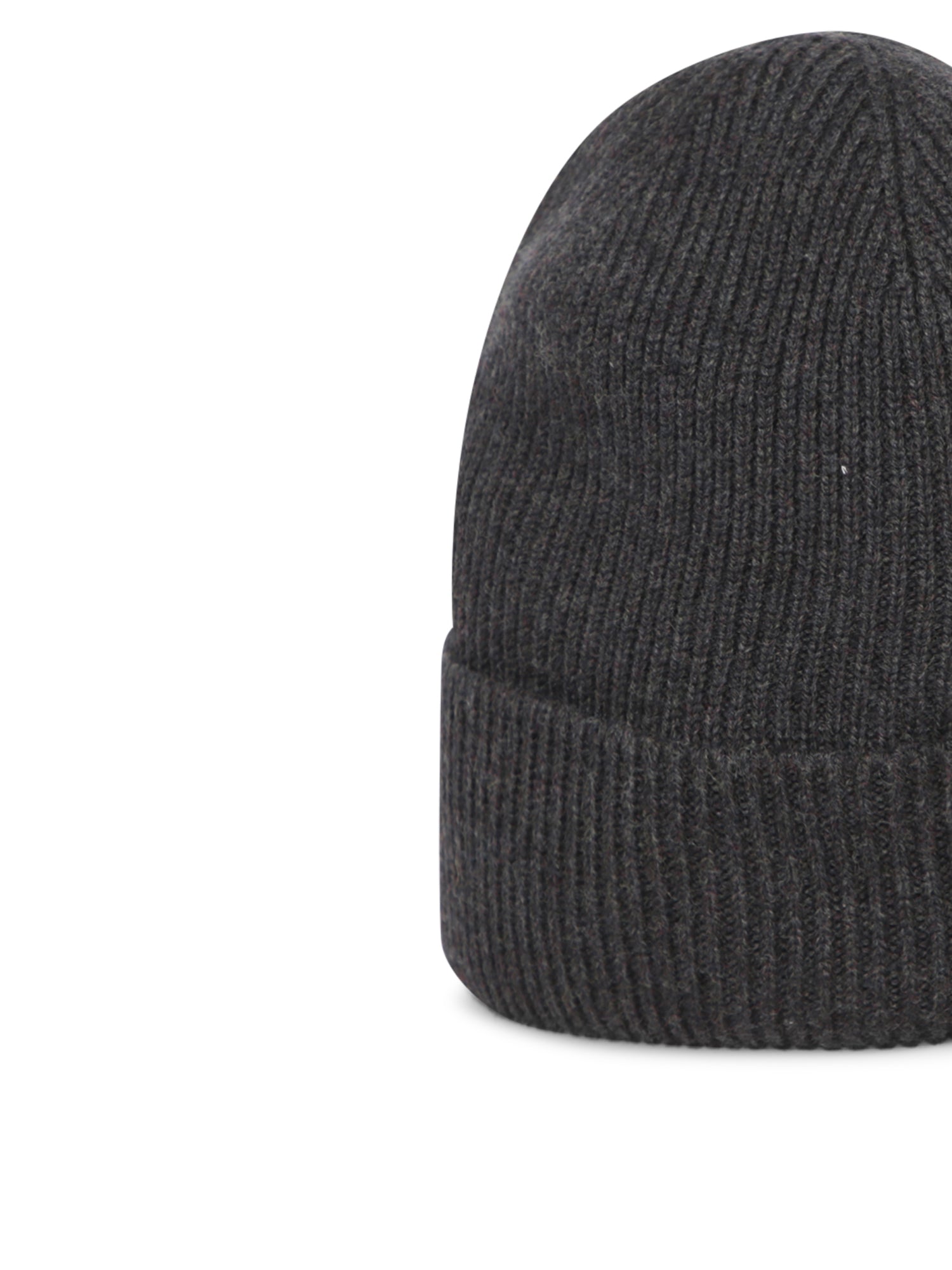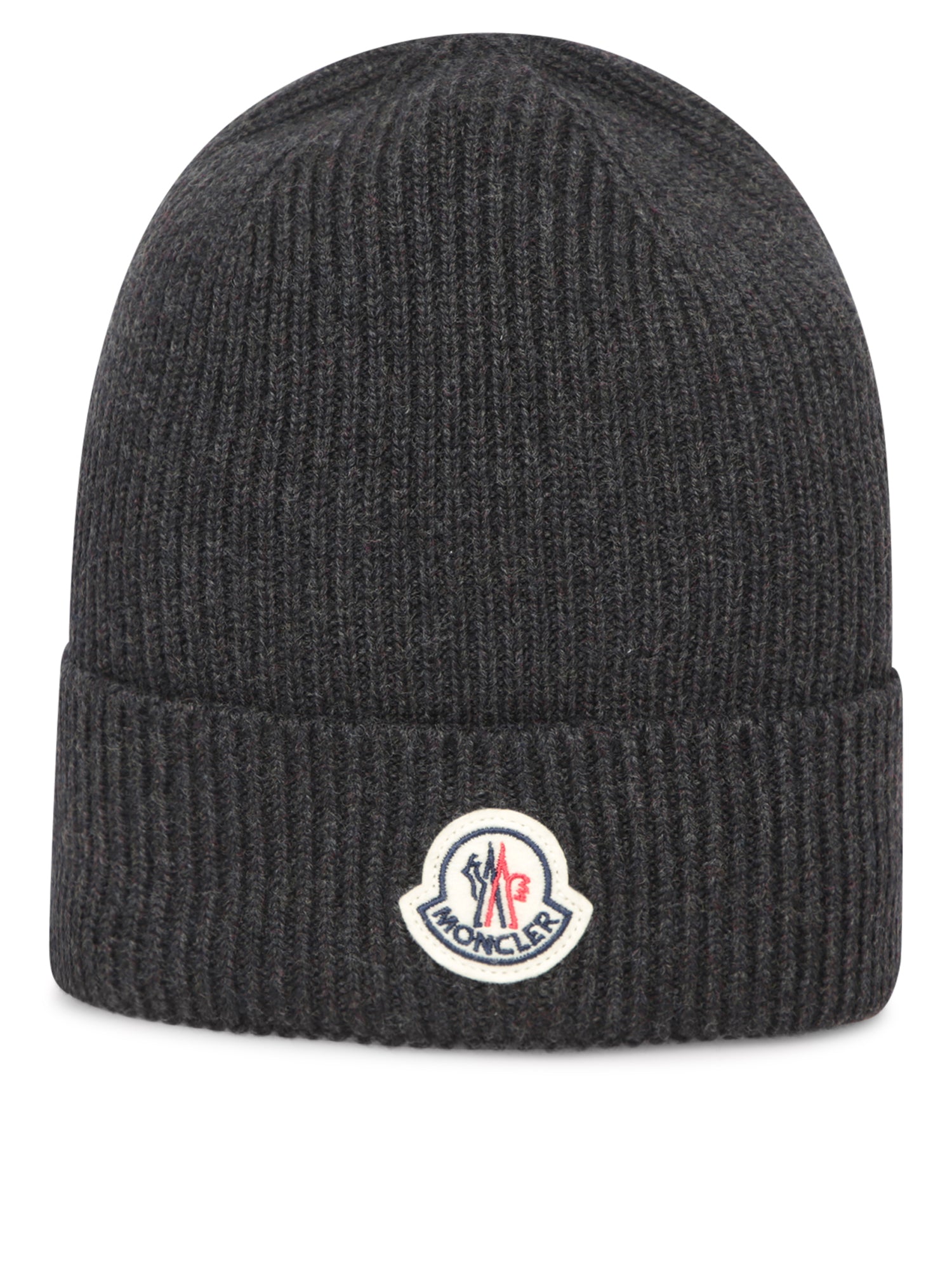 Knitted wool beanie. Moncler logo patch. Ribbed elastic fit for comfort.