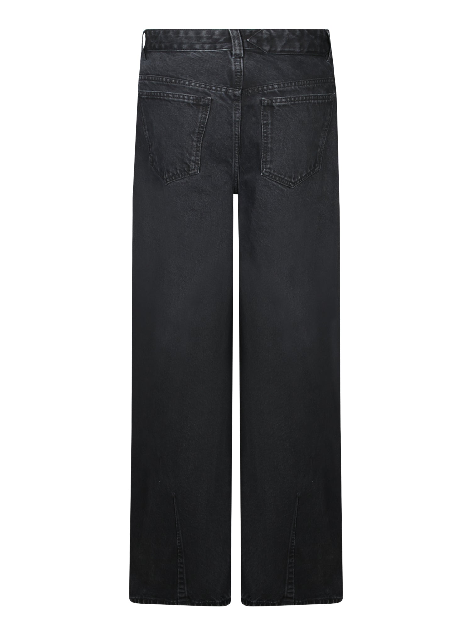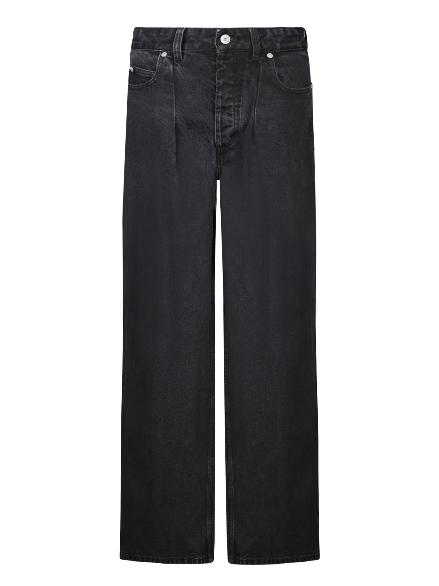 Wide-leg denim jeans. Regular waist with zipper and button closure. Front and back pockets.