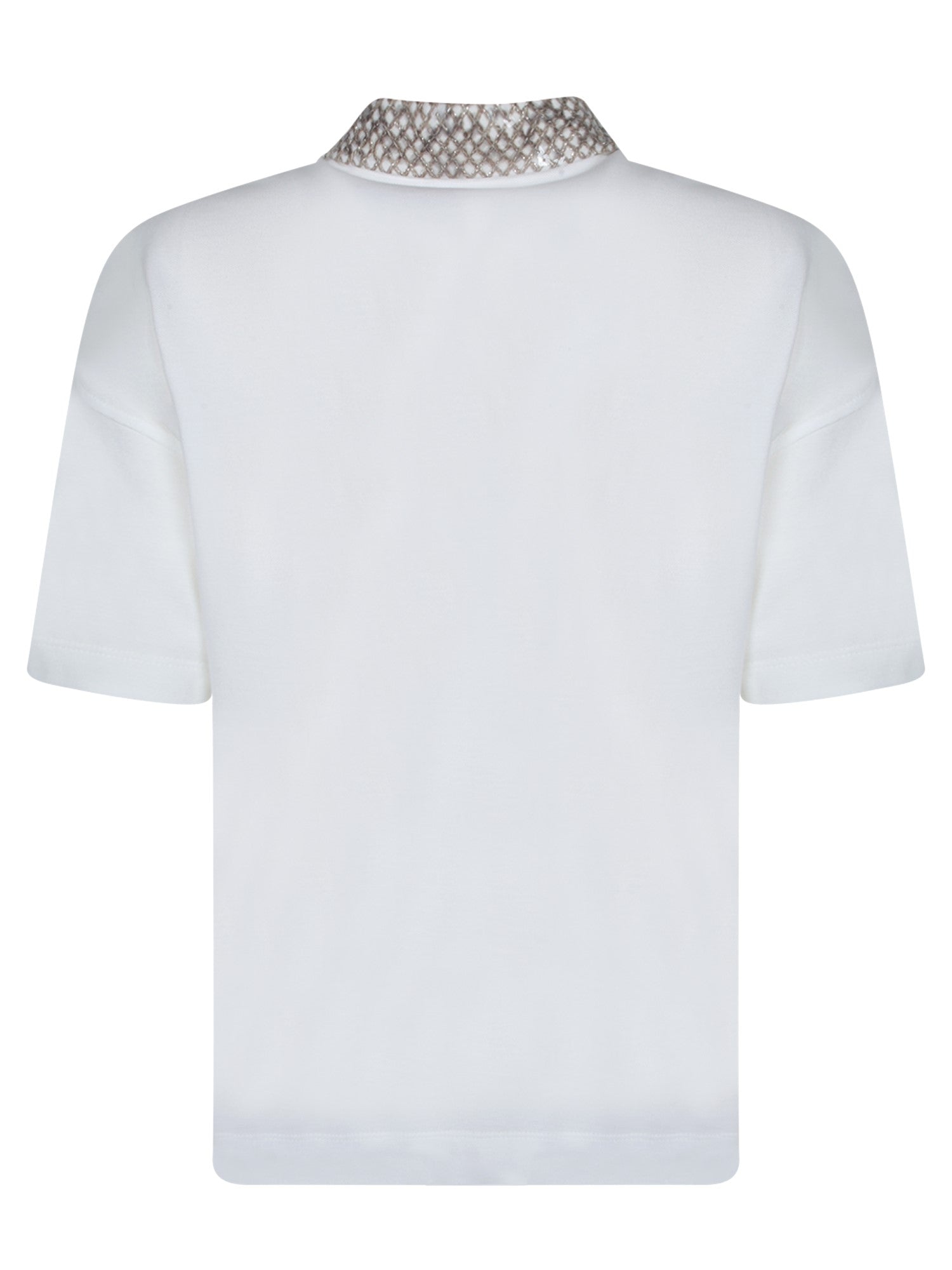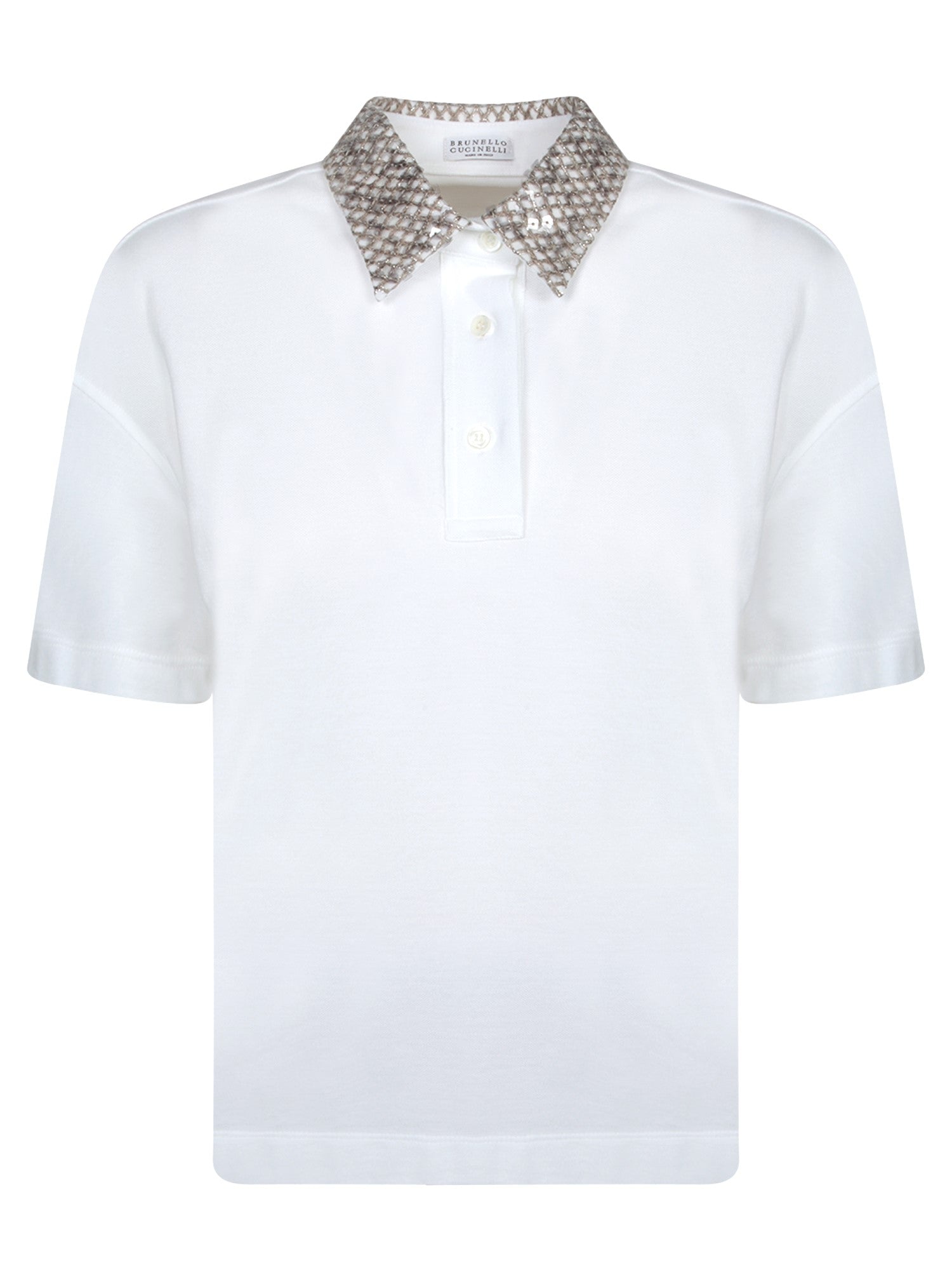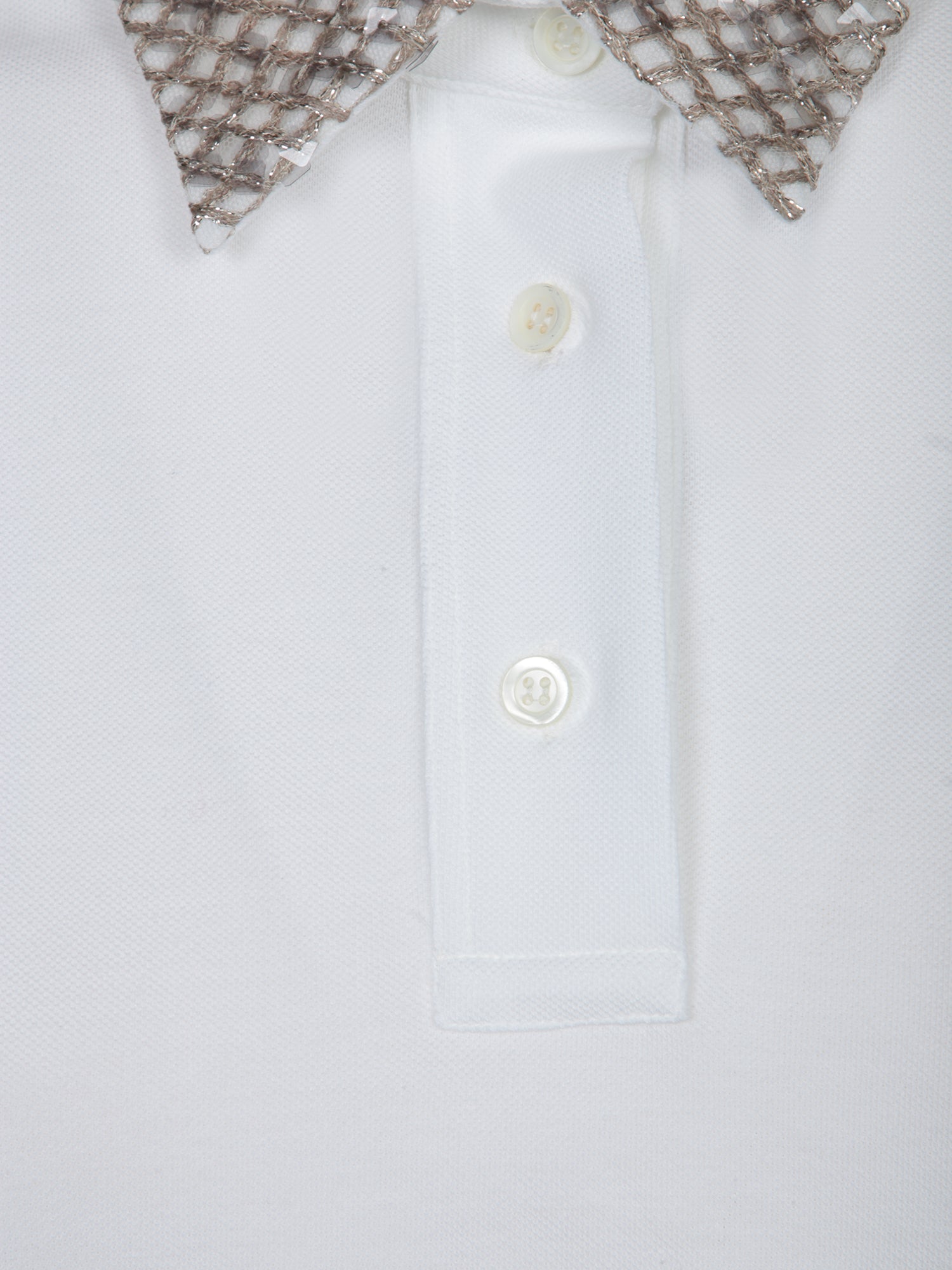 Short sleeve polo. Collar embellished with sparkling details. Three-button placket.