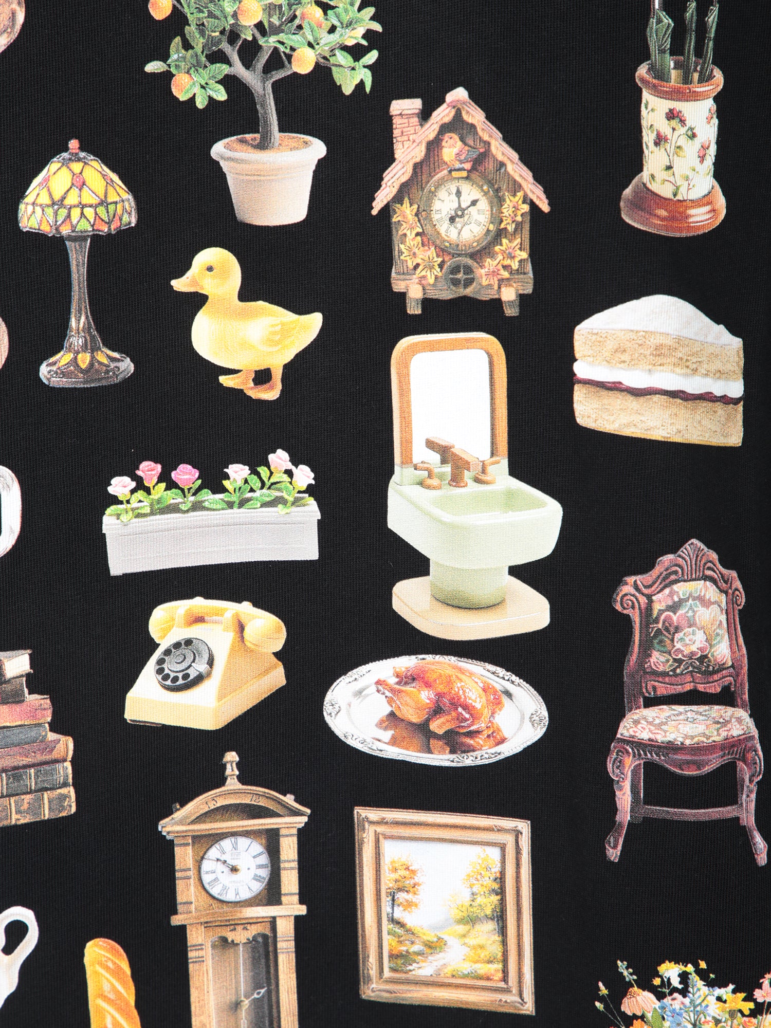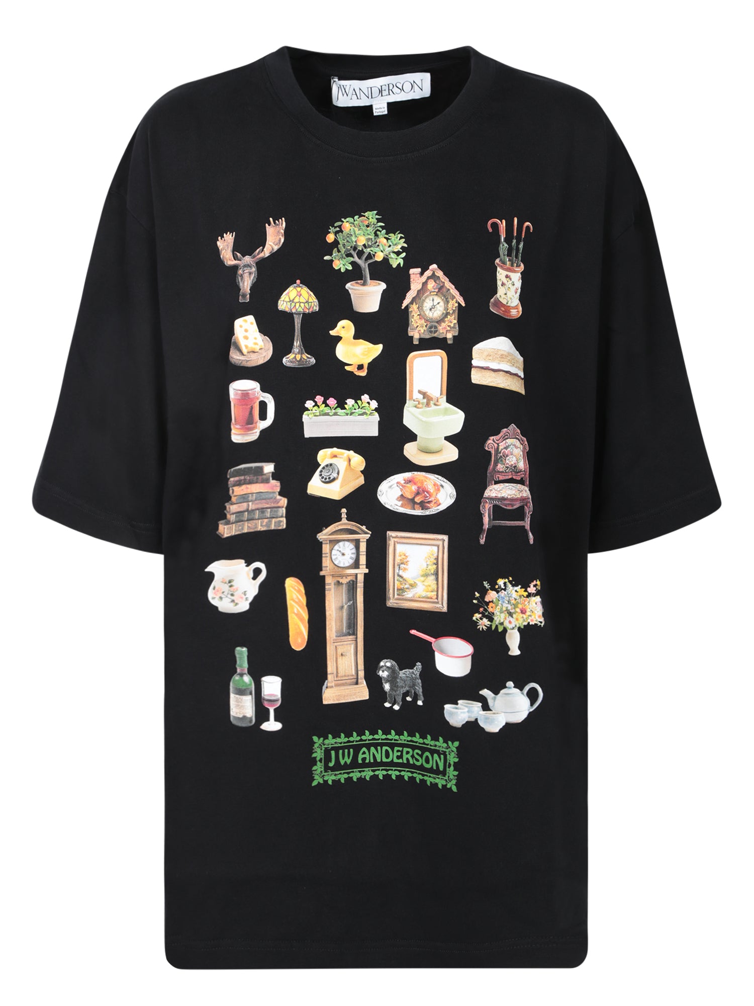 This black T-shirt by J.W. Anderson features a unique set of diorama prints that capture the essence of everyday art, offering a contemporary and eclectic touch.