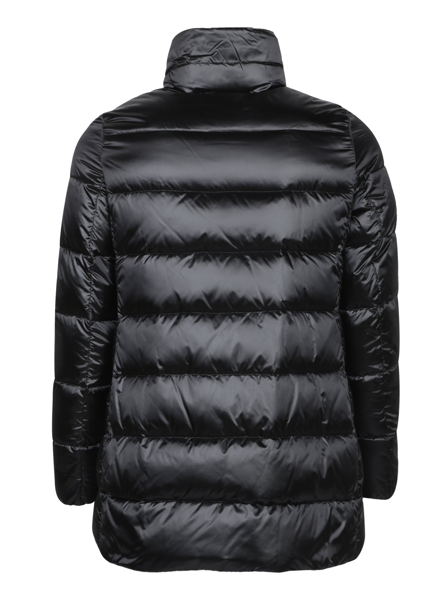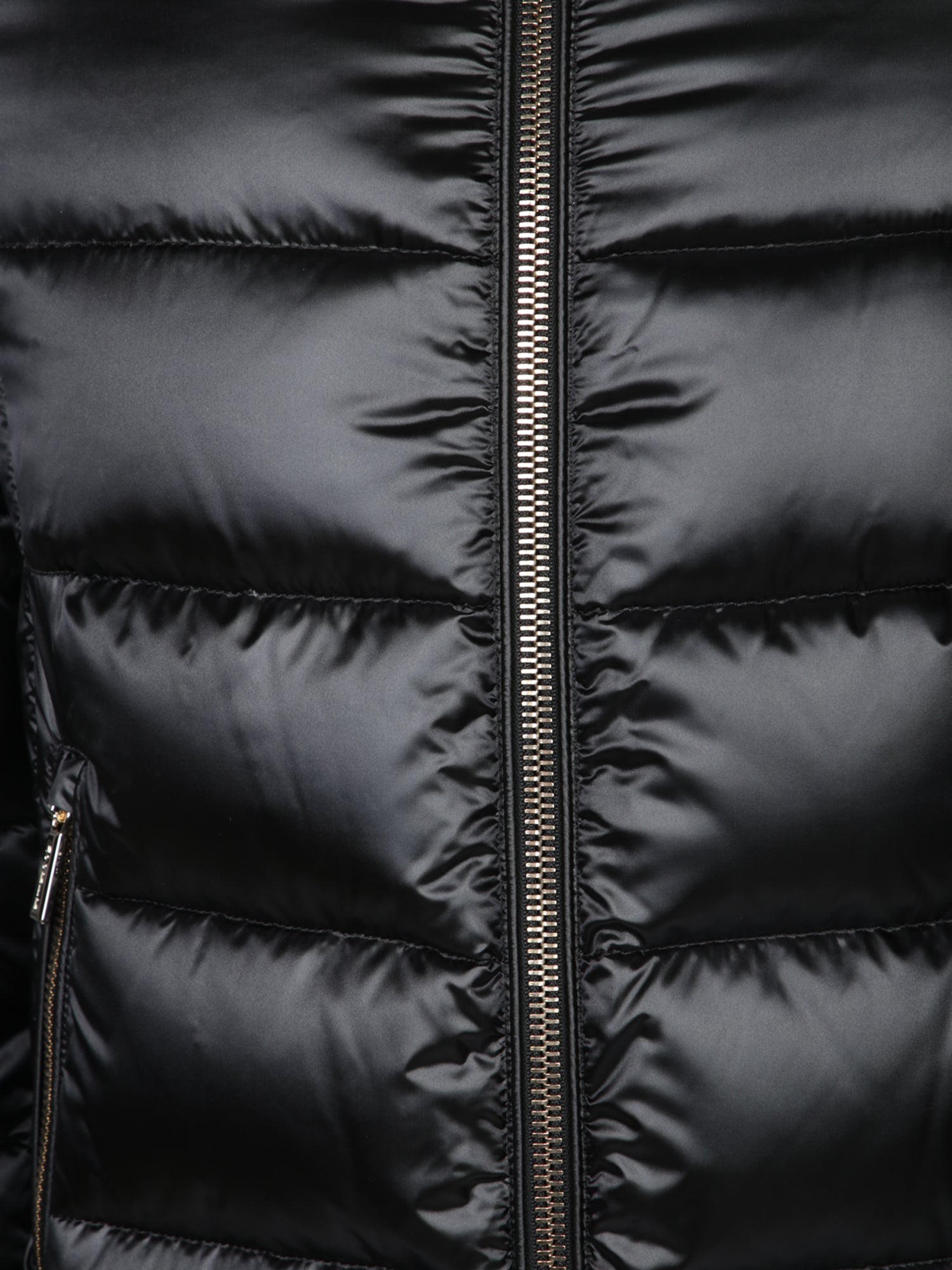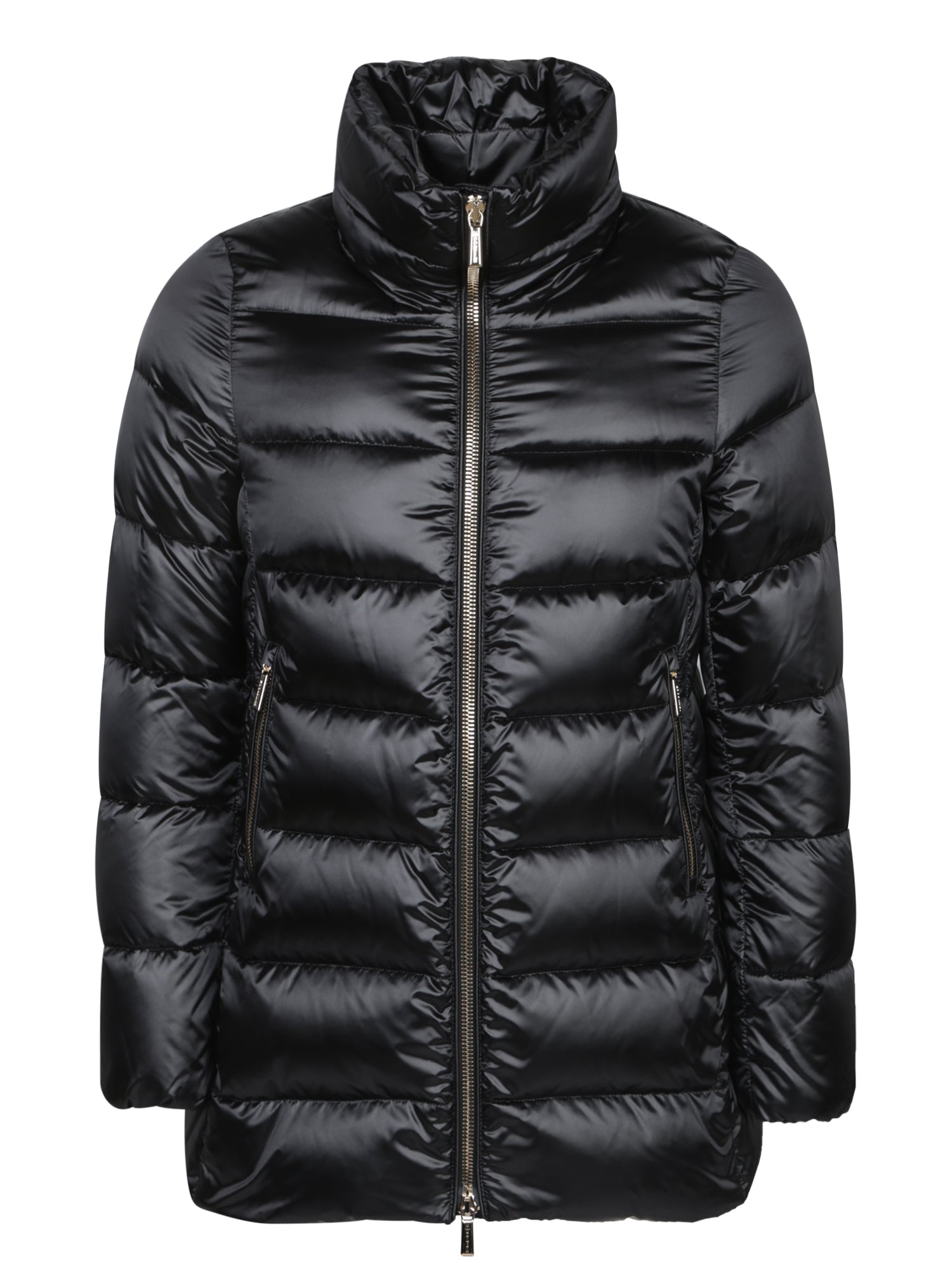 Padded jacket with front zipper. High collar. Side zip pockets.