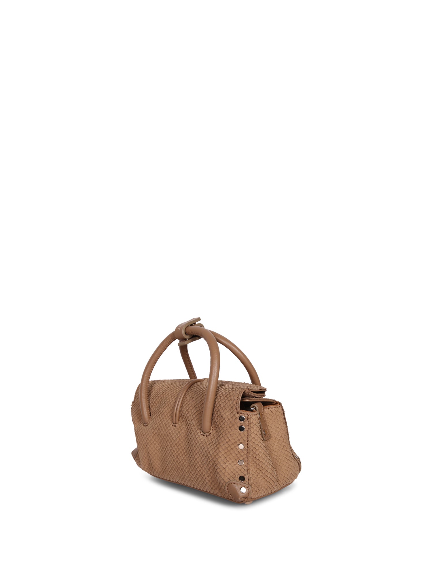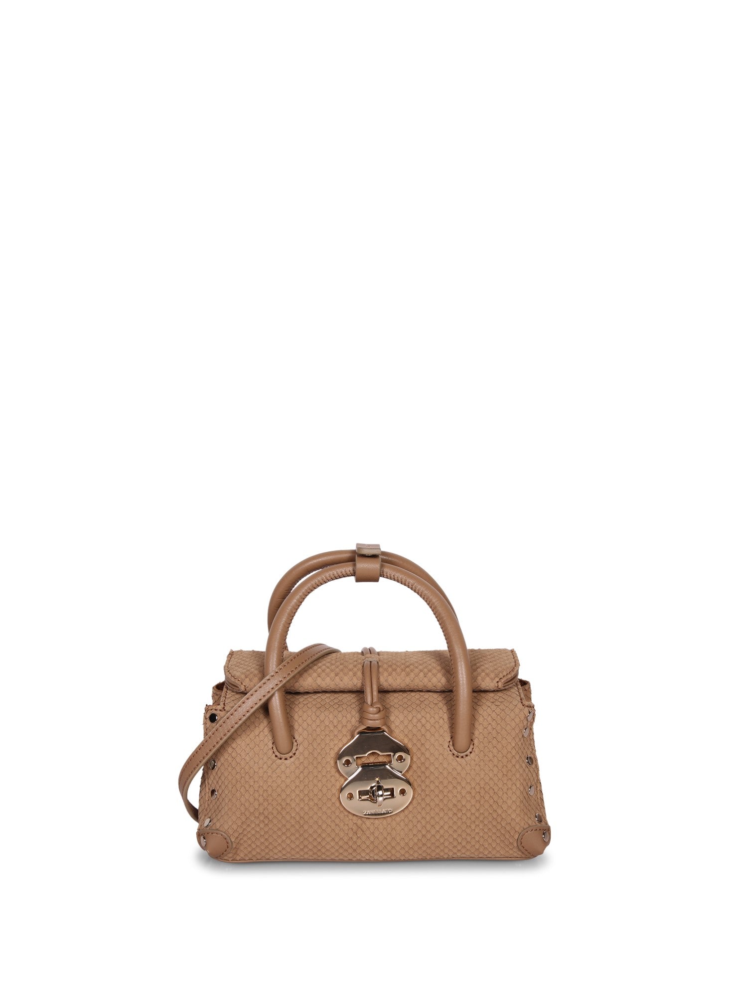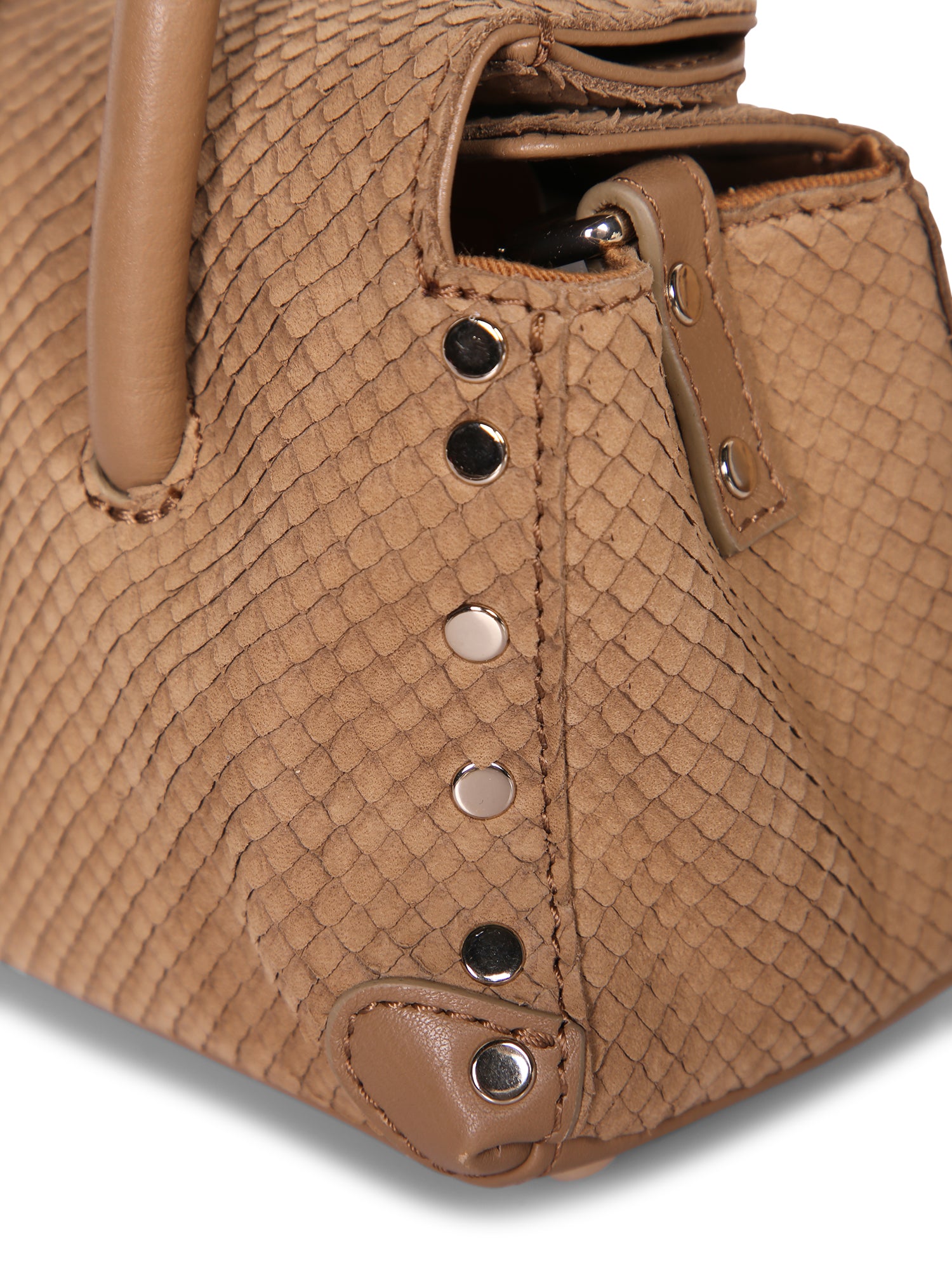 Textured leather bag with front lock closure. Includes an adjustable and removable shoulder strap.