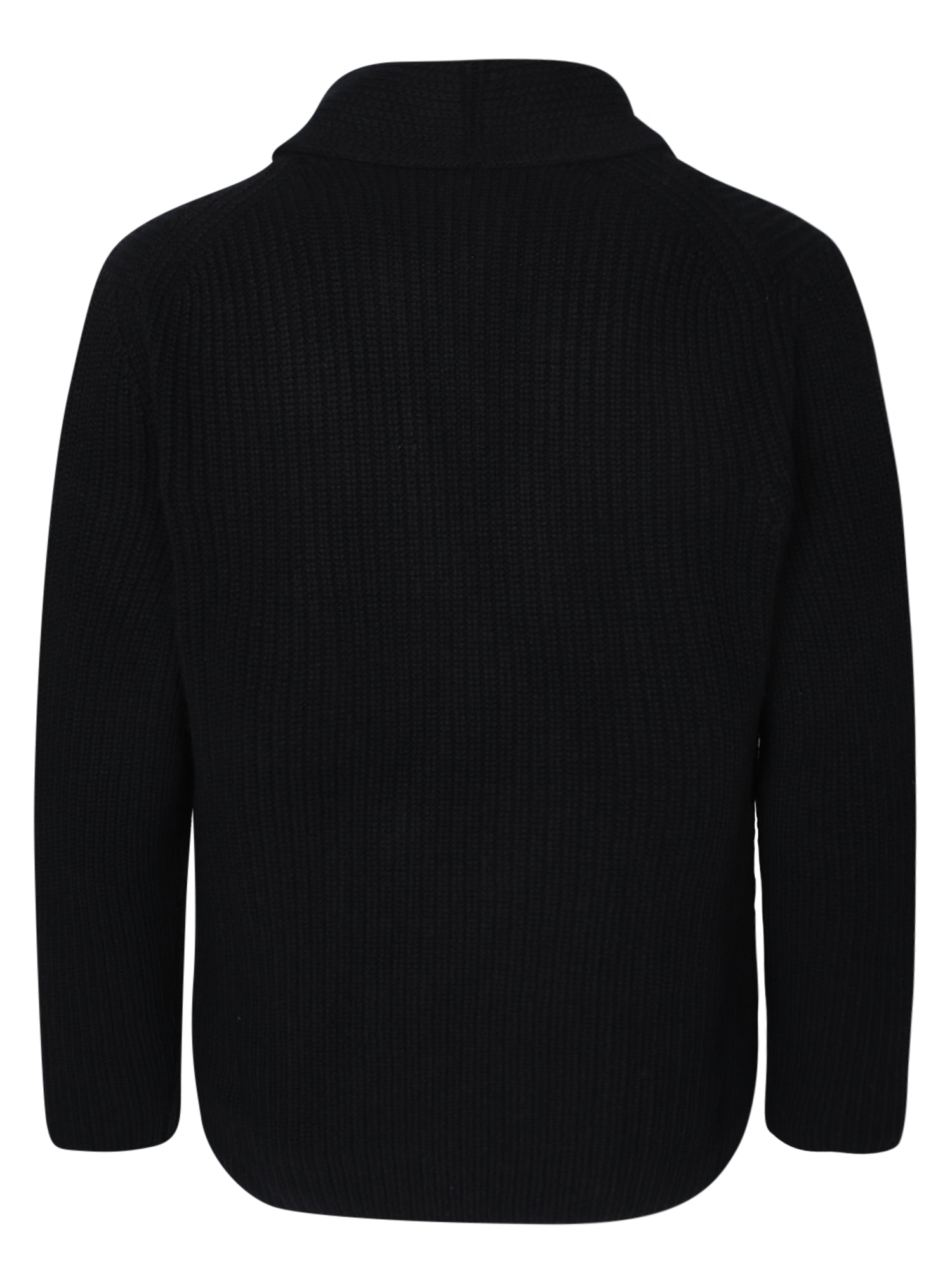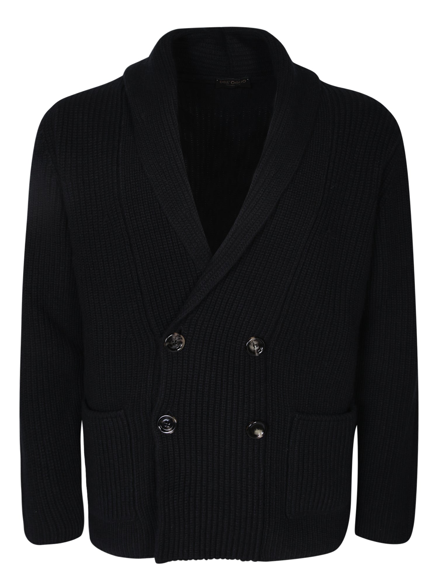 Shawl collar. Double-breasted. Front button fastening. Long sleeves. Two side patch pockets. Ribbed details. Knit construction. Tonal stitching. Straight hem. Color: black