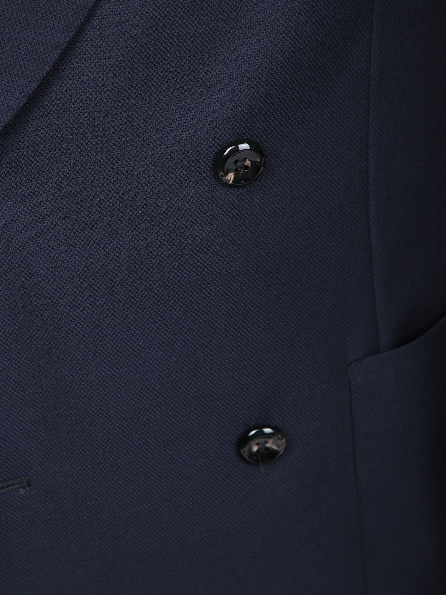 Double-breasted hopsack fabric jacket. Features classic lapels and front button closure.