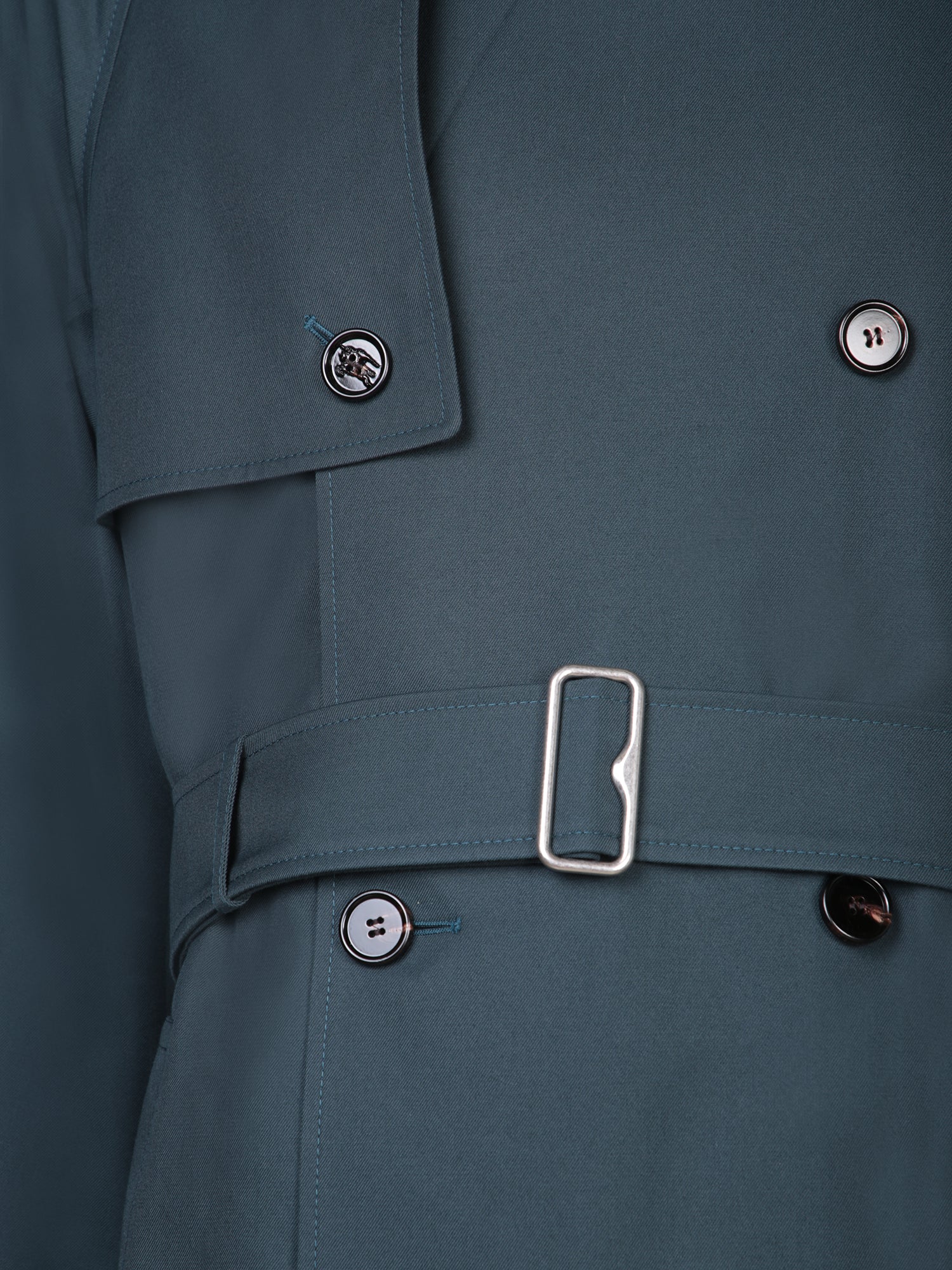 Double-breasted with adjustable belt. Hook-and-eye collar closure. Custom metal hardware.