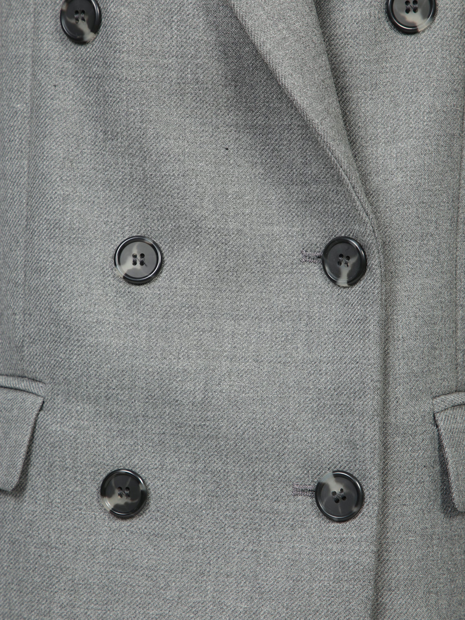 Double breasted jacket with visible buttons. Long sleeves with buttoned cuffs. Flap pocket. Internal lining.