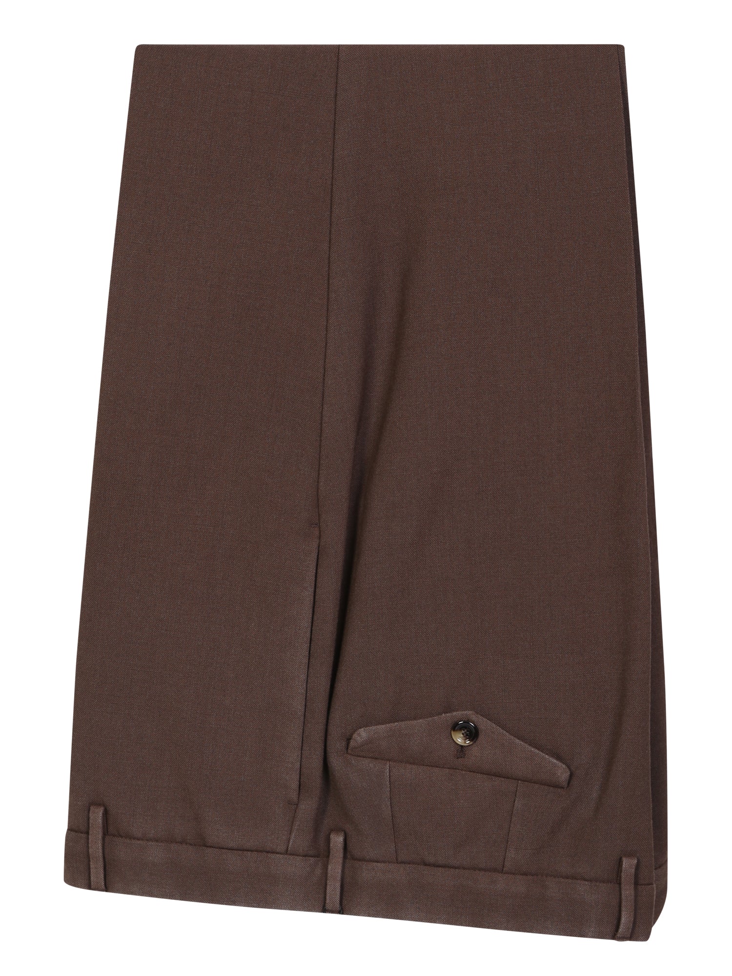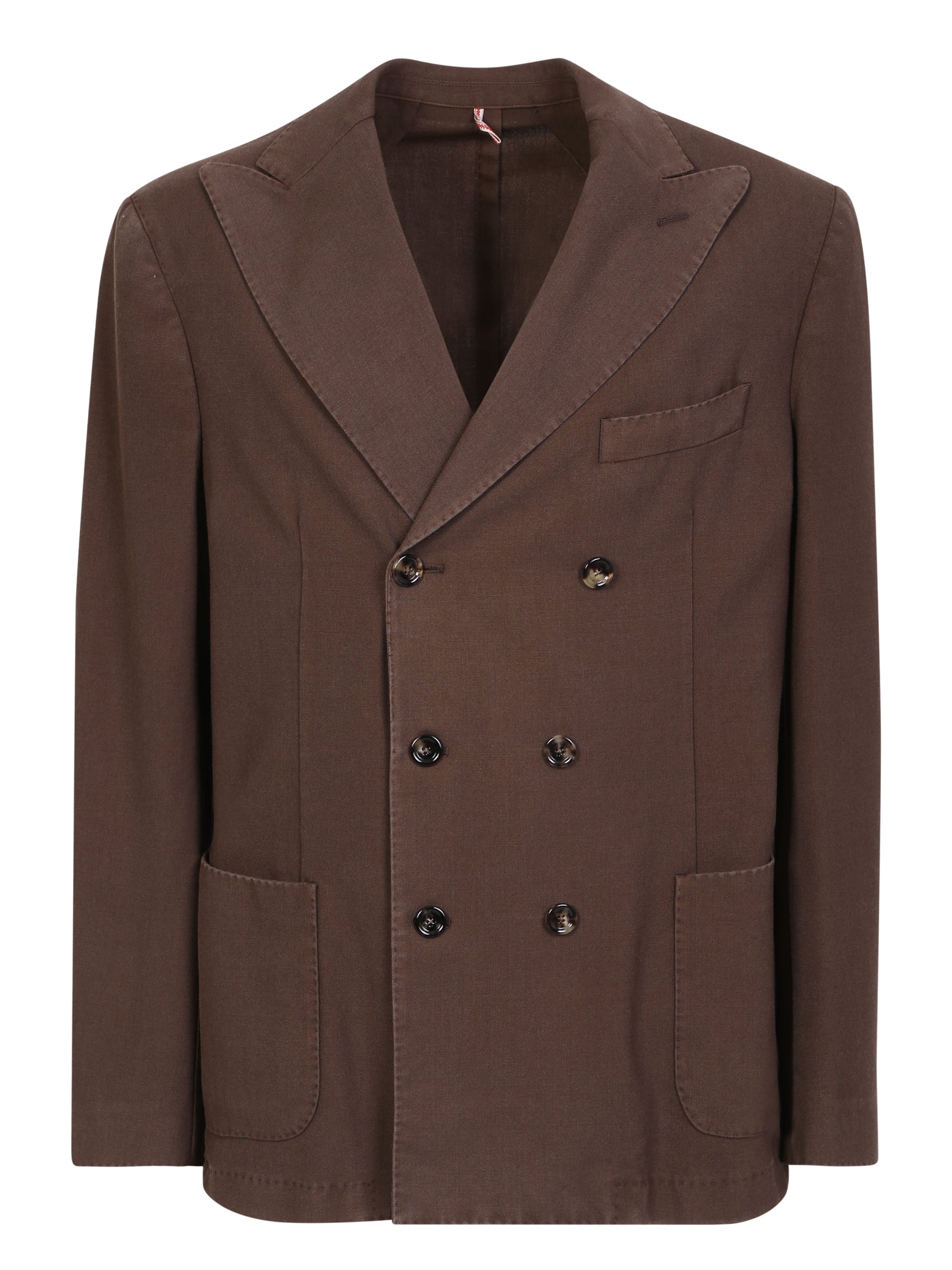 Notched collar. Long sleeves. Double-breasted button fastening. Chest welt pocket. Two front flap pockets. Straight hem. Regular waist. Two side welt pockets. Rear button pocket. Cropped. Color: brown