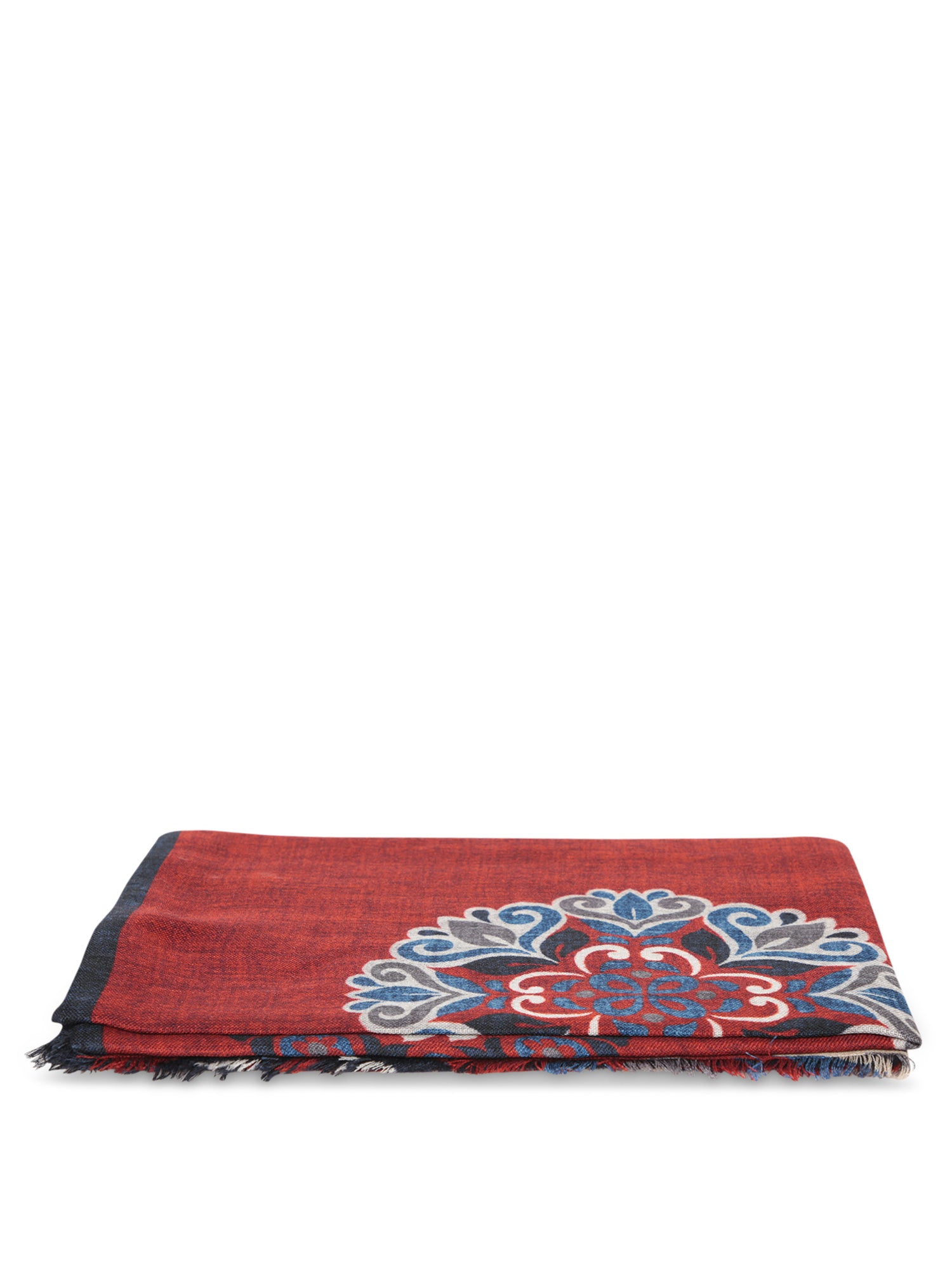 Explore refined elegance and warm comfort with the Dell'Oglio scarf, blending a bold red base with intricate multicolor decorative details in a design that captures attention.