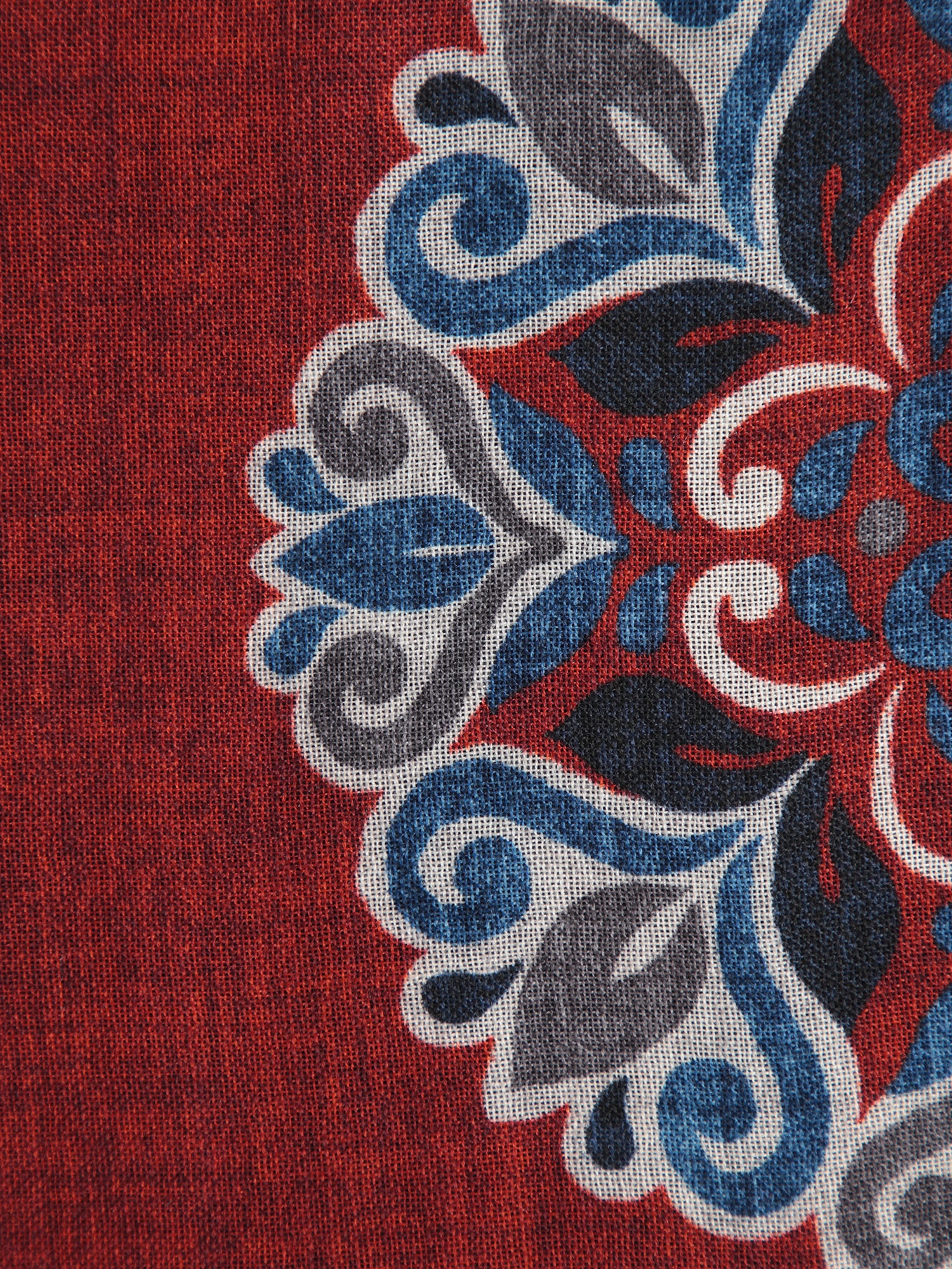 Fine wool scarf with fringe finish. Multicolor decorative pattern on a red base.