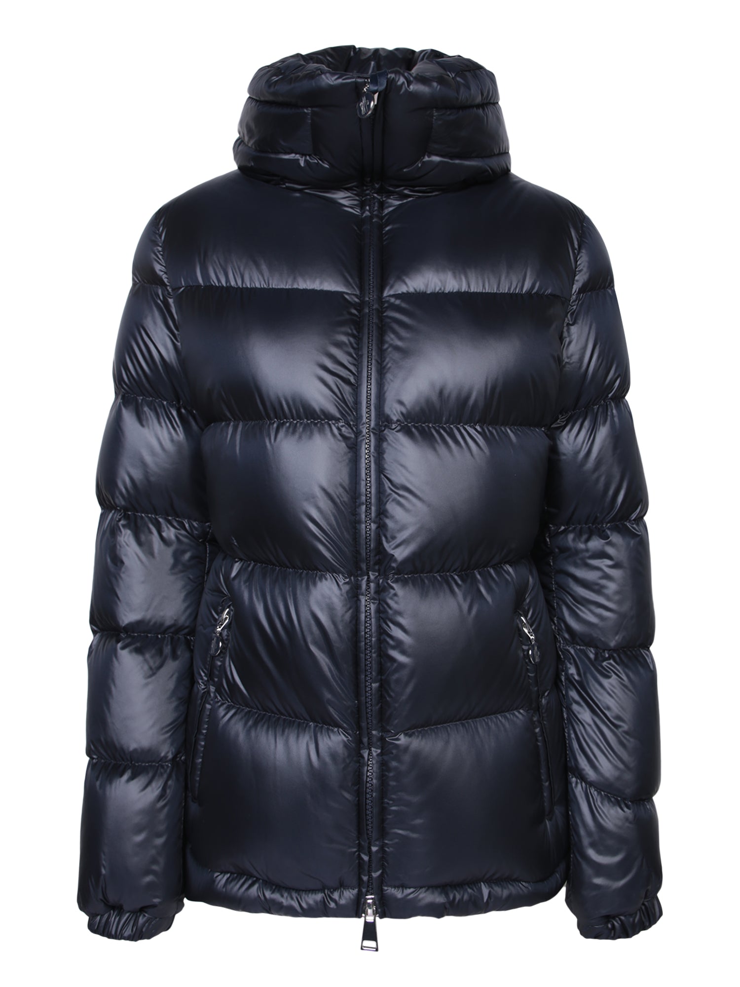 Bulky down jacket with padded hood, front zip closure, and side zip pockets.