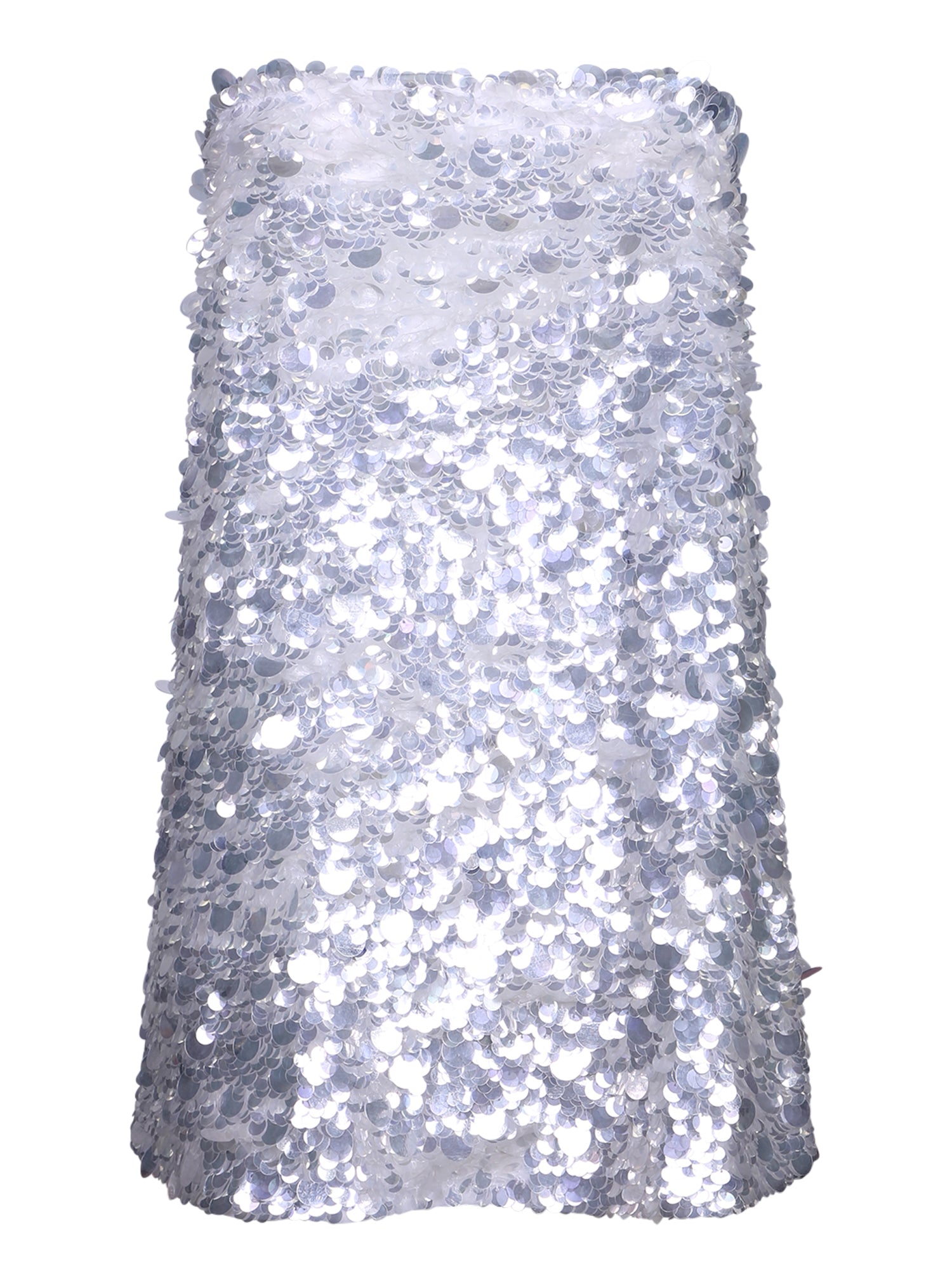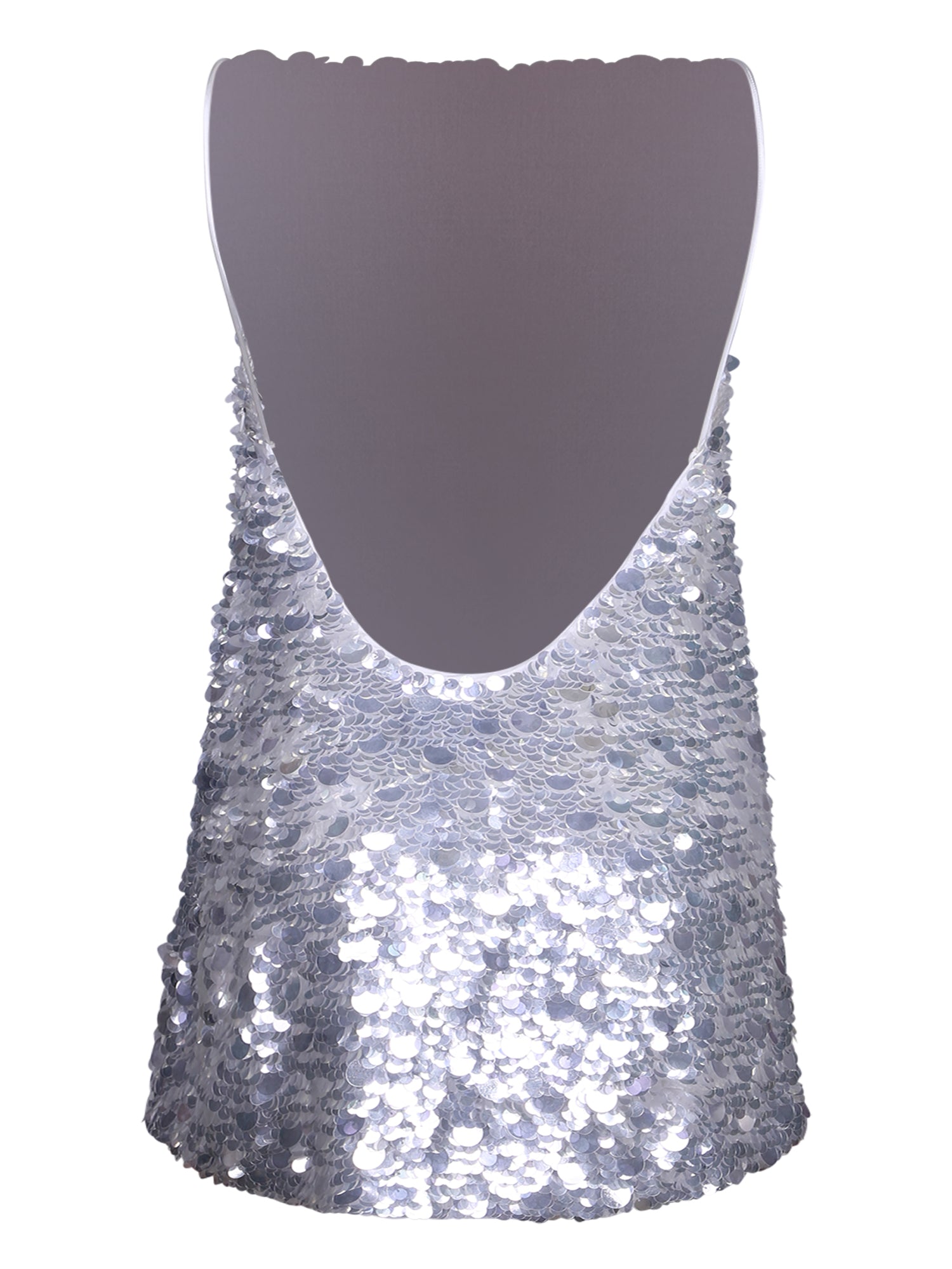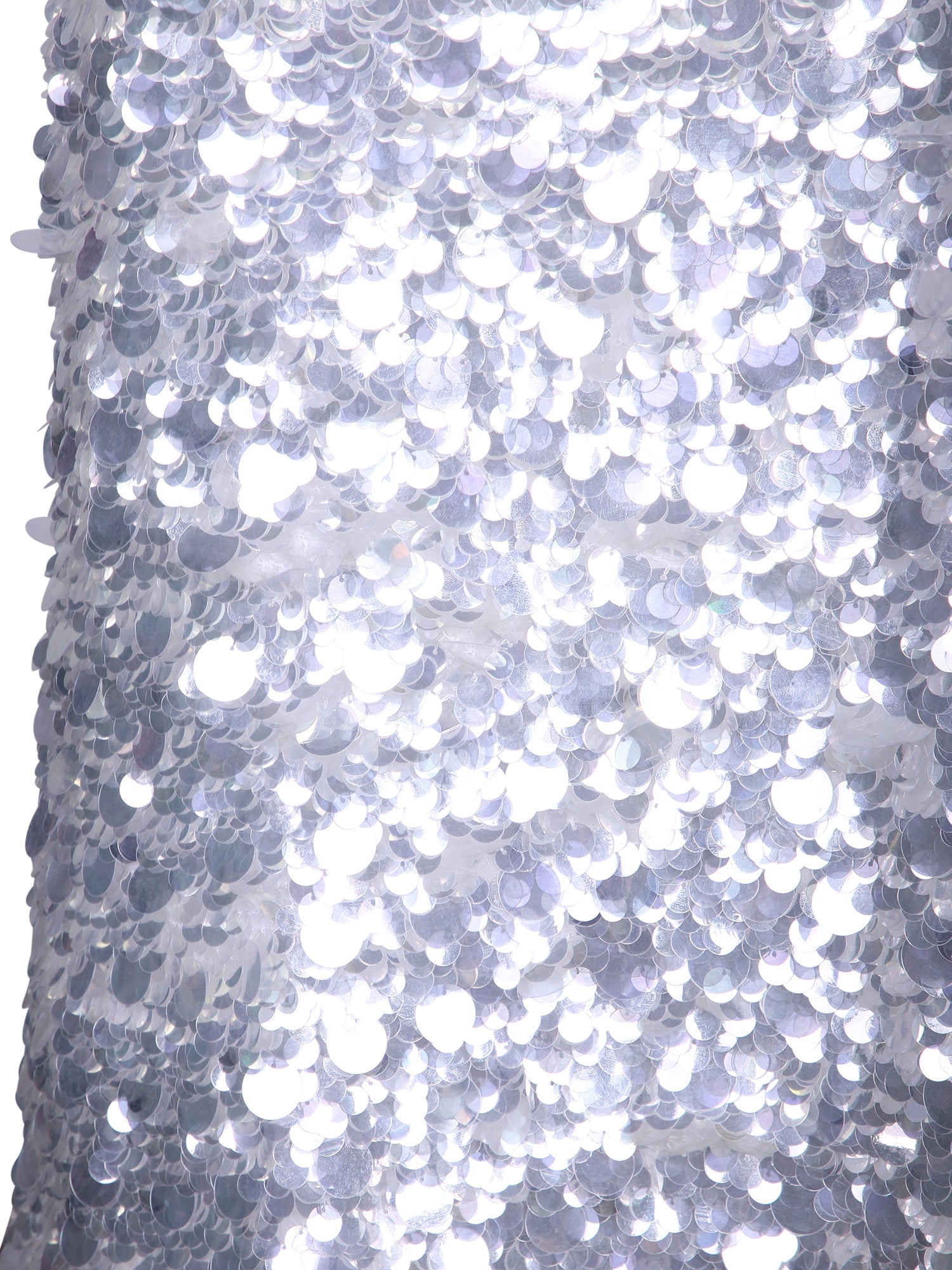 Sleeveless dress. Fully covered with silver sequins. Sheath structure.