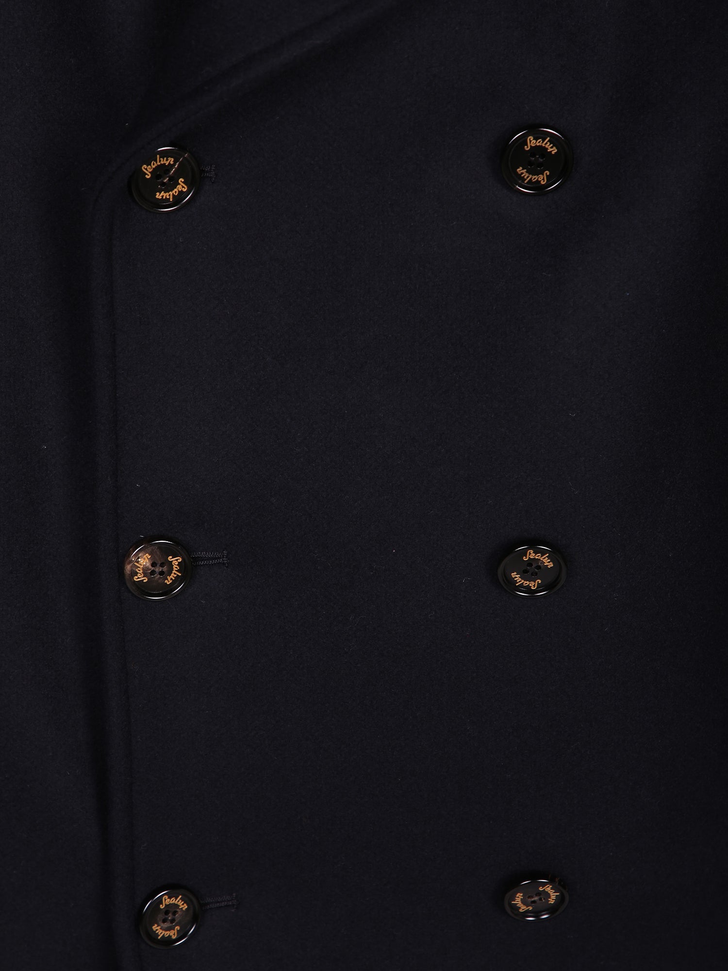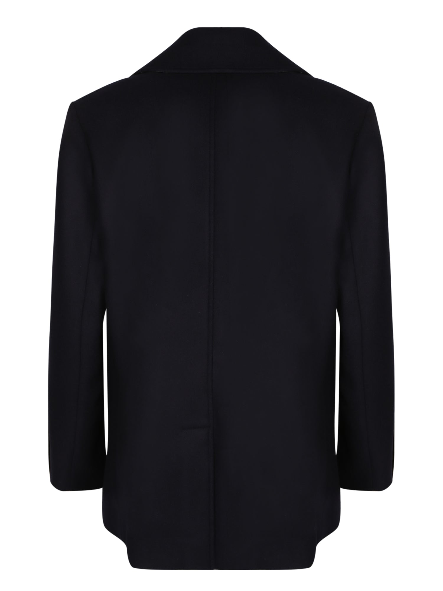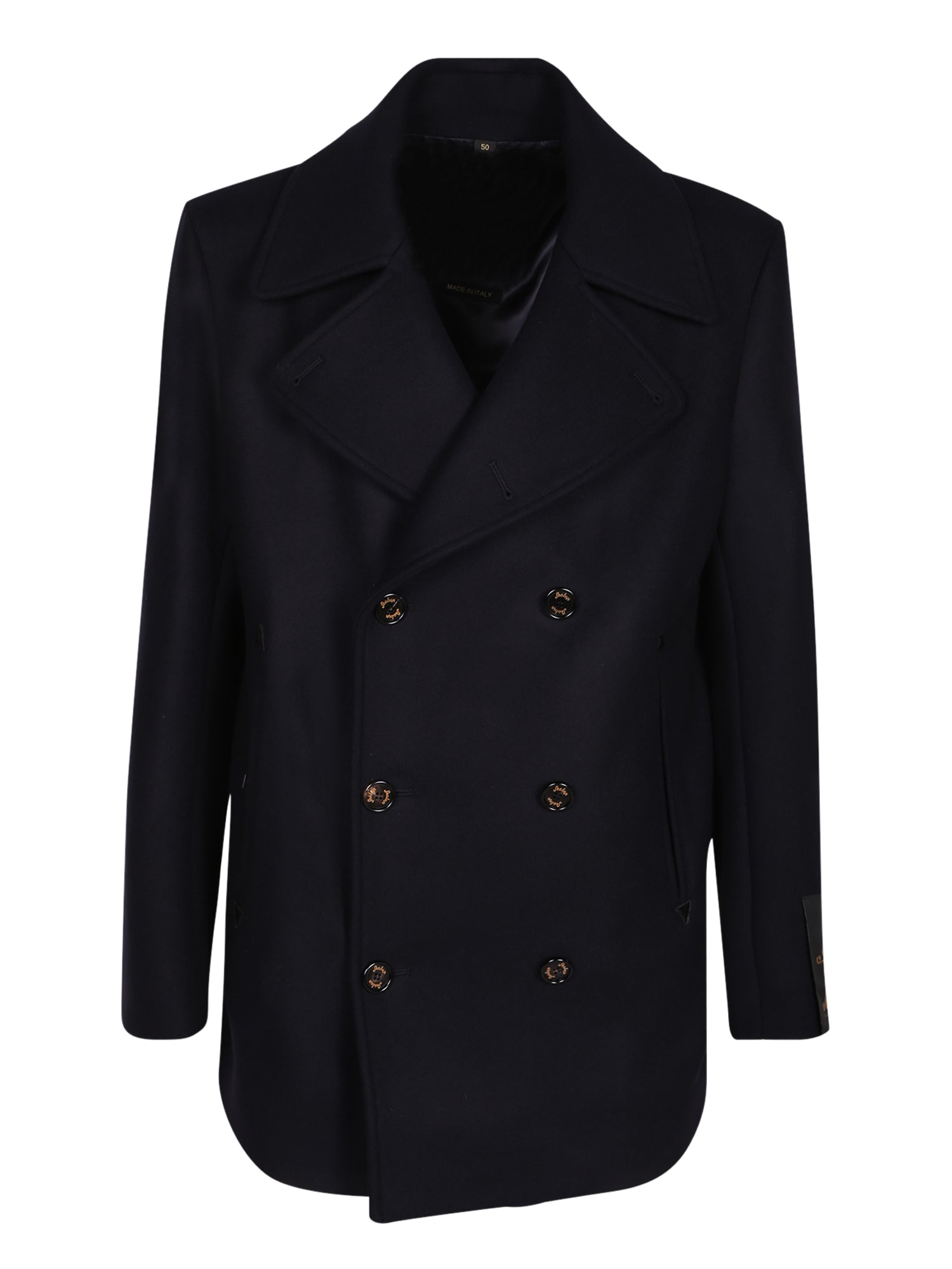 Wool peacoat with leather details. Double-breasted with golden buttons. Wide collar.