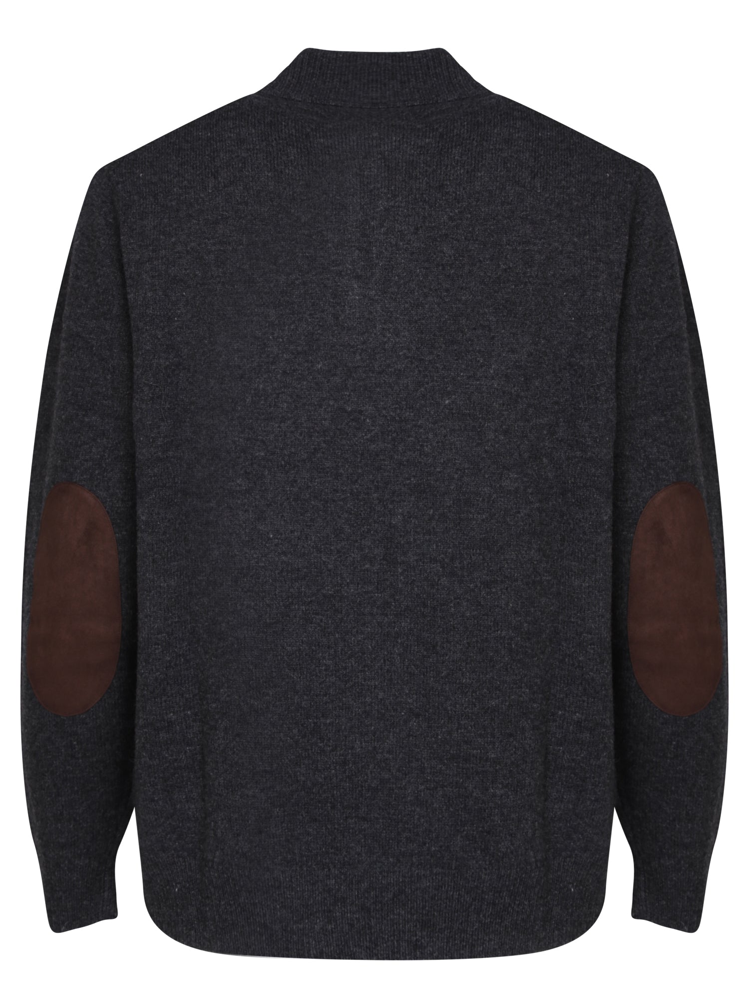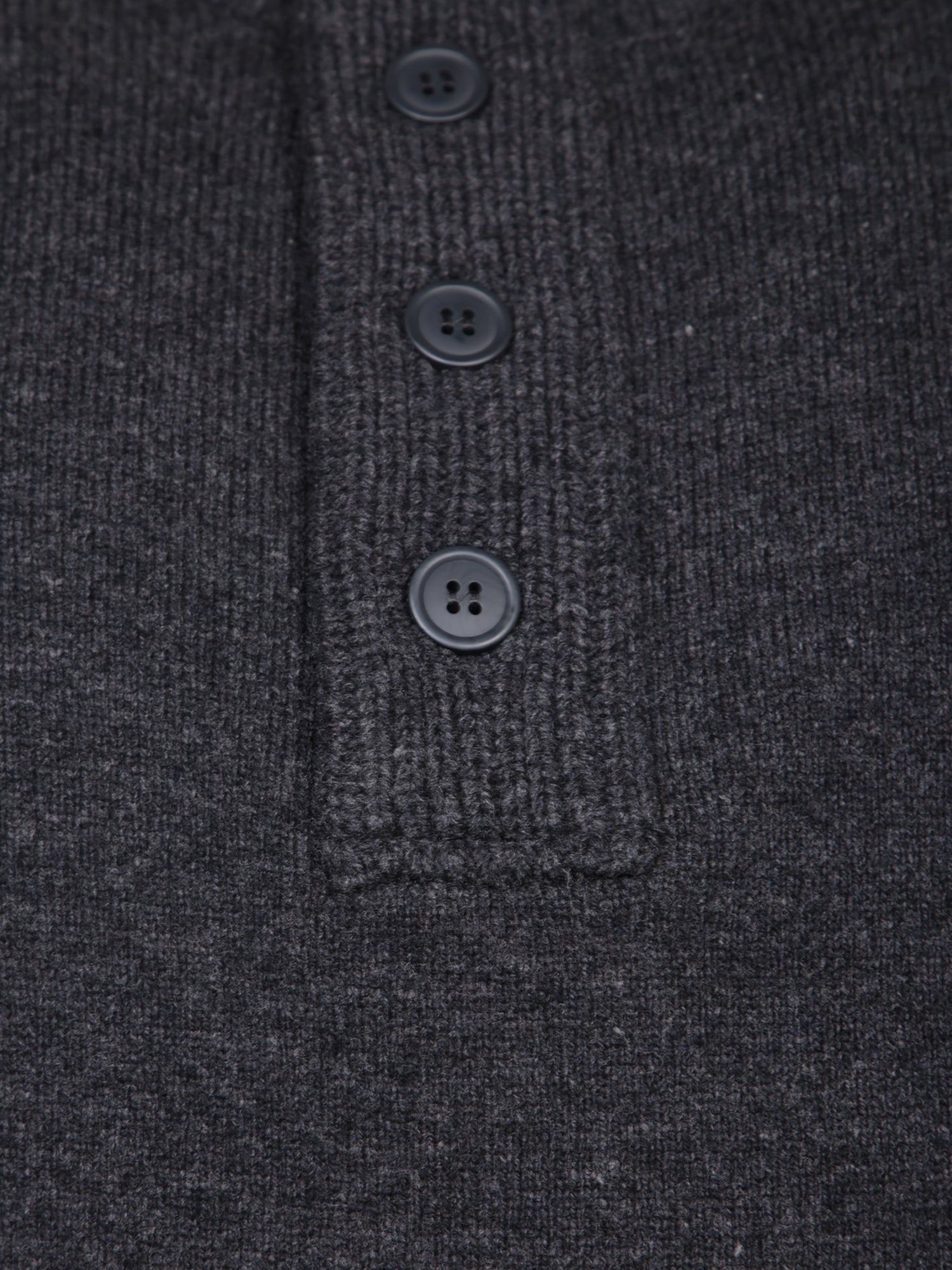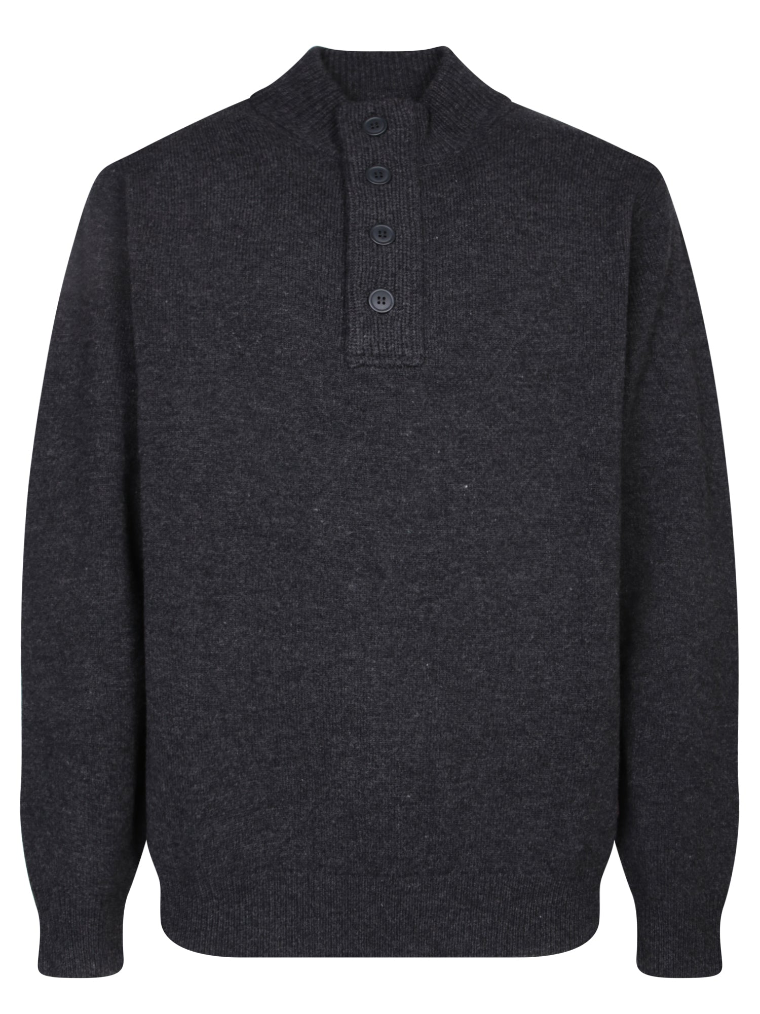 Long sleeve grey knit sweater. High neck with half-zip closure. Ribbed cuffs and hem.