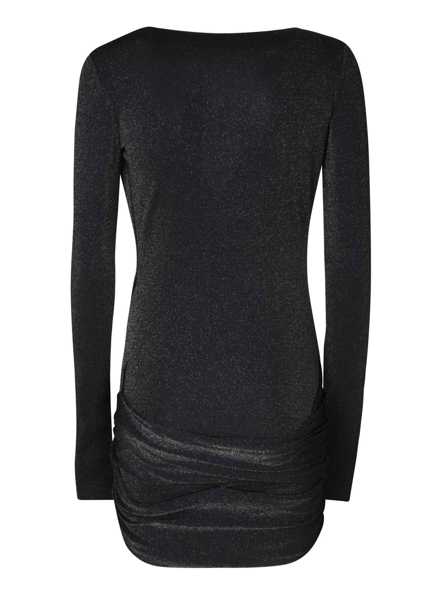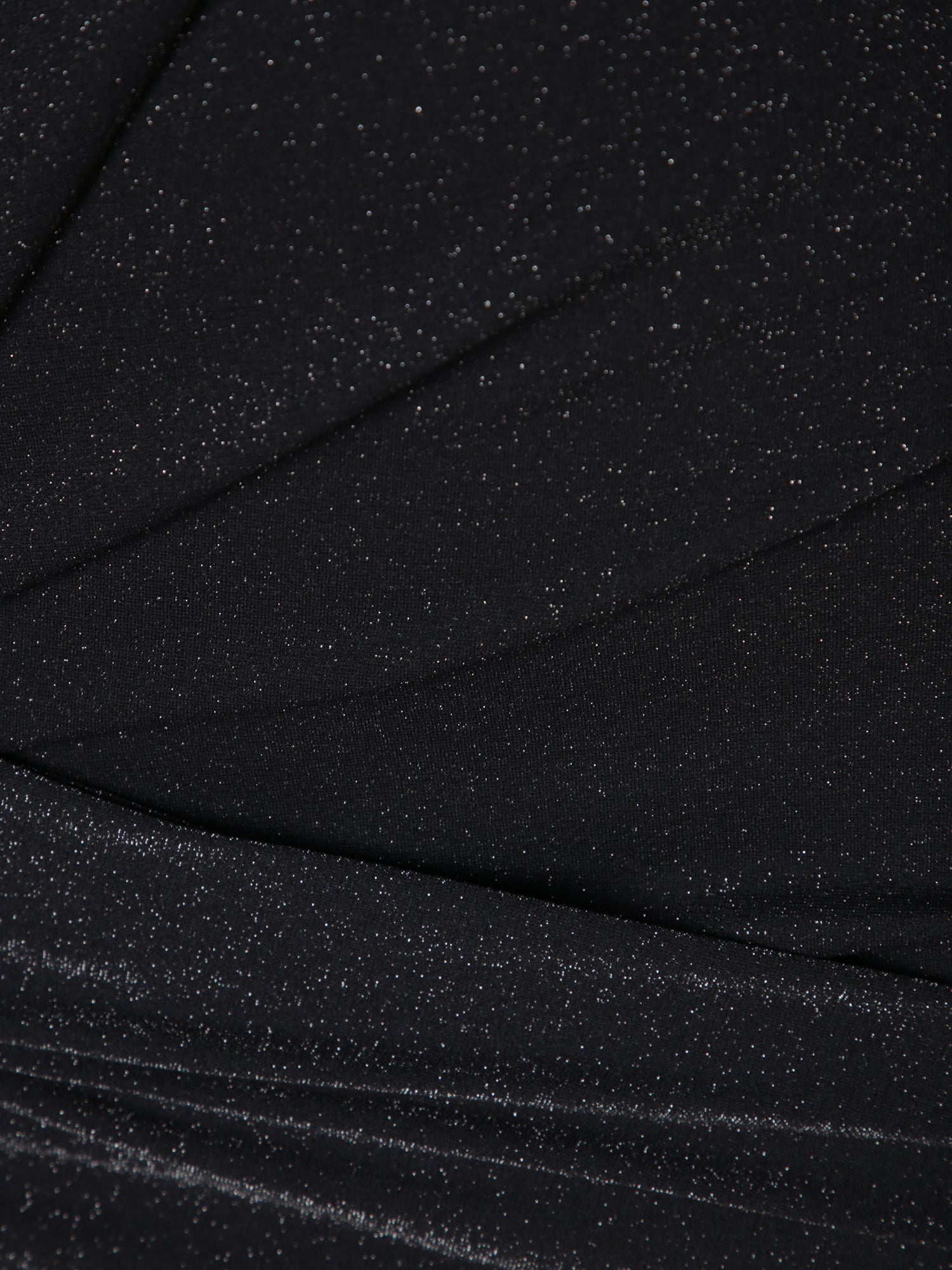 Long-sleeved dress with crossover V-neckline. Shiny black lurex fabric with draped details.