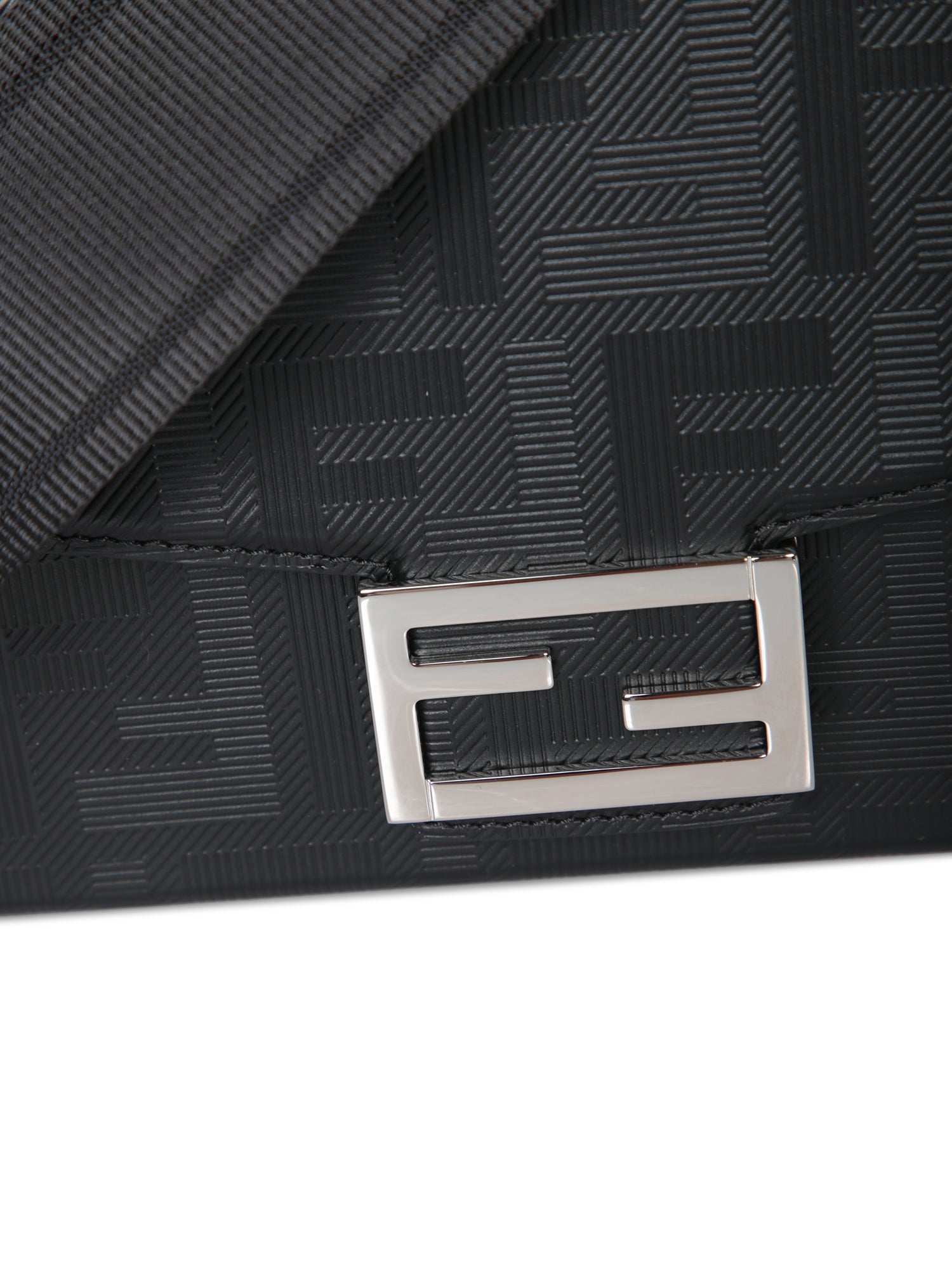 An icon of urban elegance, this Fendi Baguette features a sophisticated adjustable fabric strap, highlighted by an all-over monogram pattern that defines the brand's luxurious design.