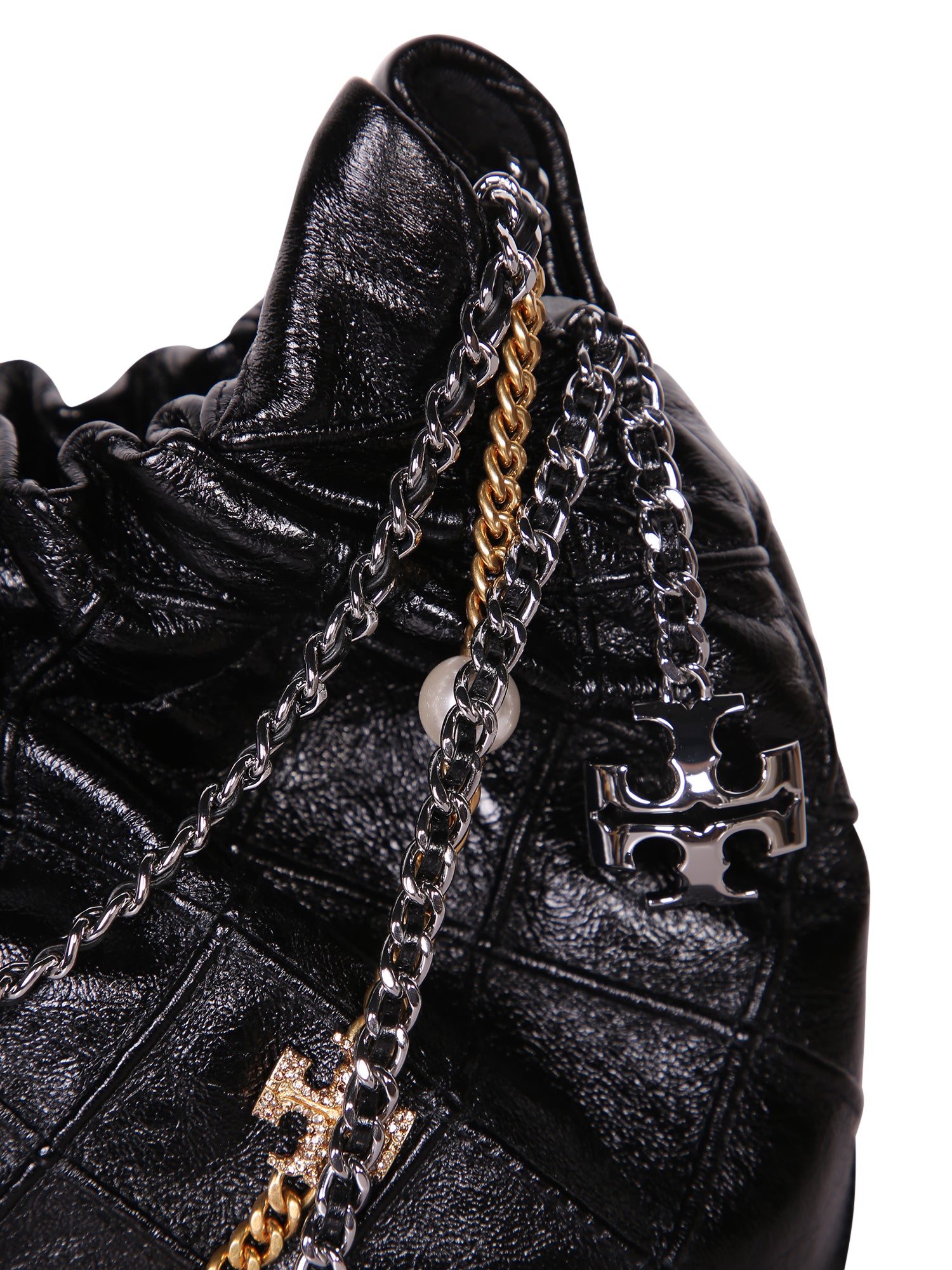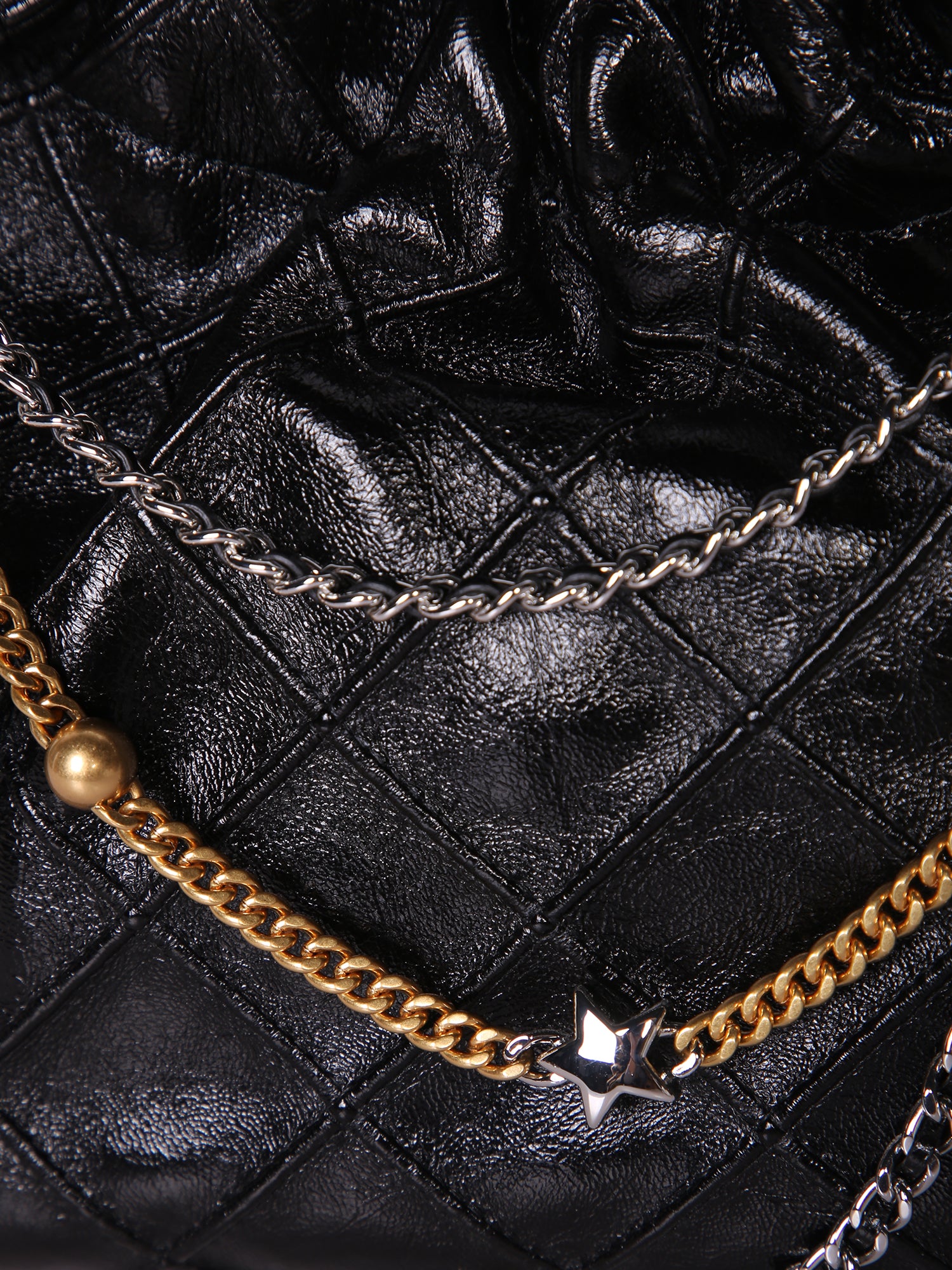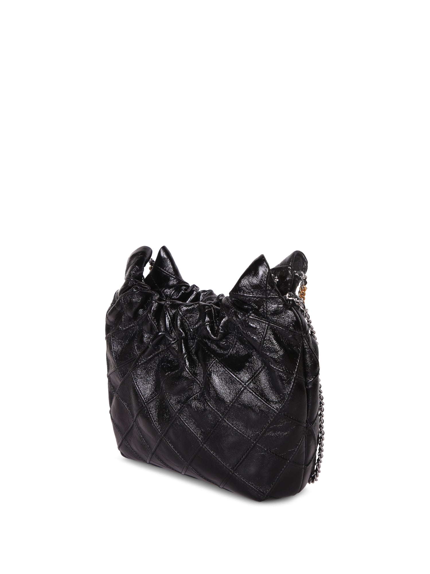 Quilted leather bag with decorative chain and brand logo.