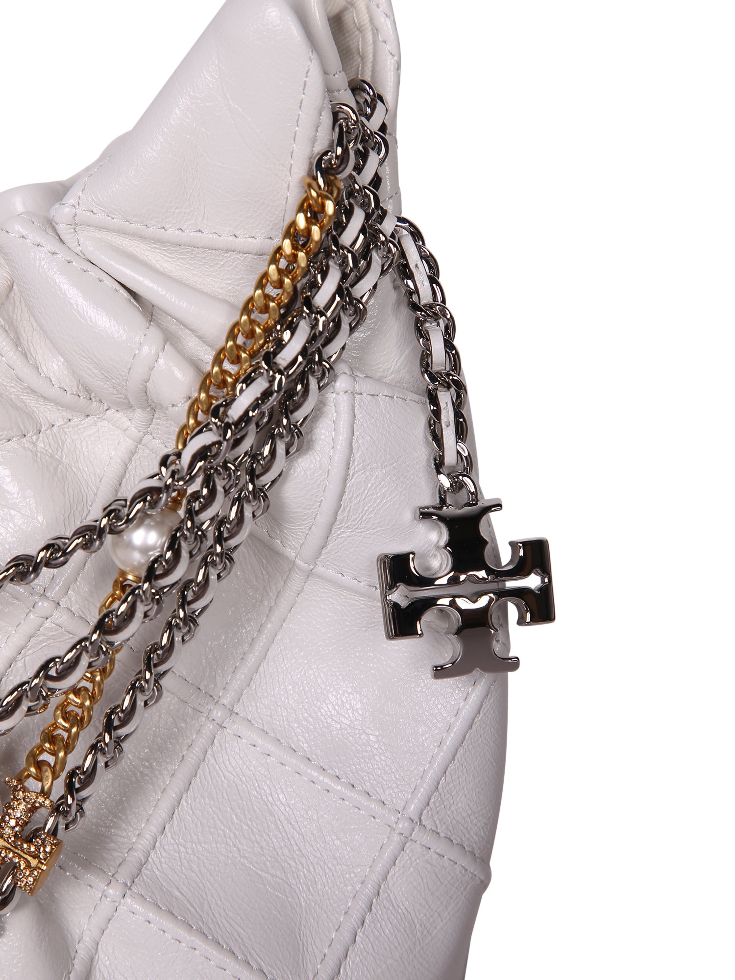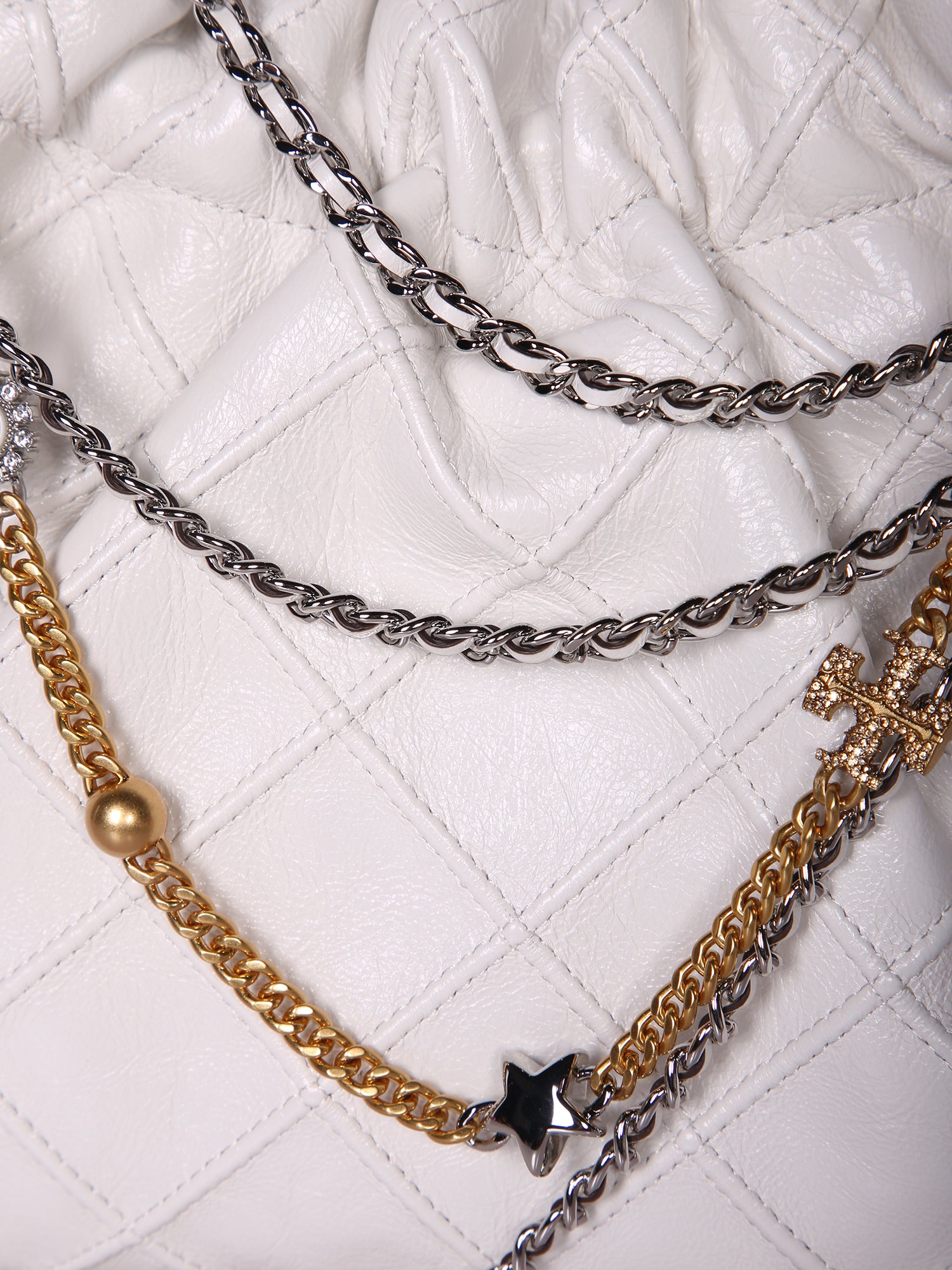Quilted white leather bag. Mixed metal decorative chain. Magnetic closure.