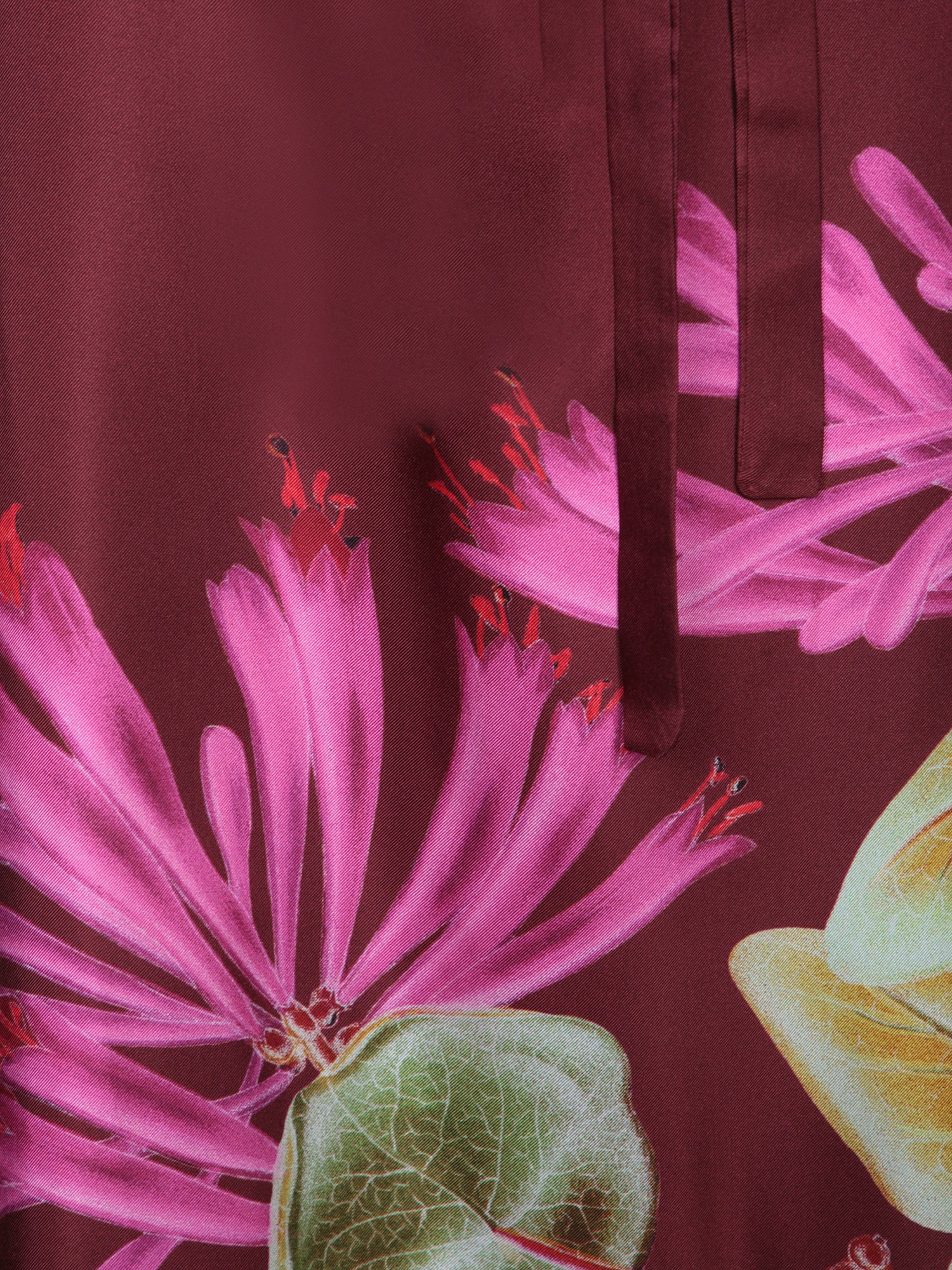 The Pierre-Louis Mascia burgundy long dress is embellished with a vibrant floral pattern. Designed for a refined silhouette, it features a fabric belt that highlights the waist and a rounded neckline adding a touch of elegance.