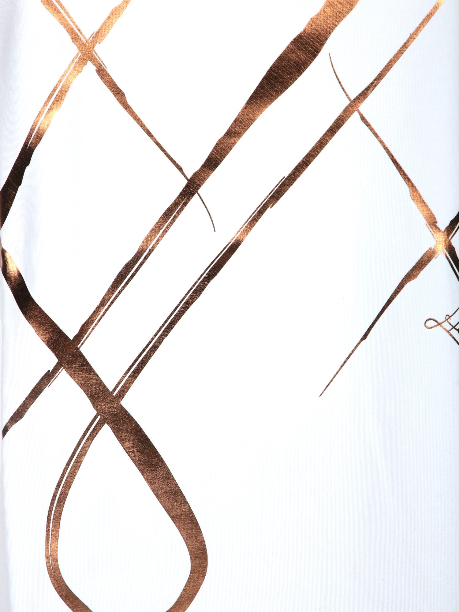 Short sleeves. Artistic foil print in bronze shades. Crew neck.