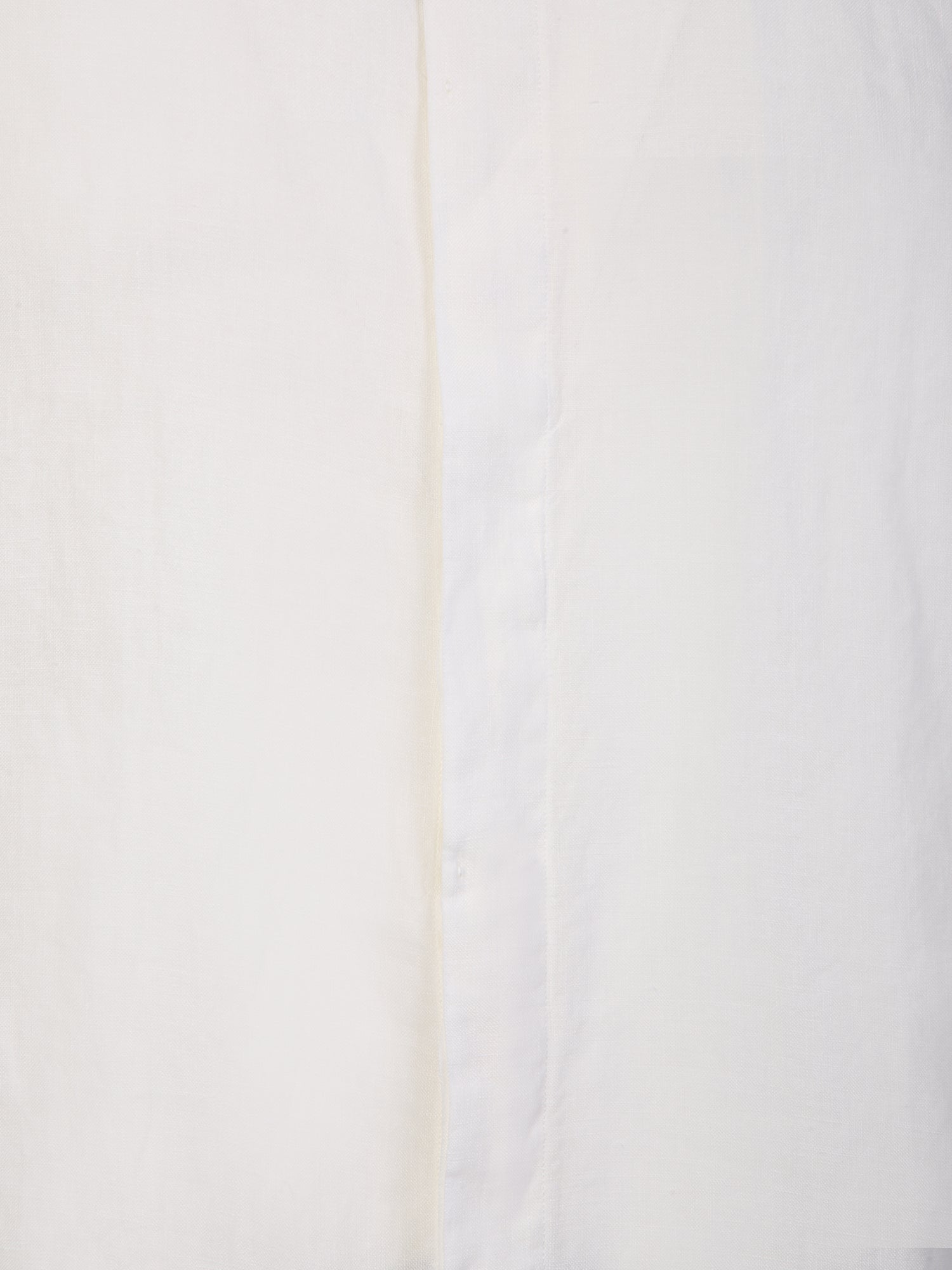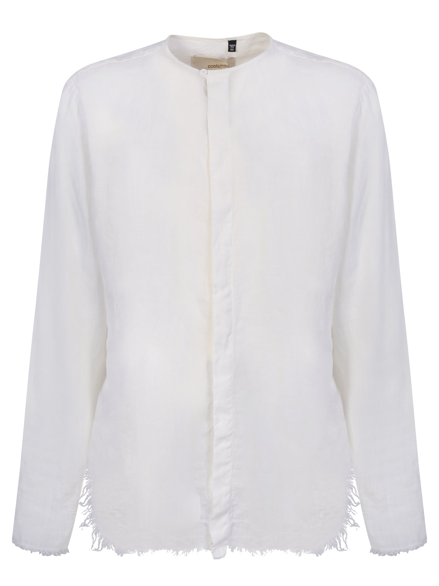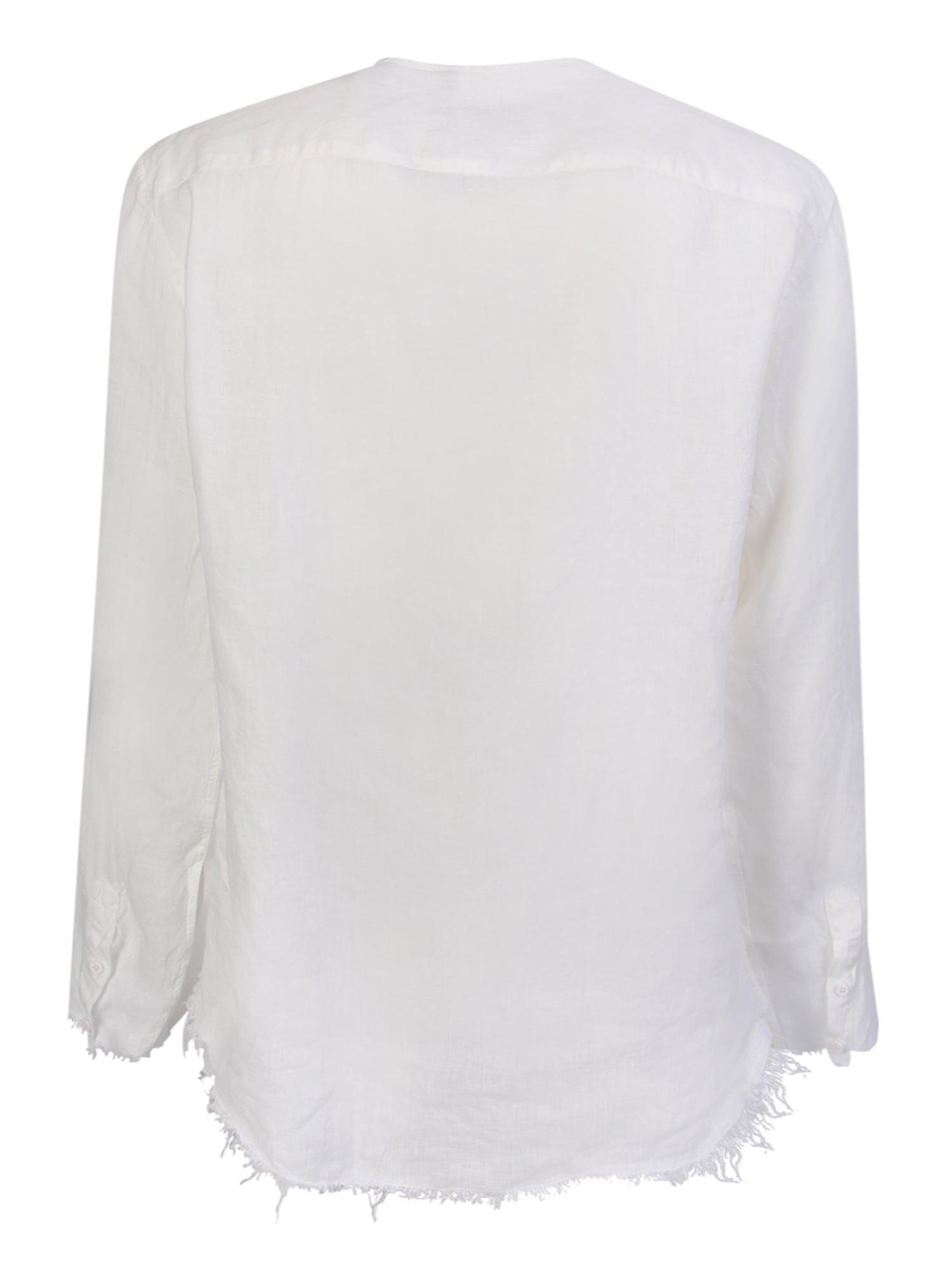 Mandarin collar. Front button fastening. Long sleeves. Buttoned cuffs. Frayed edge. Tone-on-tone stitching. Color: white