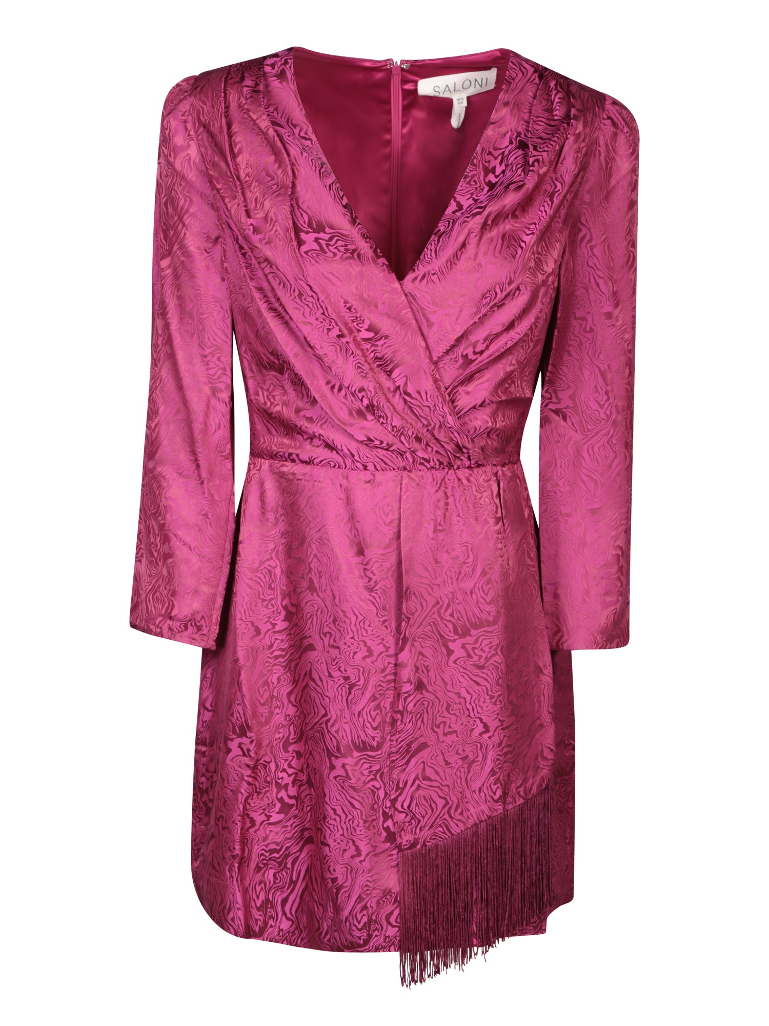 The SALONI dress exudes sophistication with its wrap design and fringed details that add a playful touch. Perfect for the modern woman who values elegance and uniqueness.