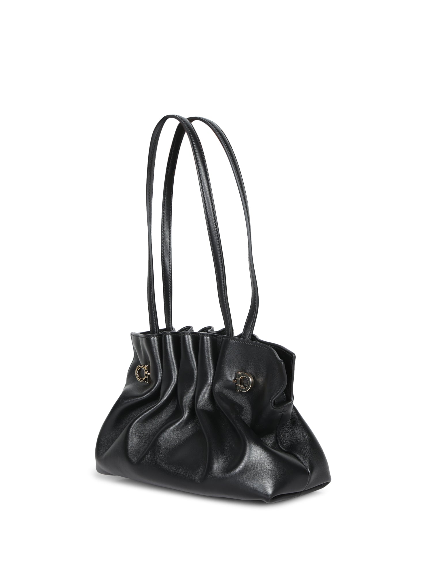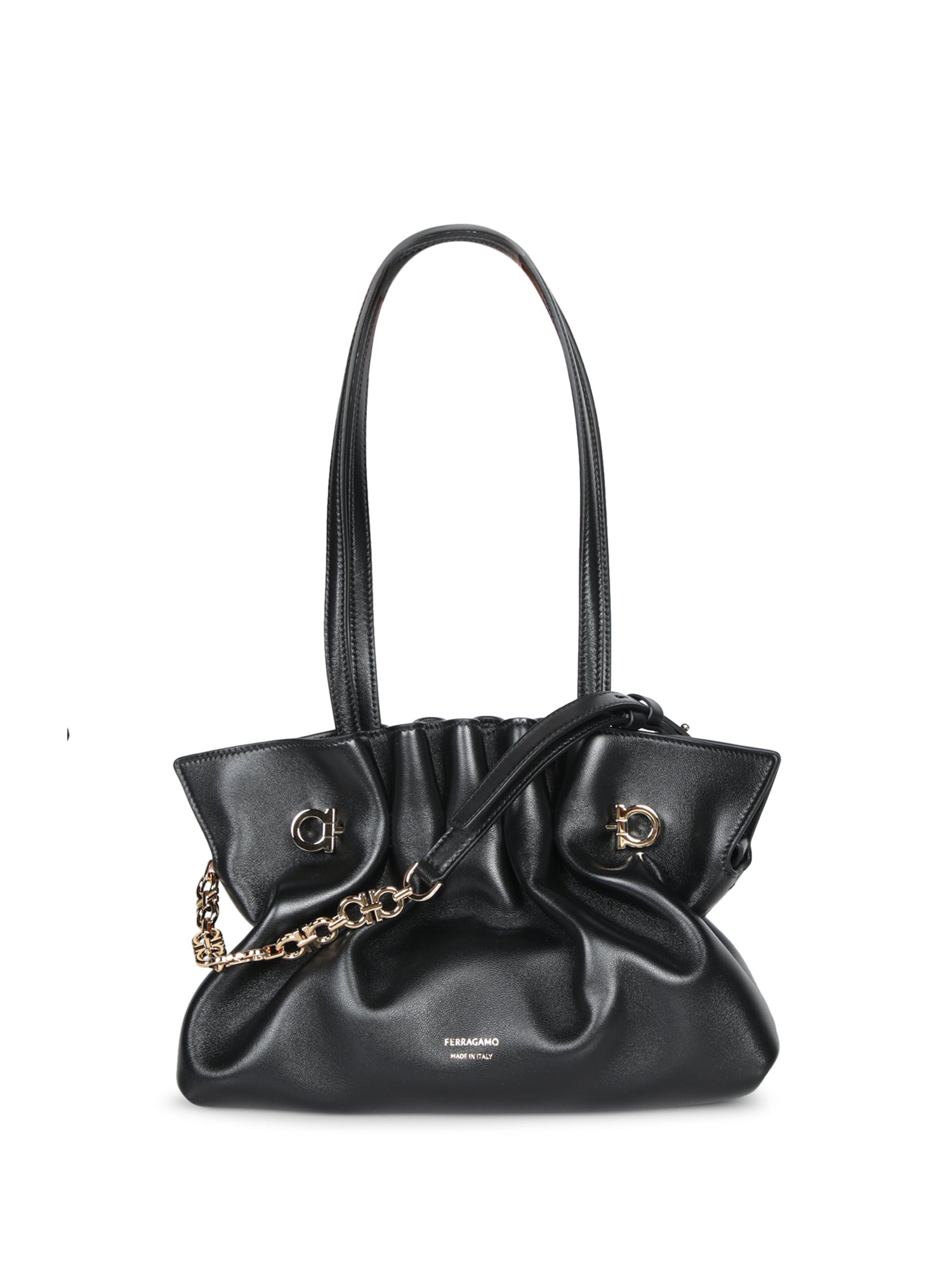 Black leather bag. Golden metallic details. Gancini closure.