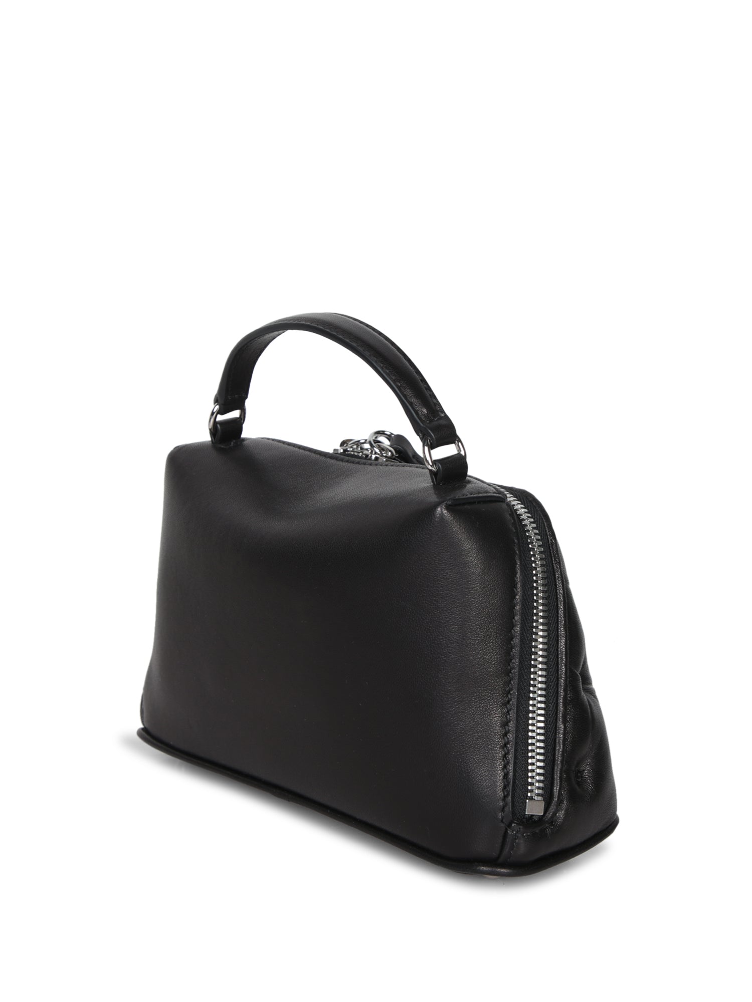 Quilted leather bag. Top handle and adjustable shoulder strap. Zip closure.