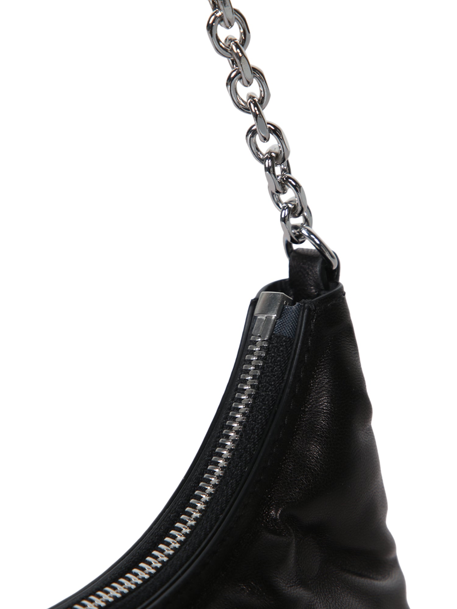 Soft leather bag with chain strap. Top zip closure. Fabric logo label.