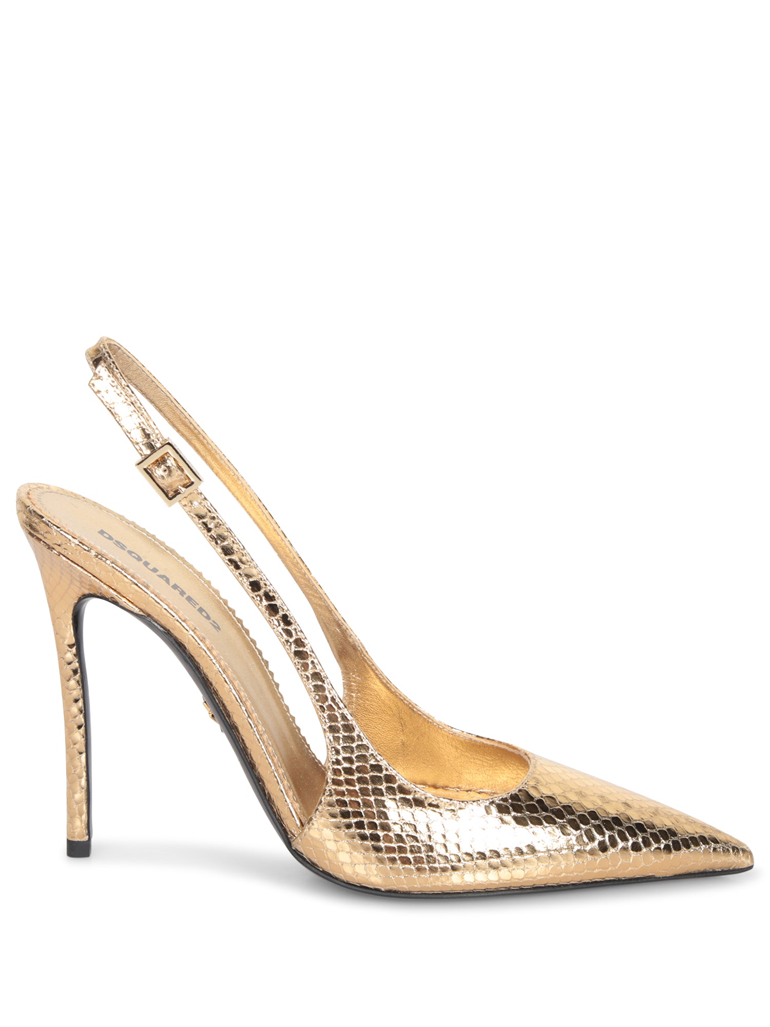 Slim high heel. Adjustable ankle strap with buckle. Pointed toe.