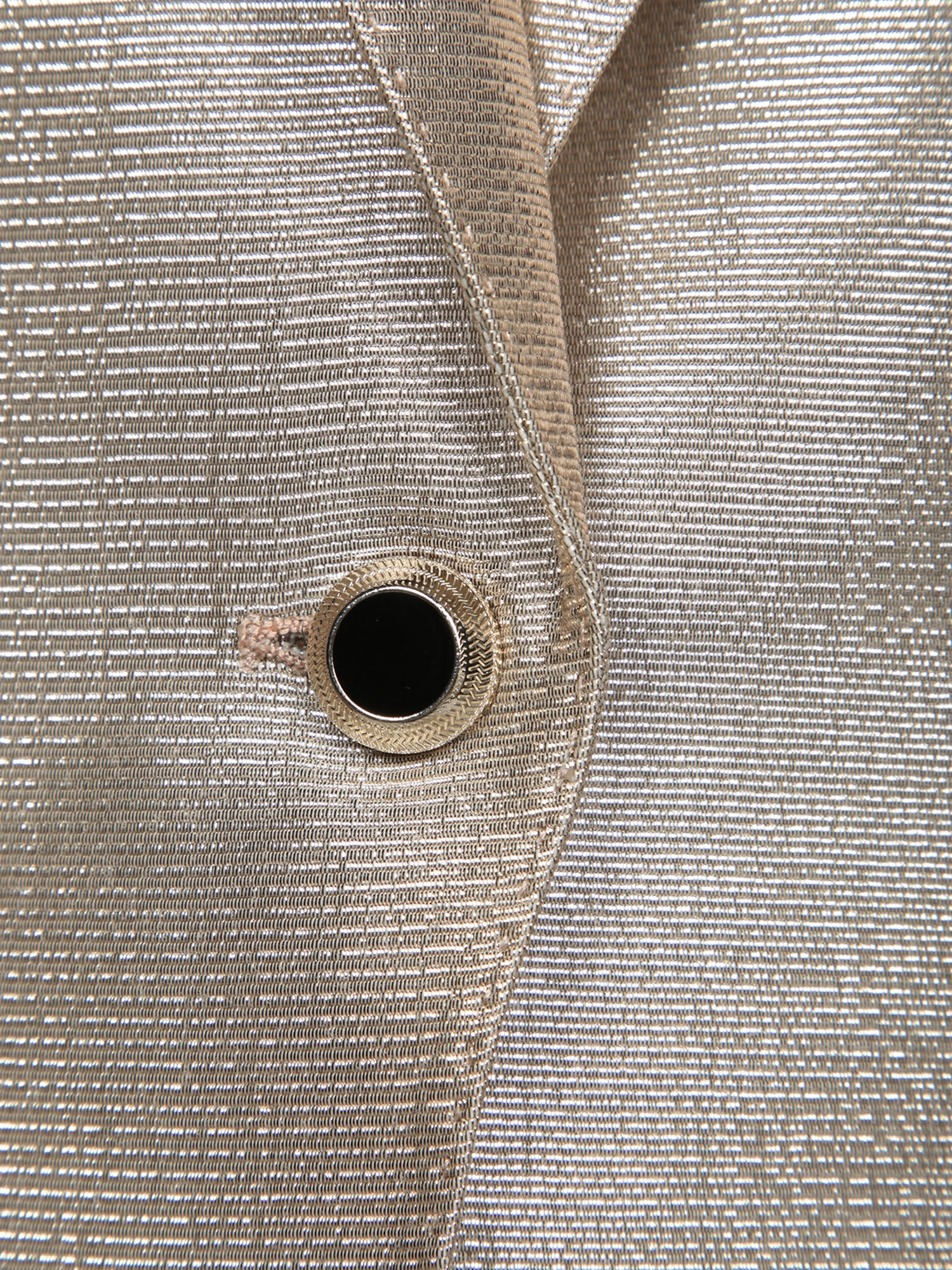 Monochrome jacket in gold lurex wool fabric. Features a classic lapel, single-button closure, and flap pockets.